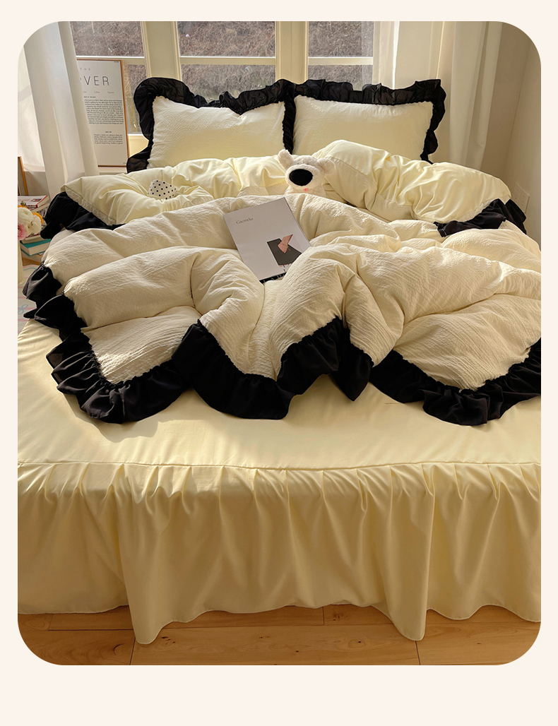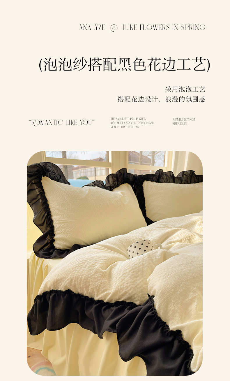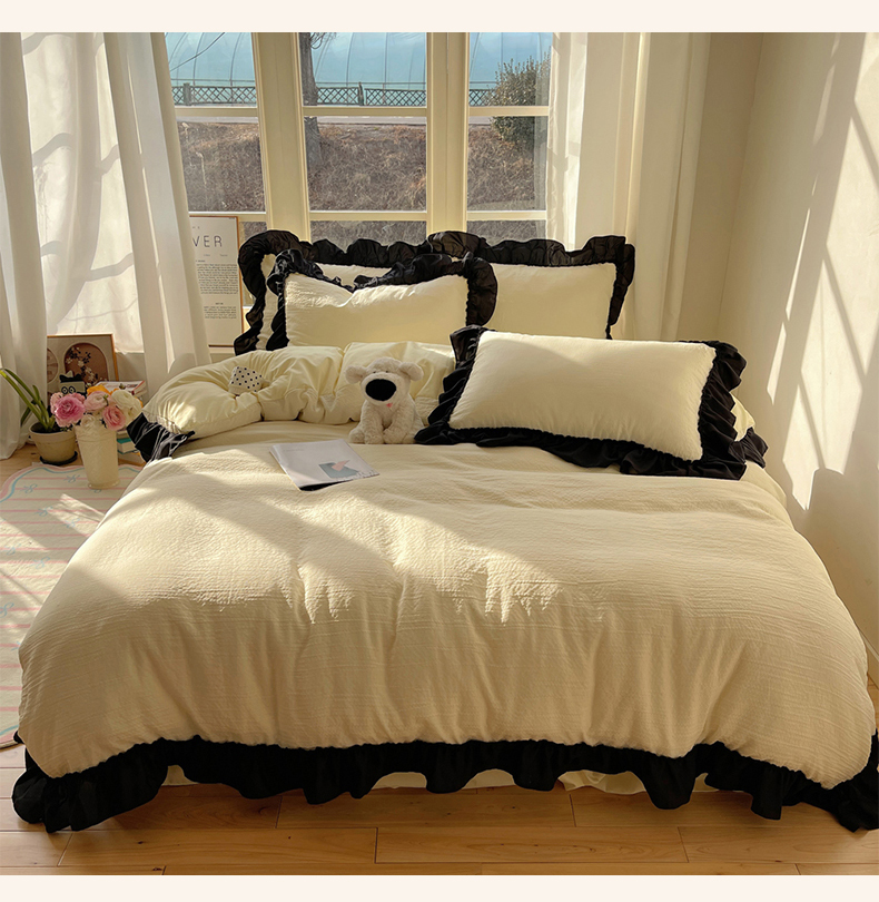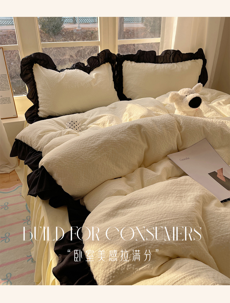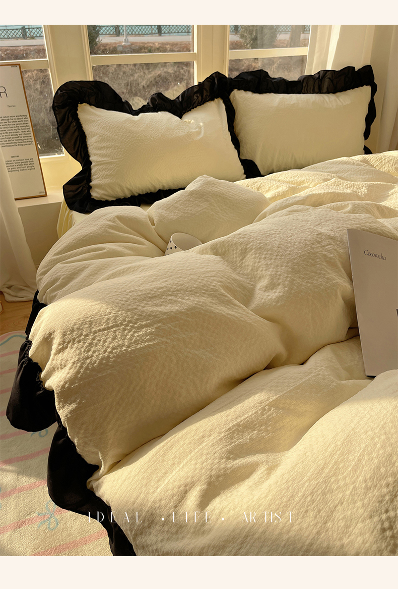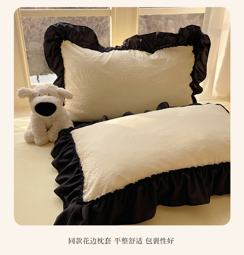 当前位置: 91家纺网 > 商品网购 > 床品套件 > 四件套 > 化纤普通四件套 > (总)韩都家居 2025新款韩版法式黑花边泡泡棉四件套-初味(包含买家秀)