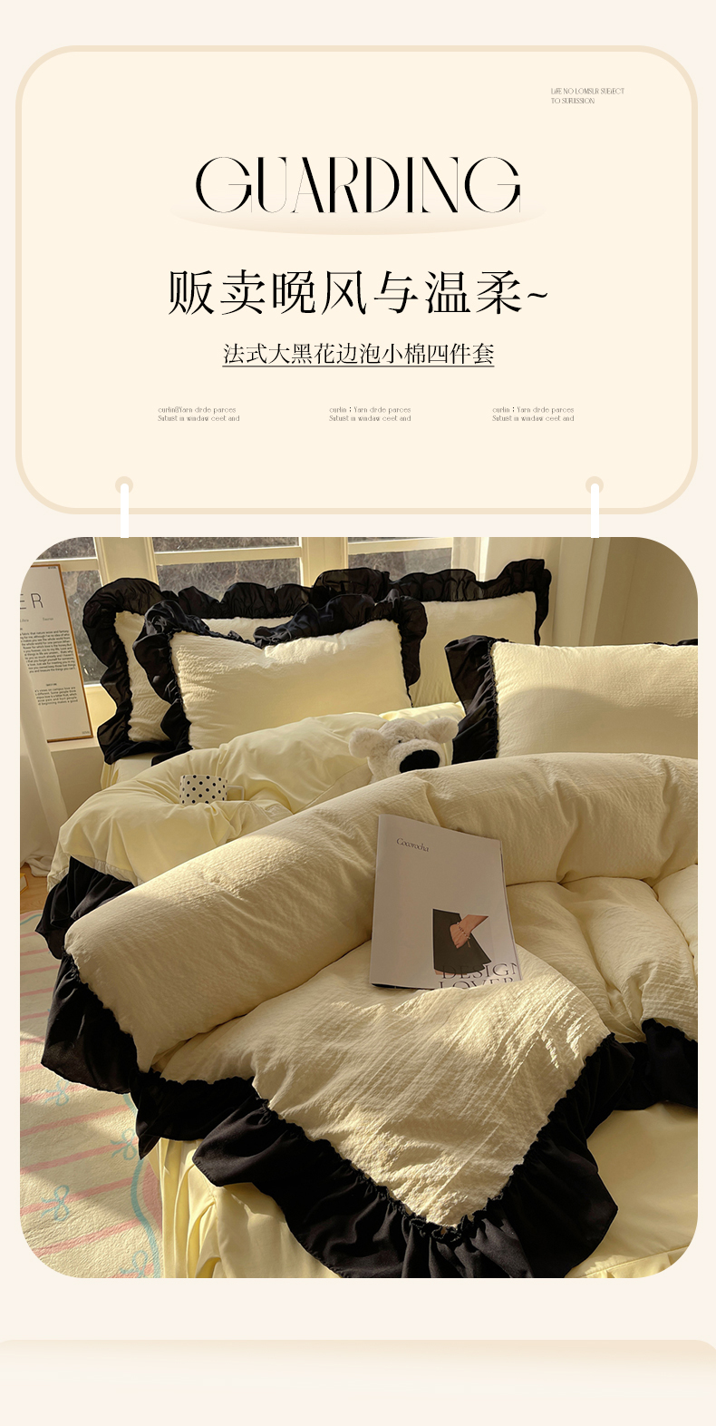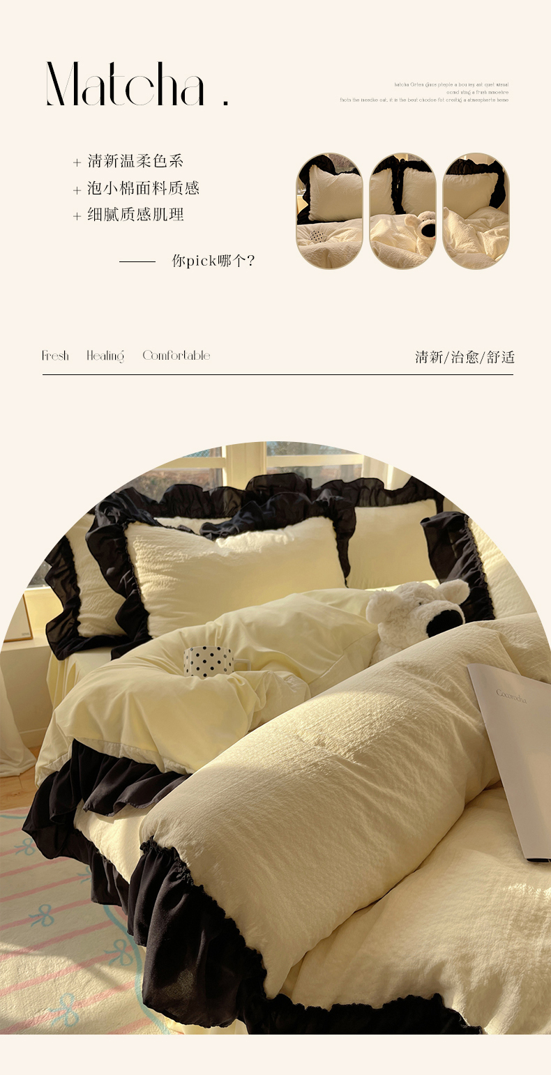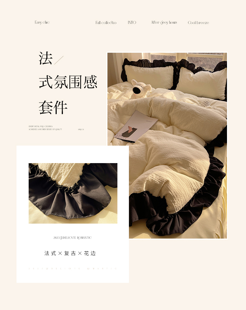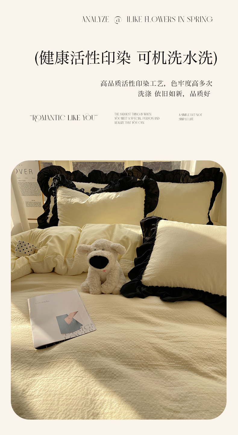 当前位置: 91家纺网 > 商品网购 > 床品套件 > 四件套 > 化纤普通四件套 > (总)韩都家居 2025新款韩版法式黑花边泡泡棉四件套-初味(包含买家秀)