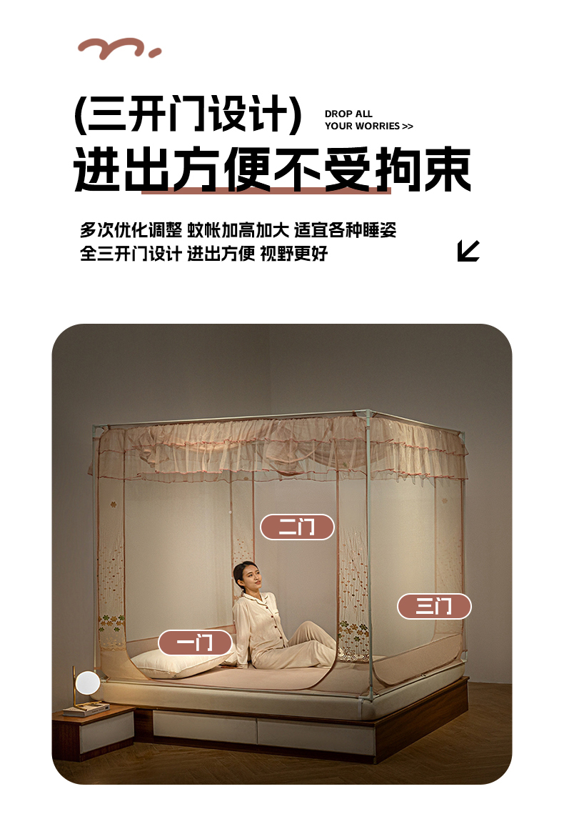 (总)飞轮海蚊帐 2023新款三开门落地遮光蚊帐-L-93,高级灰,芥末绿,奶油黄,香槟