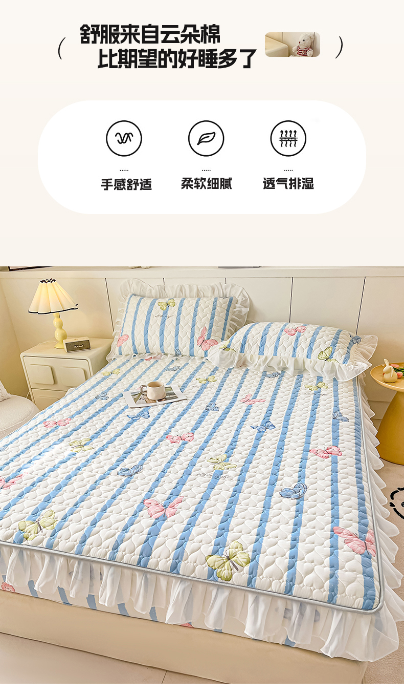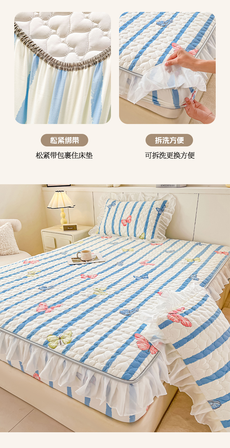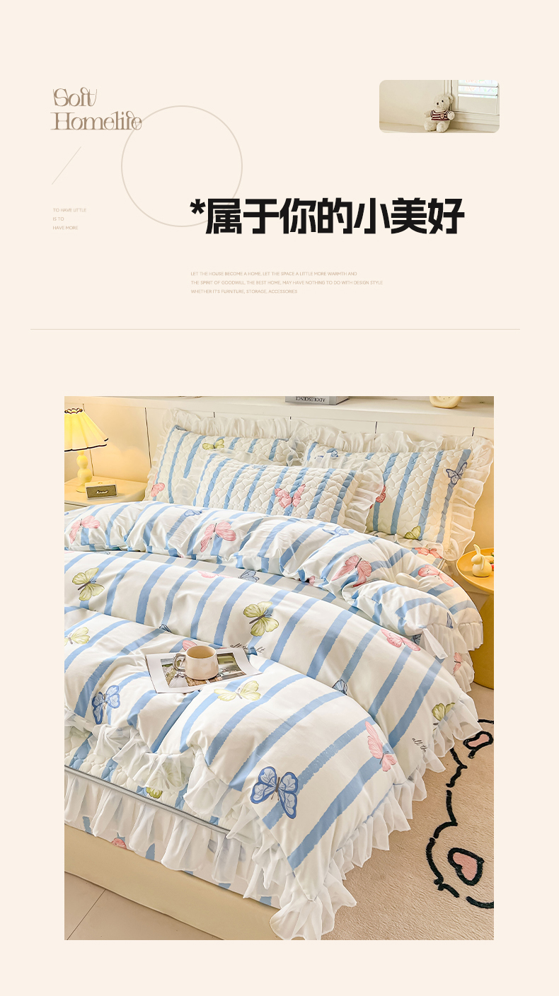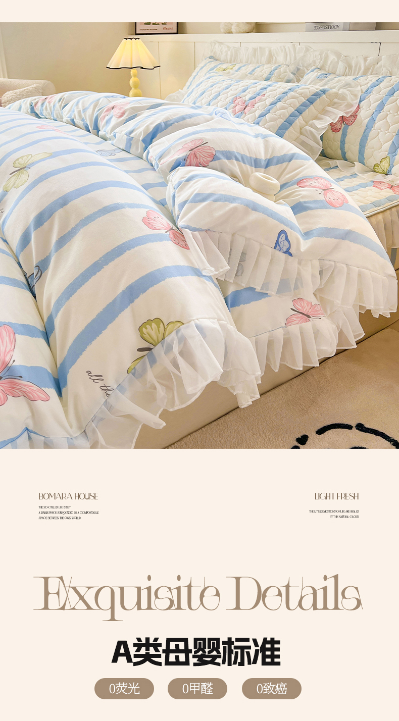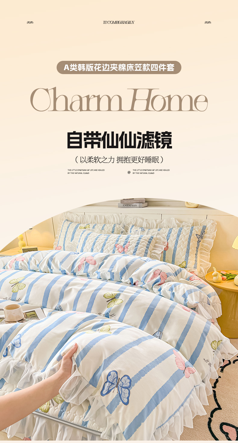 当前位置: 91家纺网 > 商品网购 > 床品套件 > 四件套 > 其它四件套 > 眠势力 2025新款韩版花边床笠款四件套雪纺公主风ins夹棉四季通用席梦思保护套 花蝴蝶