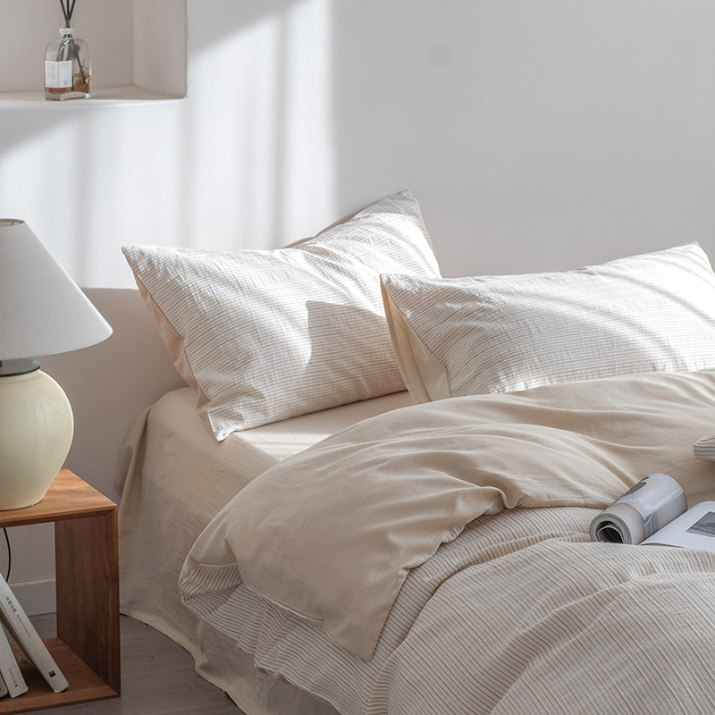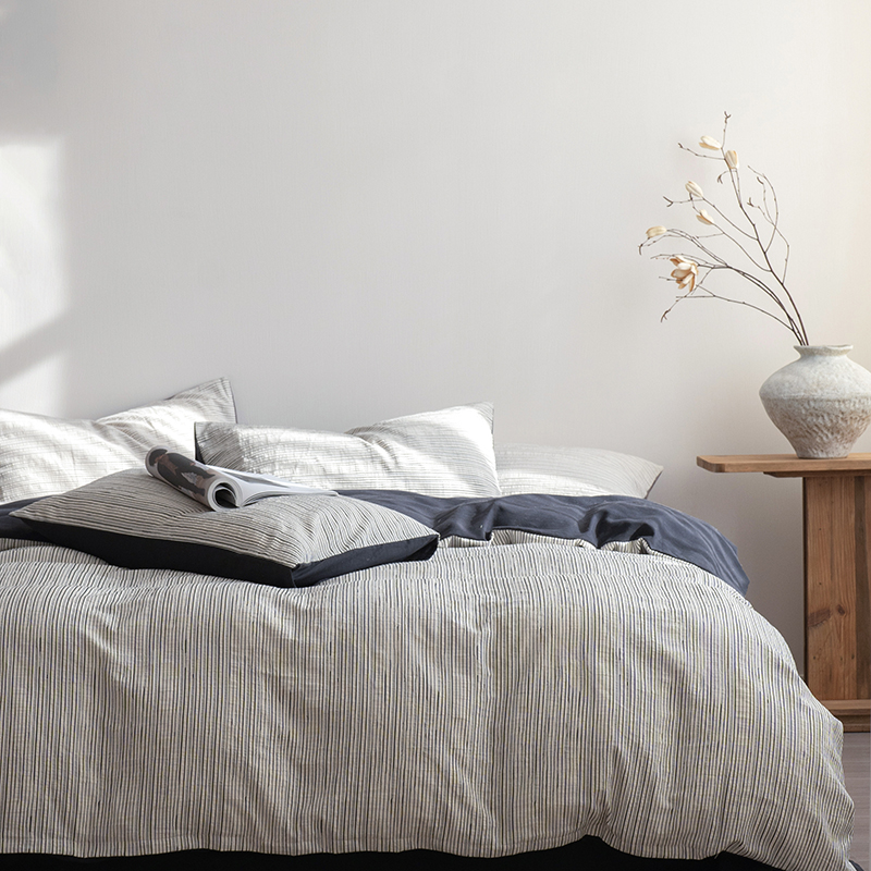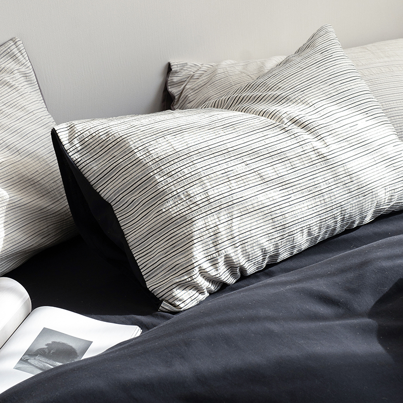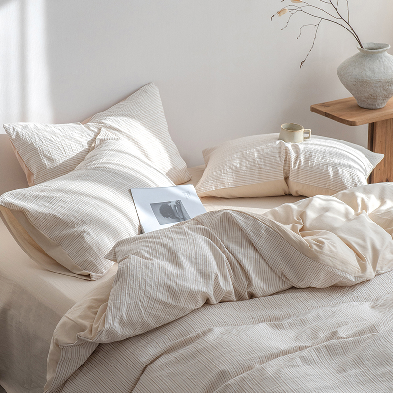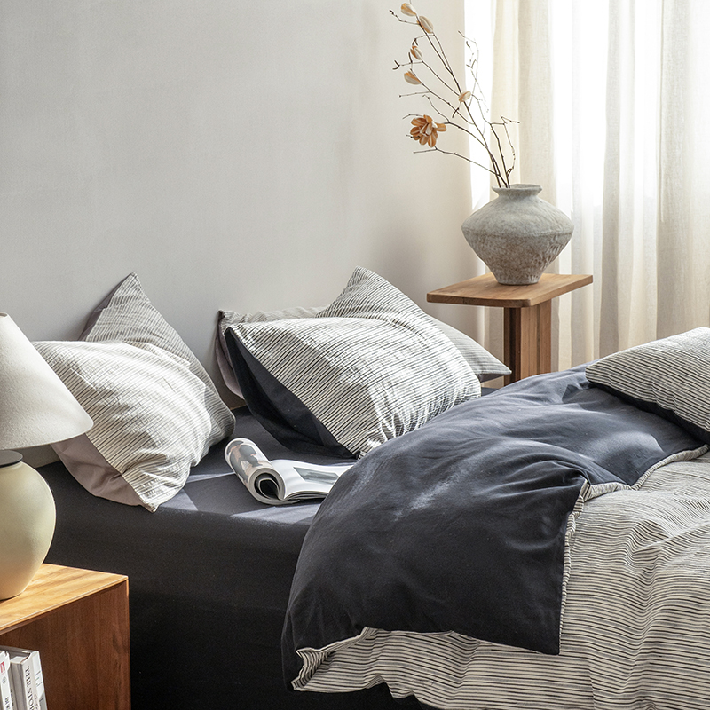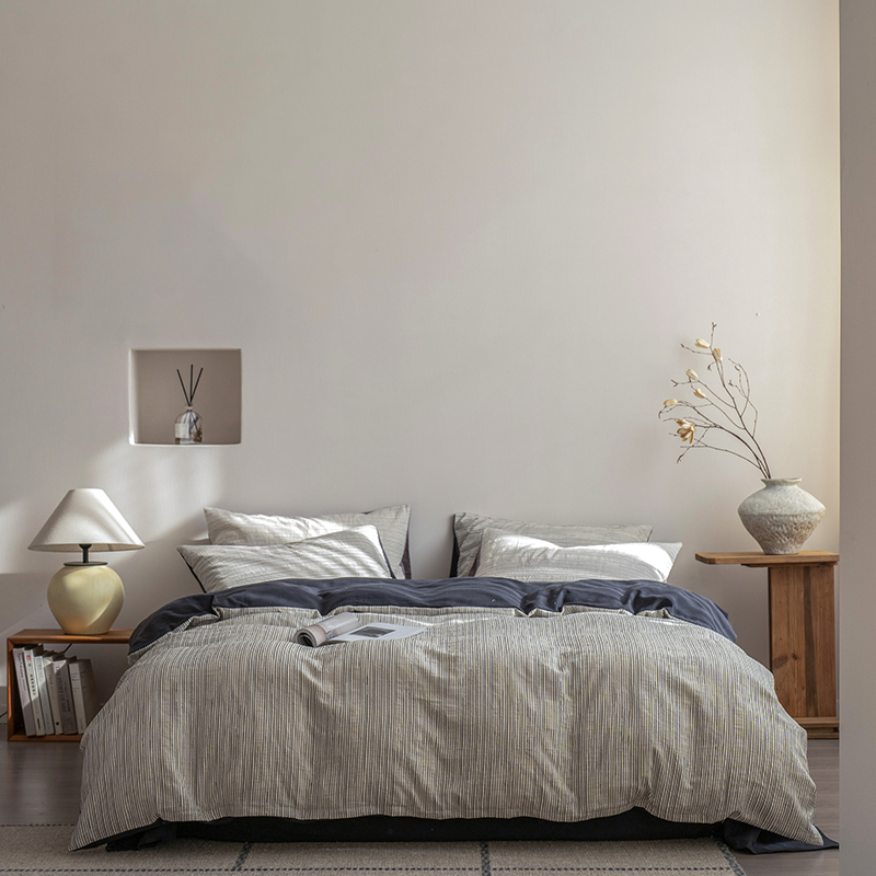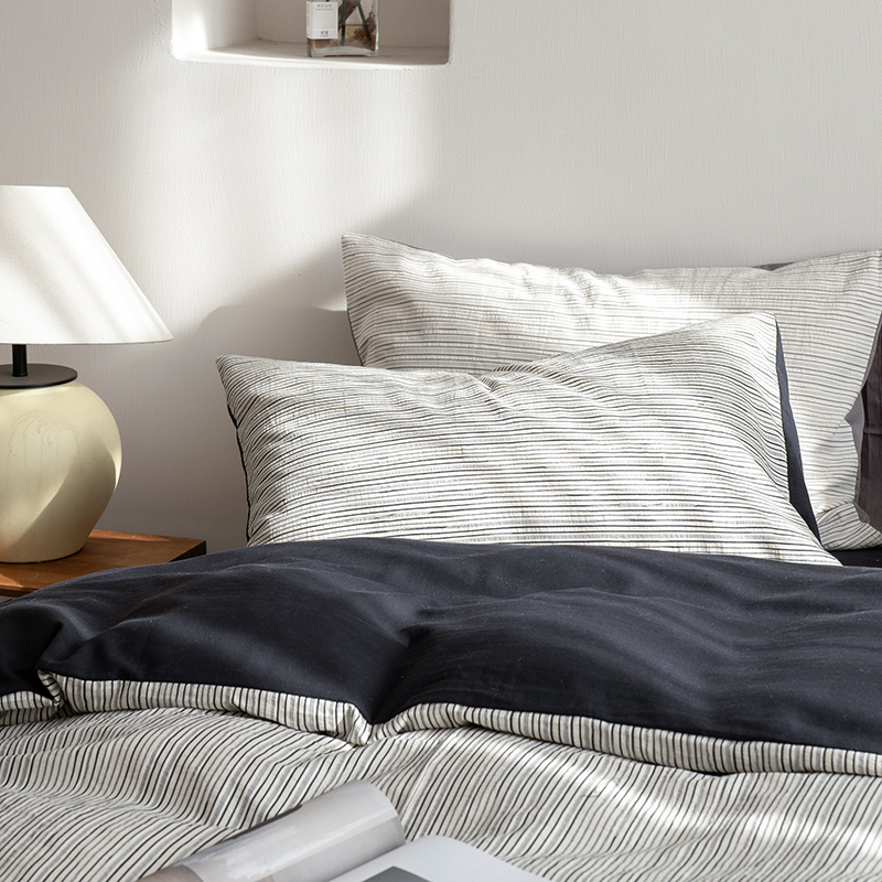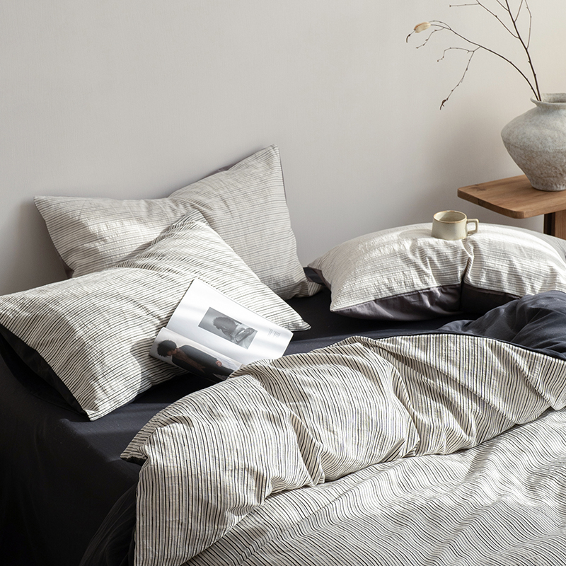 (总)小春日和 2025新款纯棉棉麻民宿中性风四件套高端全棉人字纹条纹被套加大纯色床单1.8床笠男士四件套,木笙-黑,木笙-米