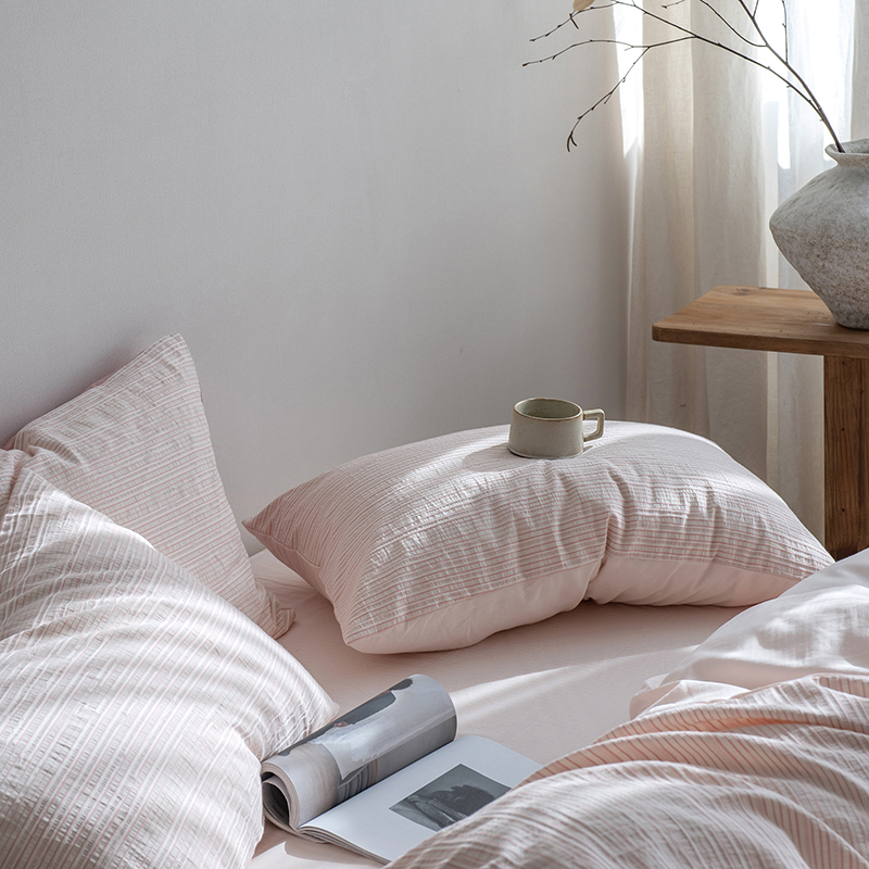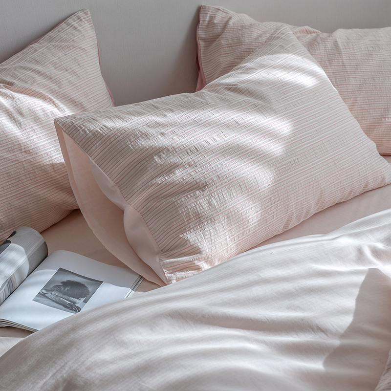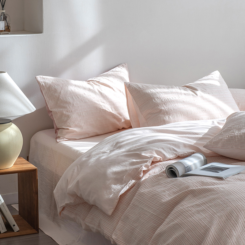 商品名称:小春日和 2025新款高端民宿风纯棉四件套特殊工艺全棉被套人字纹棉1.8床笠纯色双人床单加大笠 岛屿-粉