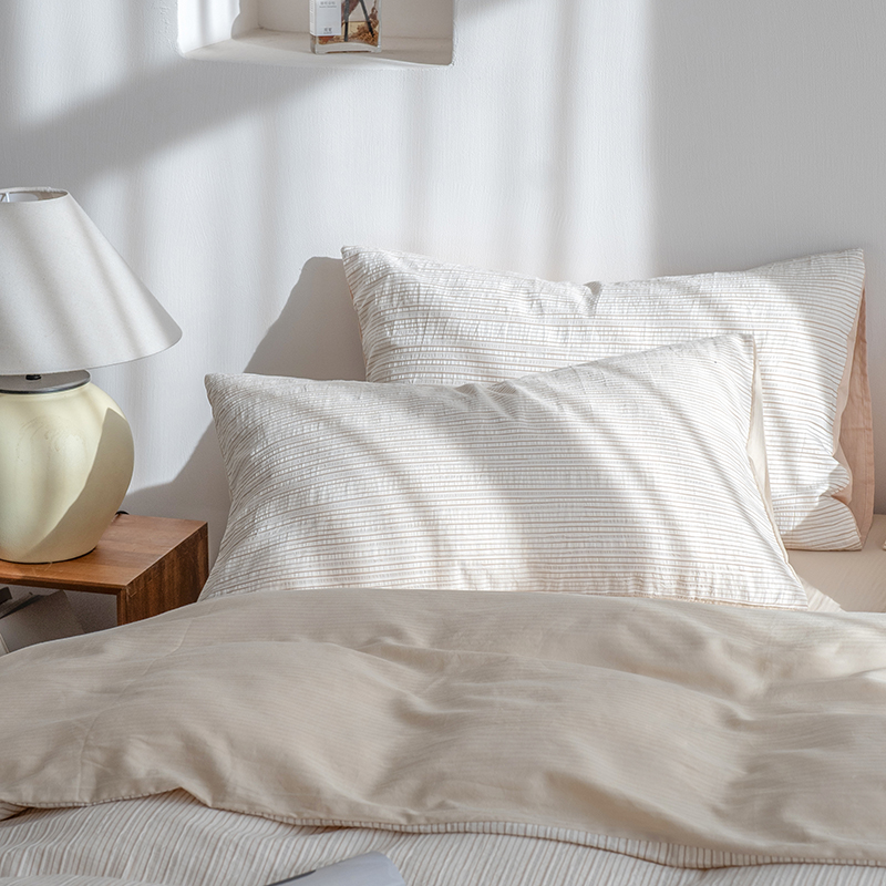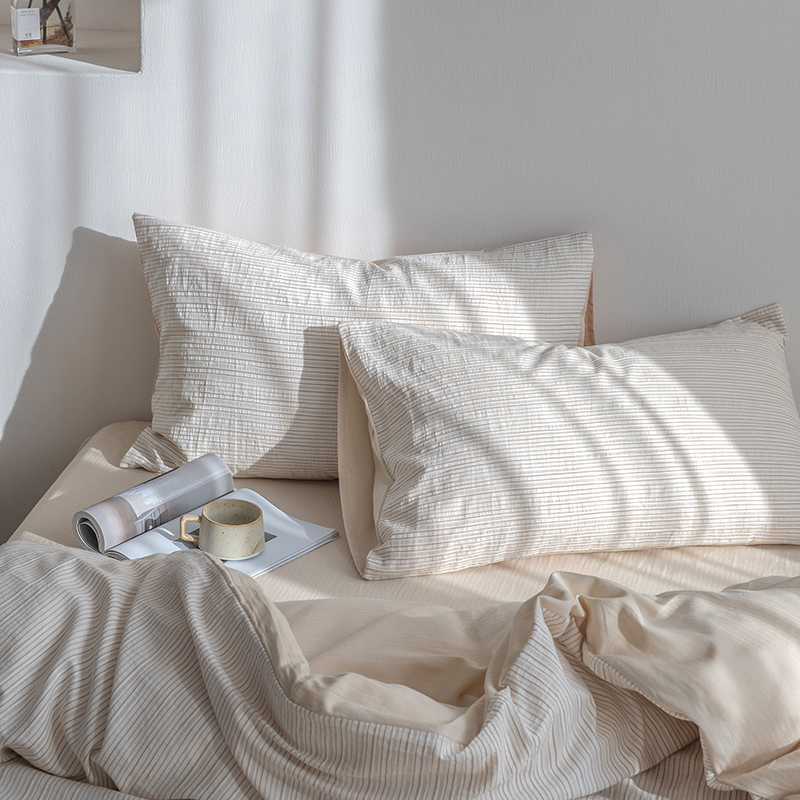 (总)小春日和 2025新款全棉提花条纹四件套纯棉人字纹水洗提花绑带款四件套民宿四件套纯色床单1.8床笠简约被套,云漫