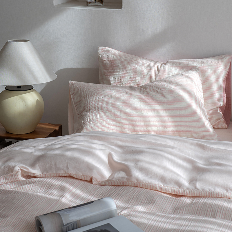 (总)小春日和 2025新款纯棉提花条纹四件套全棉简约民宿高端床品四件套水洗提花人字纹床单1.8床笠加大床单,喜又-粉,喜又-蓝
