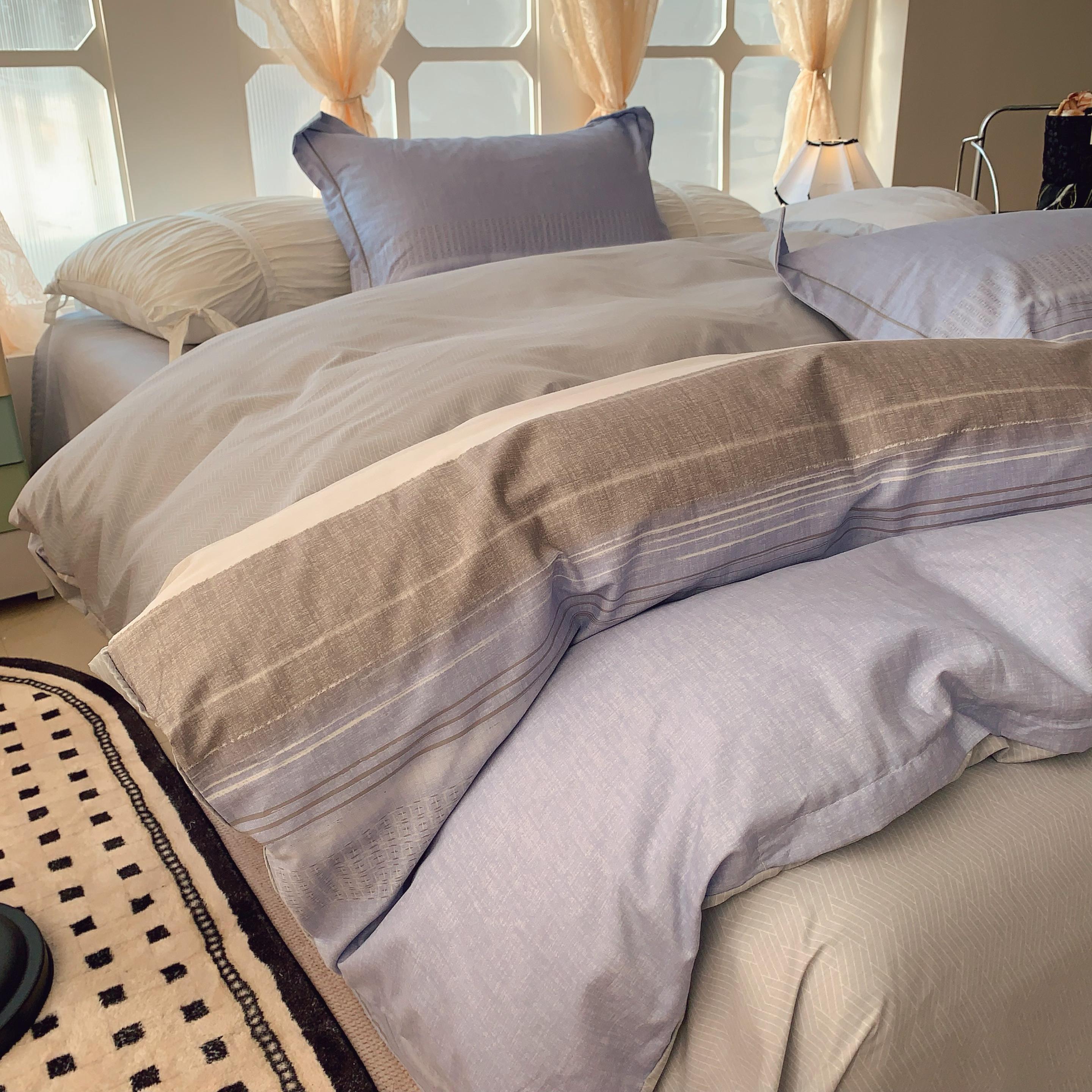 奈萝家纺 2025新款亲肤小清新全棉四件套 条纹艺术蓝