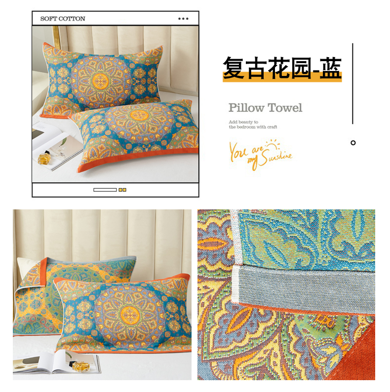 • 91家纺网 家纺一手货源 找家纺 朴尔家纺-毛巾被 2025新款全棉四层纱布色织提花宽边时尚枕巾 复古花园-蓝