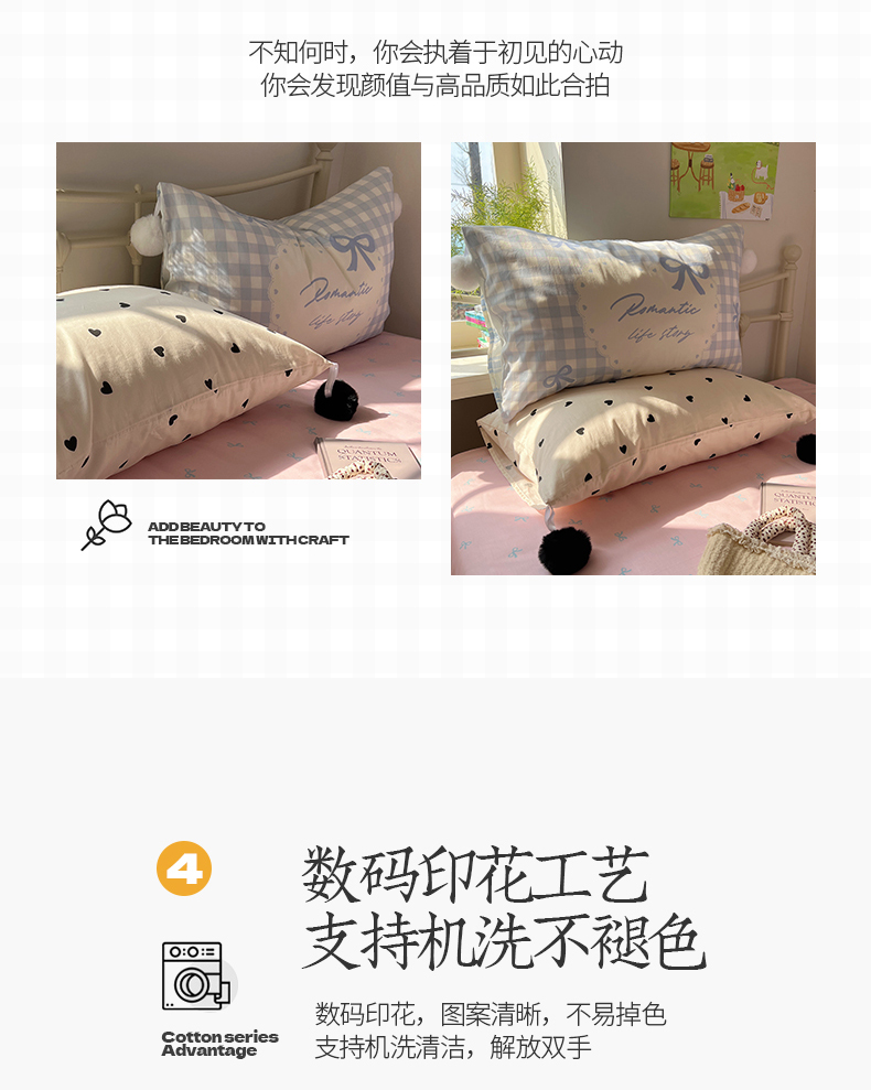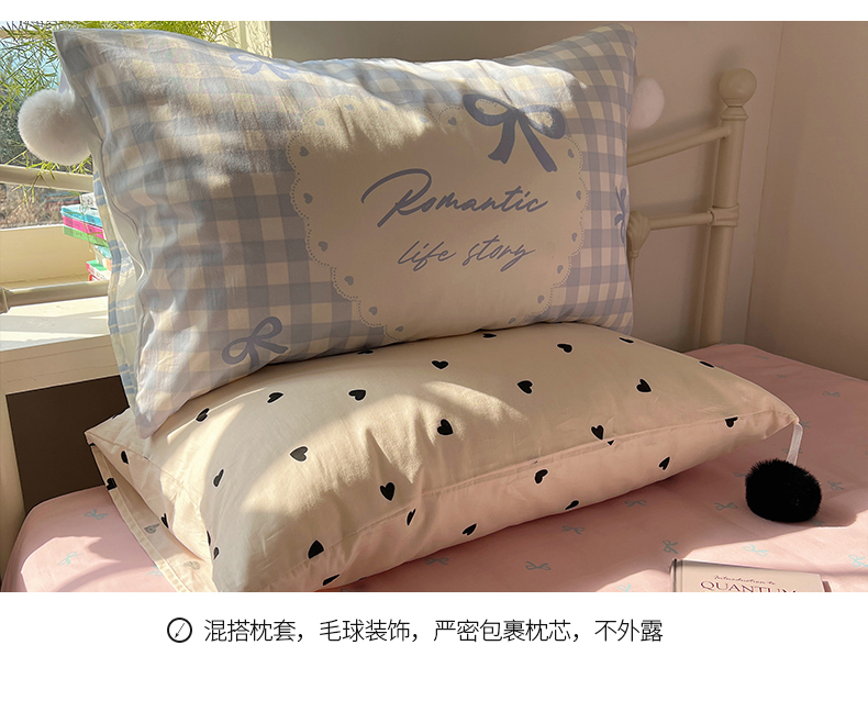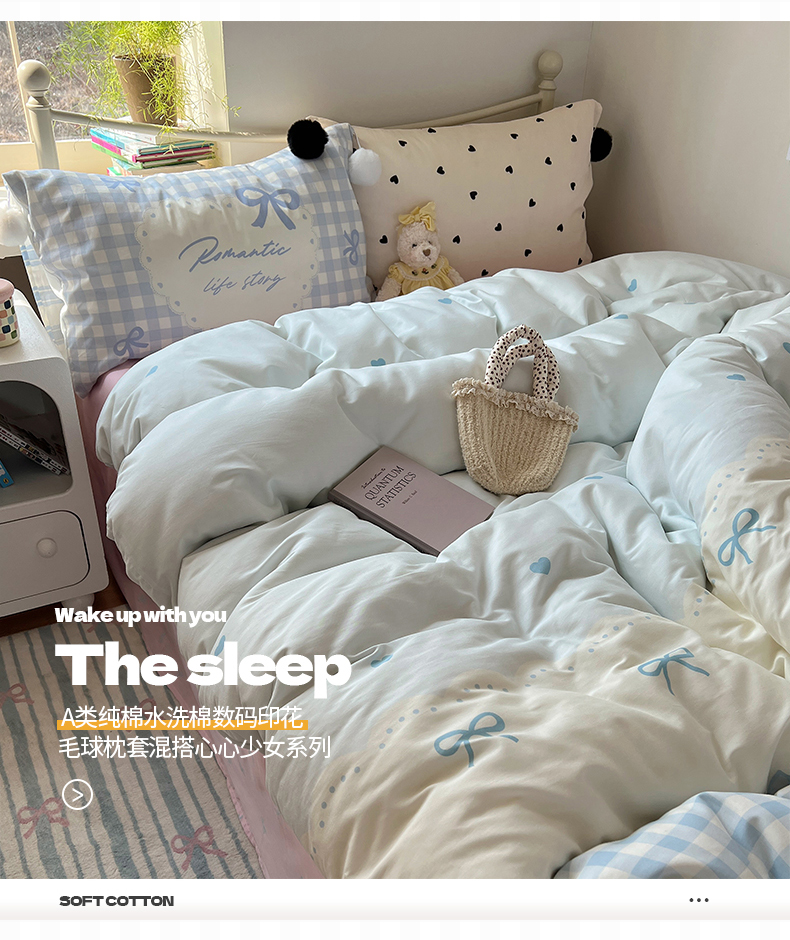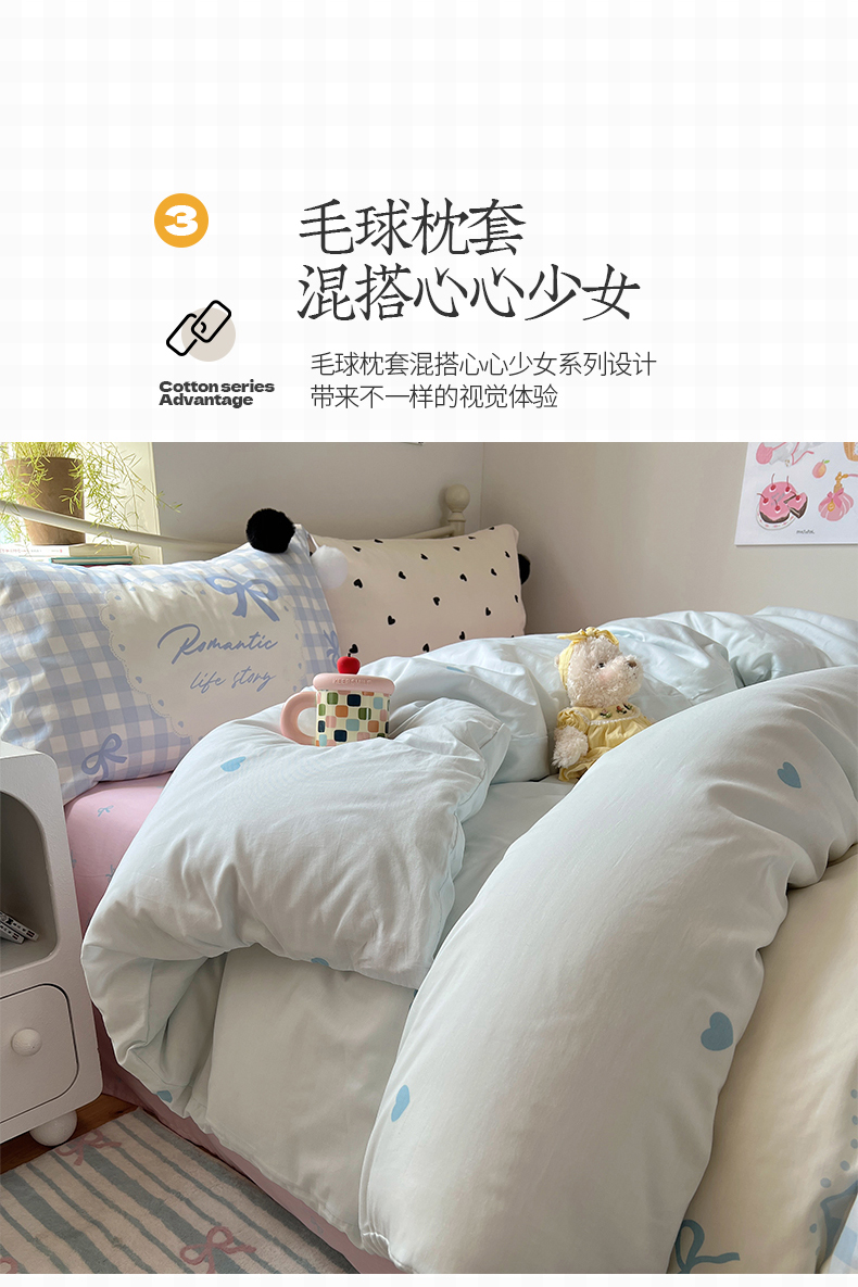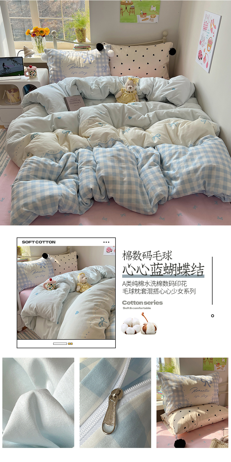 当前位置: 91家纺网 > 商品网购 > 床品套件 > 四件套 > 全棉普通四件套 > 2025新款A类水洗棉数码印花毛球枕套混搭心心少女纯棉水洗棉系列四件套 棉数码毛球-心心蓝蝴蝶结