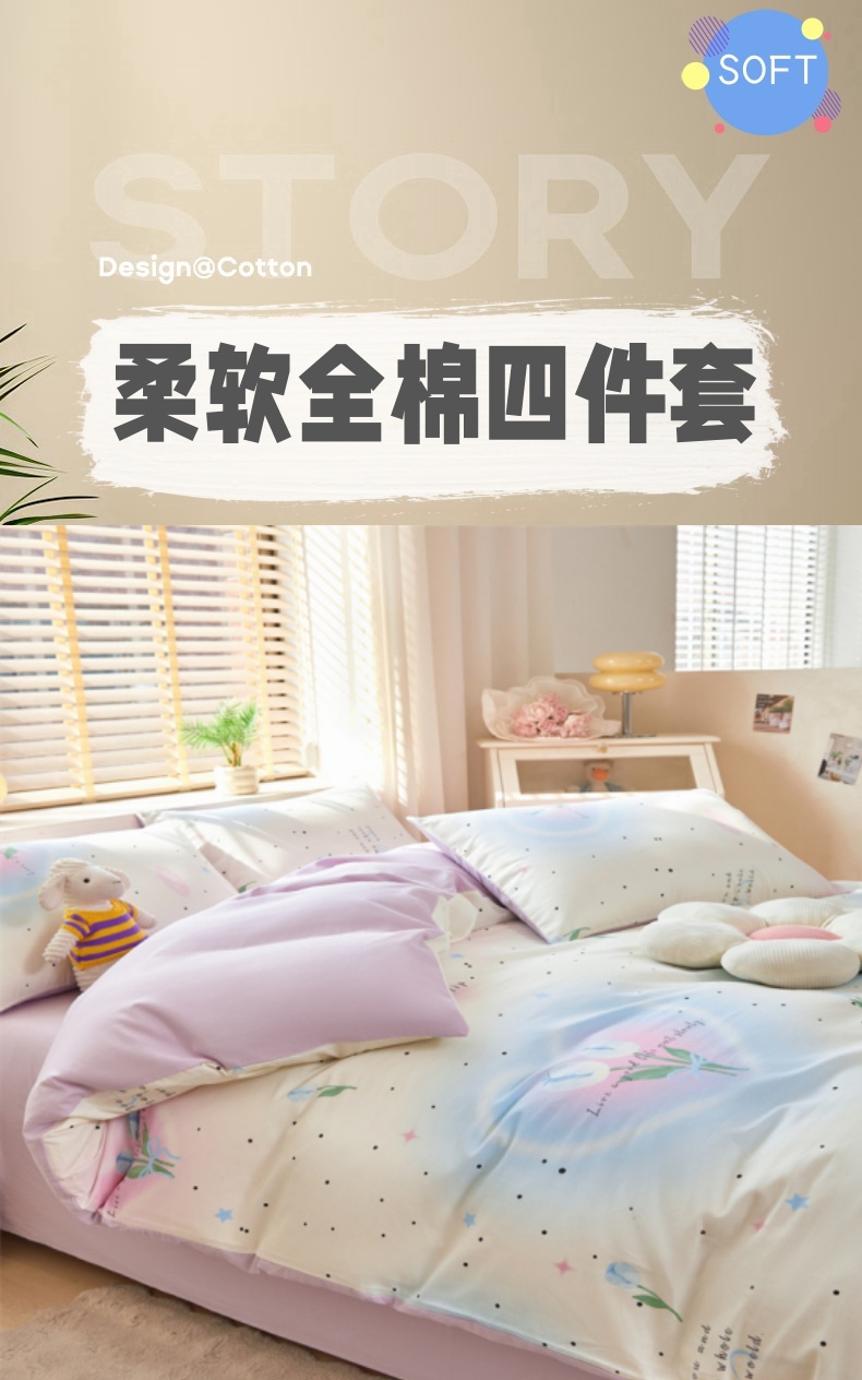 商品名称:梦舒羽2025新款全棉小清新印花加厚宿舍床单床裙款四件套 紫色郁金香-全棉
