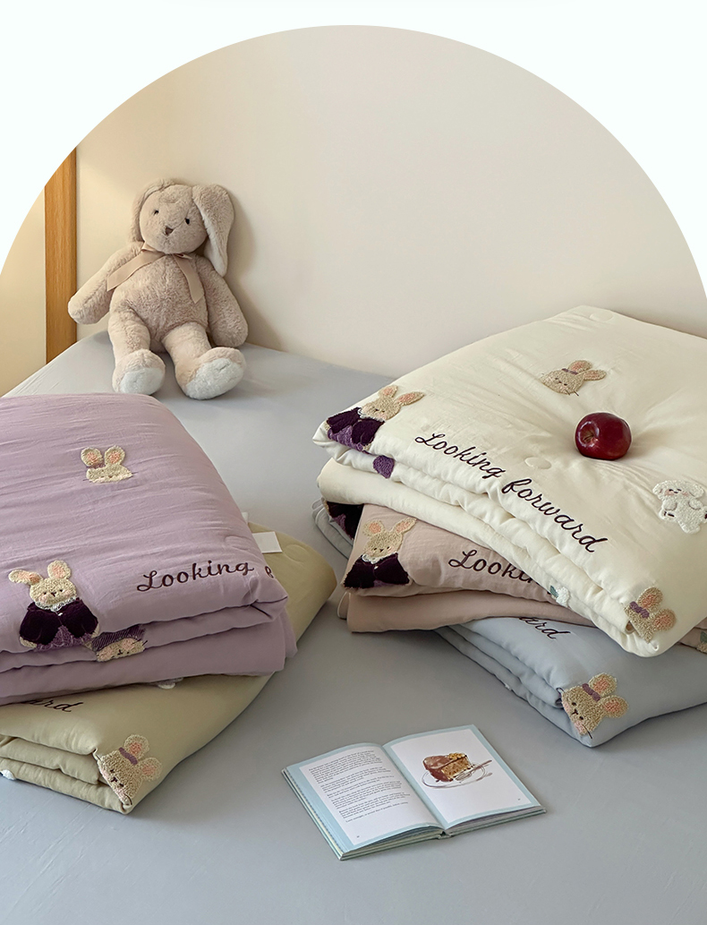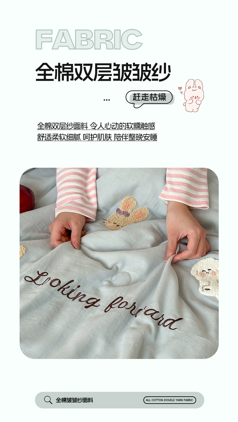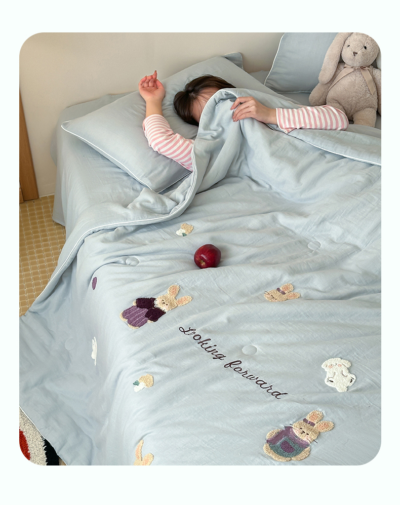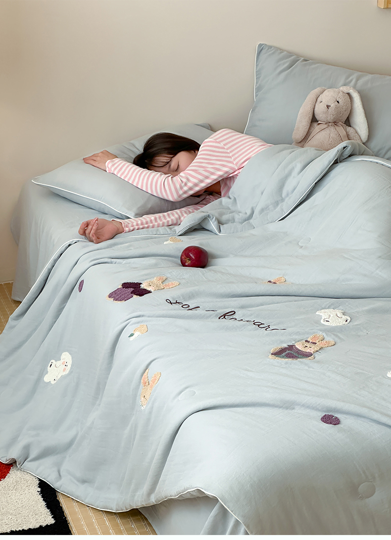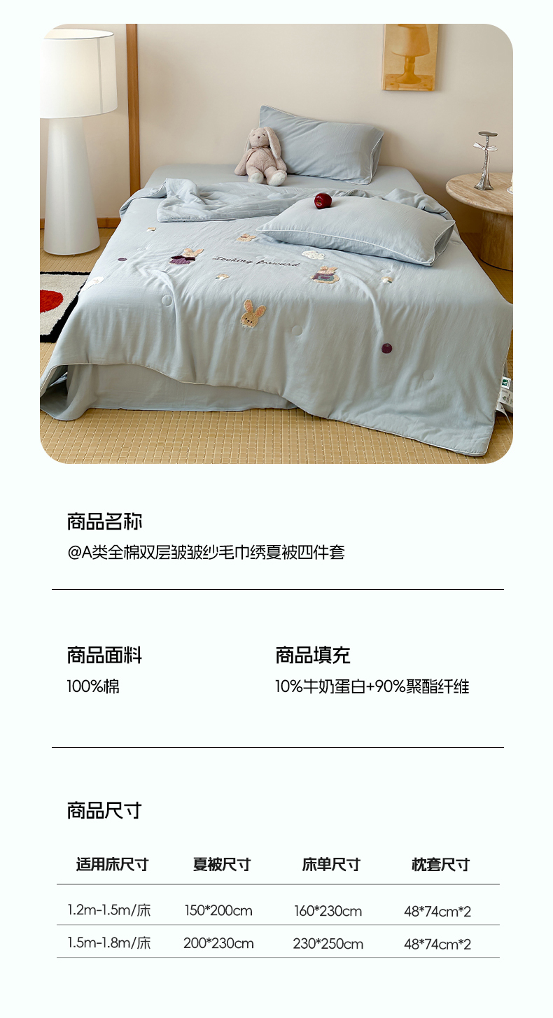 当前位置: 91家纺网 > 商品网购 > 床品套件 > 四件套 > 夏被四件套 > 一加一 2025新款A类全棉双层纱皱皱纱毛巾绣夏被四件套(可妮兔系列) 可妮兔-蓝