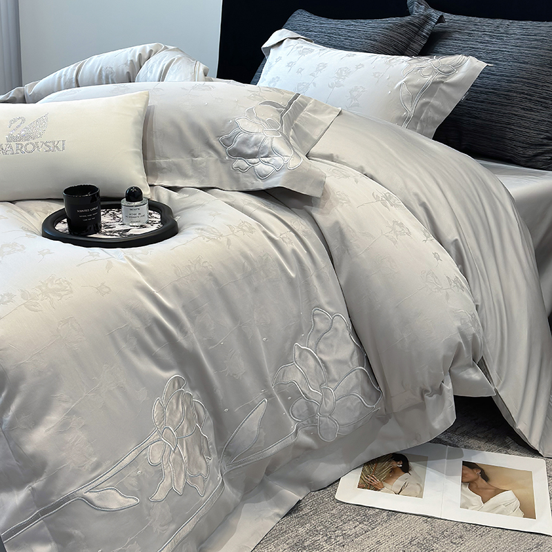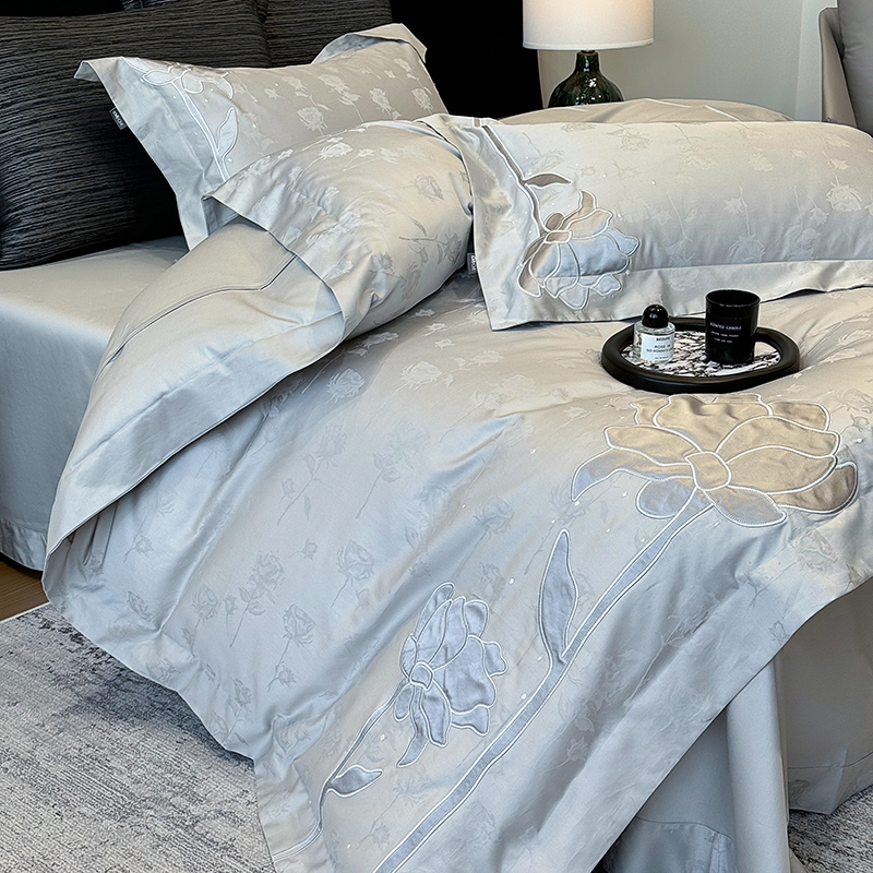 商品名称:若未家居 LOVEWE HOUSE 2025新款50S长绒棉提花800T锦缎贴布绣工艺四件套-博洛-自然光实拍 博洛-灰