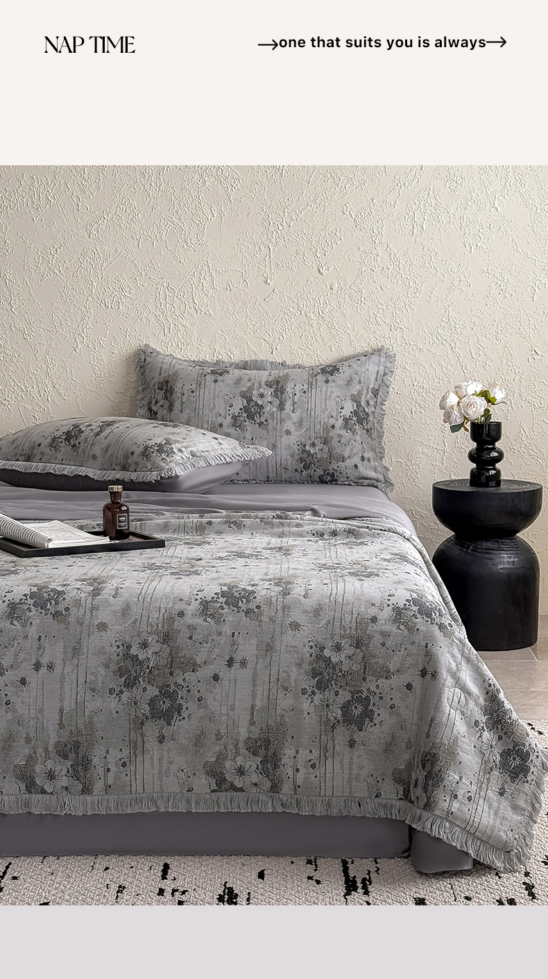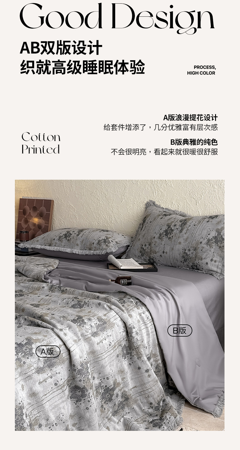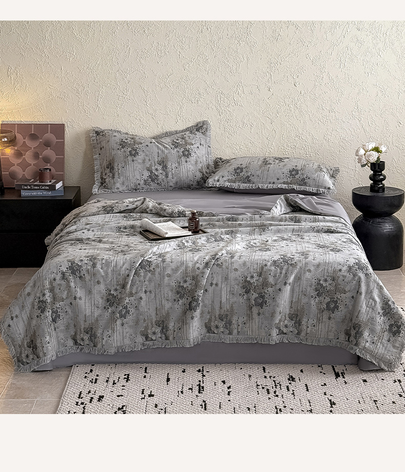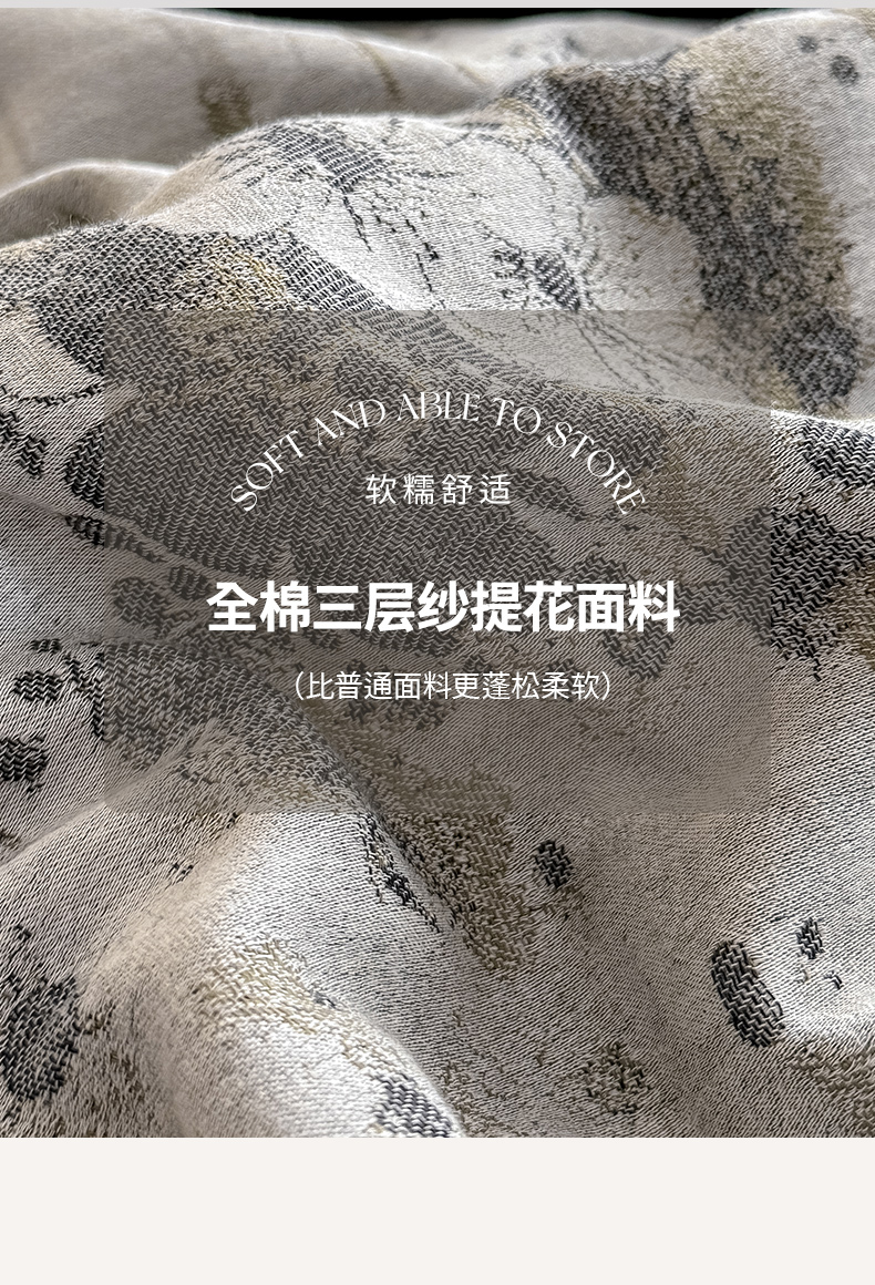 当前位置: 91家纺网 > 商品网购 > 床品套件 > 四件套 > 全棉活性四件套 > 2025新款全棉三层纱提花夏被四件套 花恋-黛绿