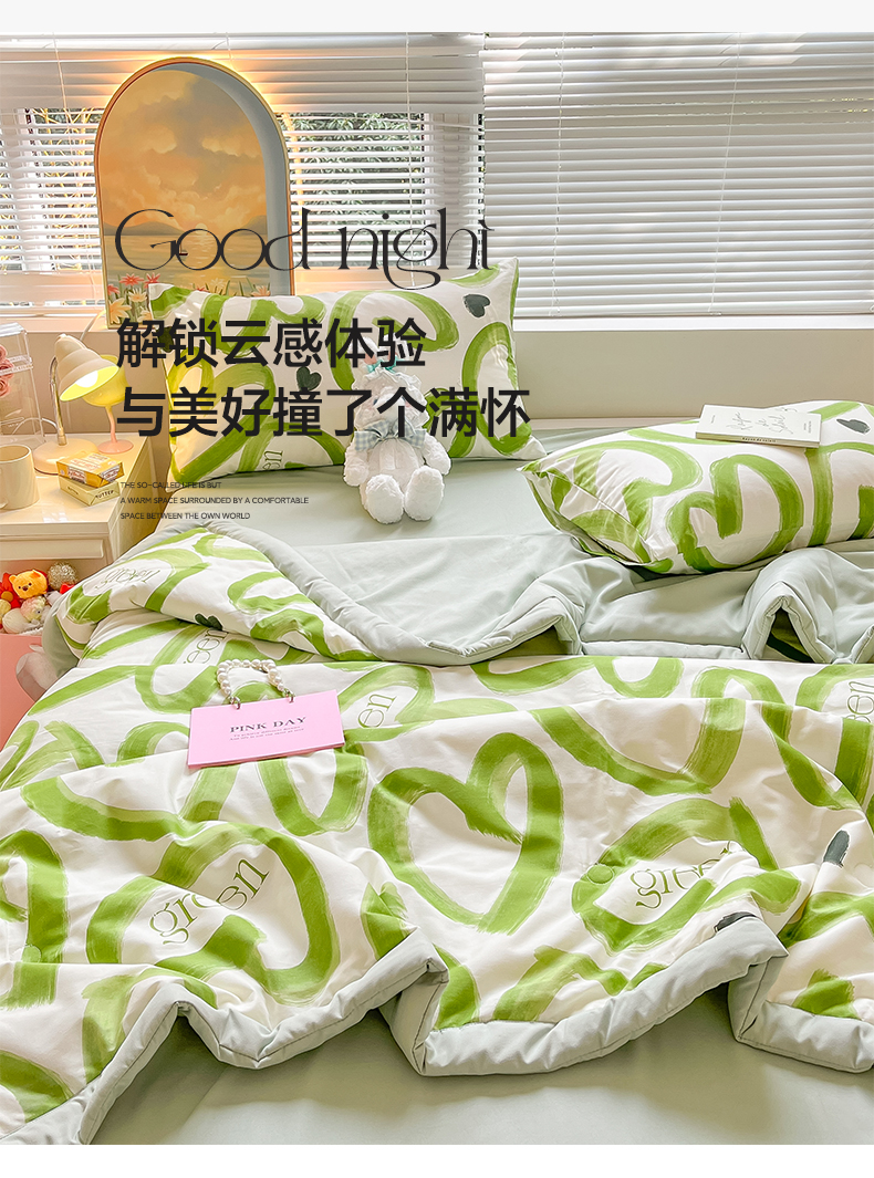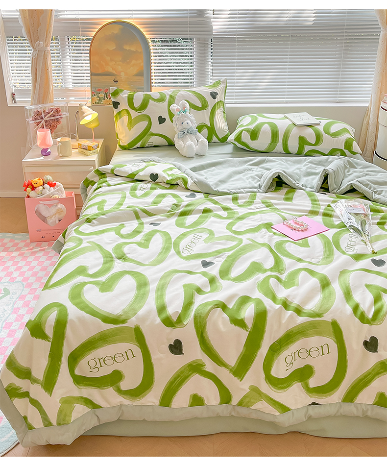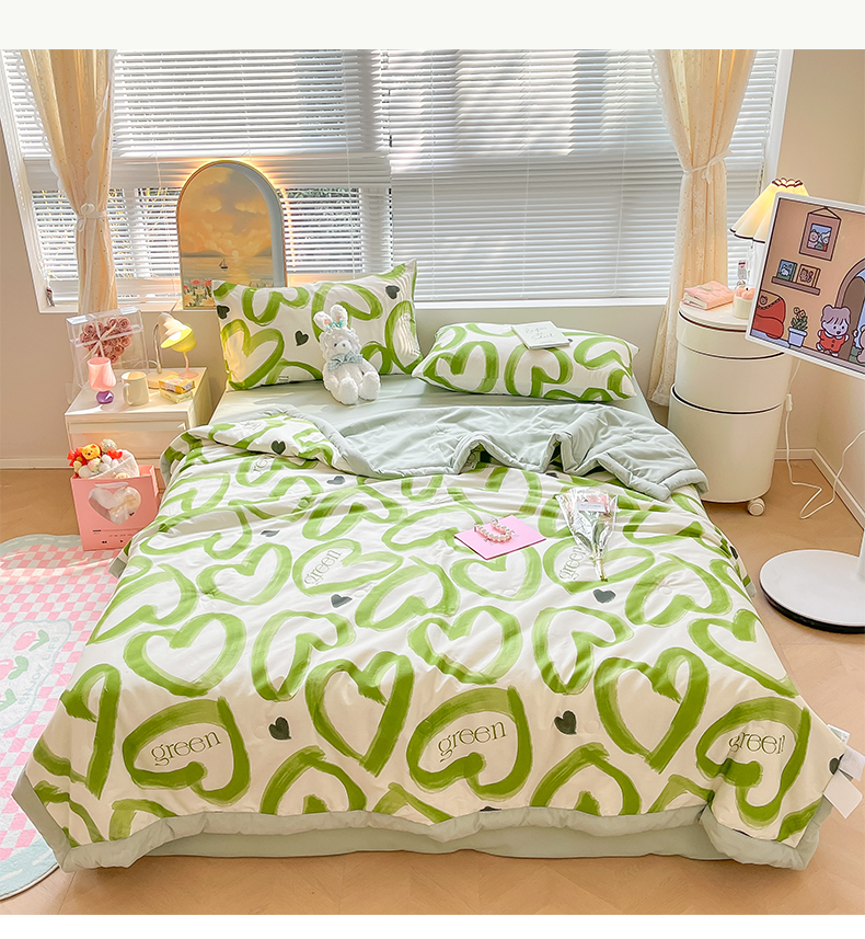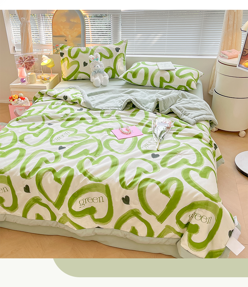 当前位置: 91家纺网 > 商品网购 > 床品套件 > 四件套 > 夏被四件套 > 一加一 2025新款A棉B水洗棉大豆夏被四件套 绿色爱心