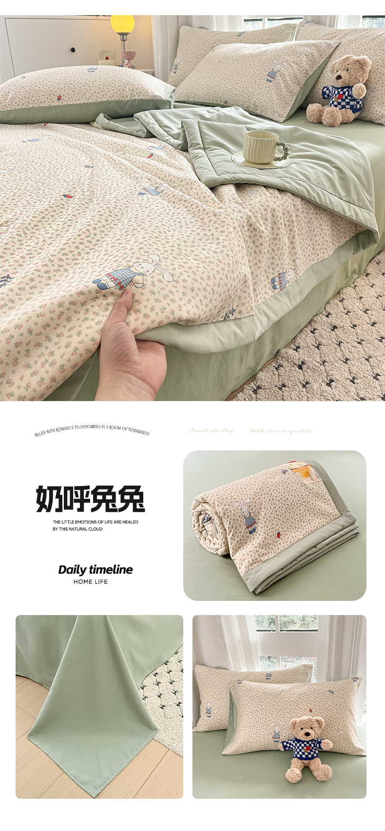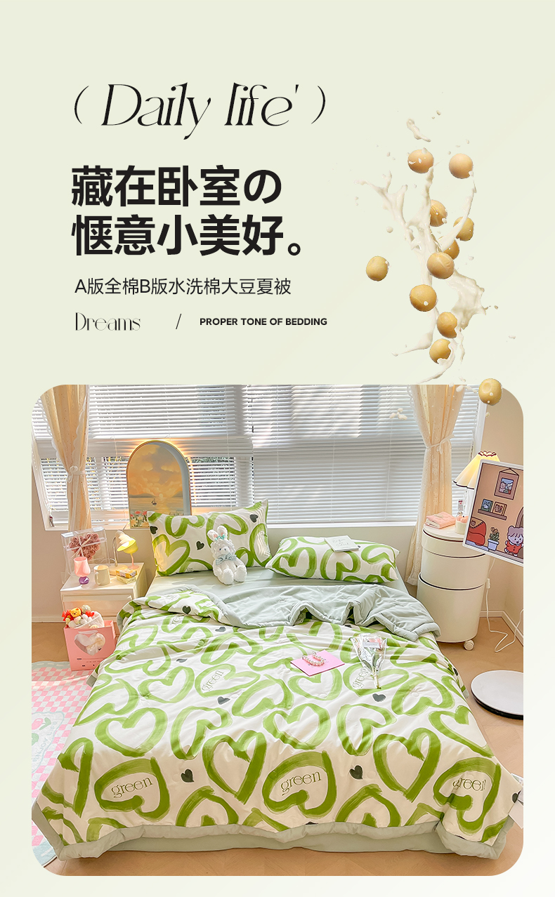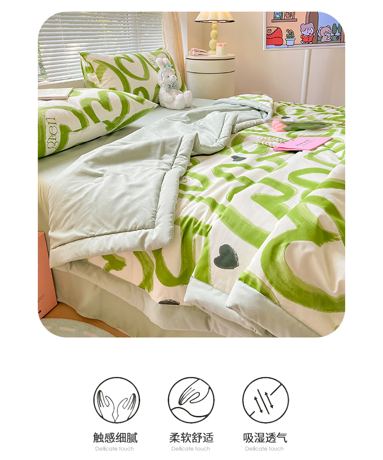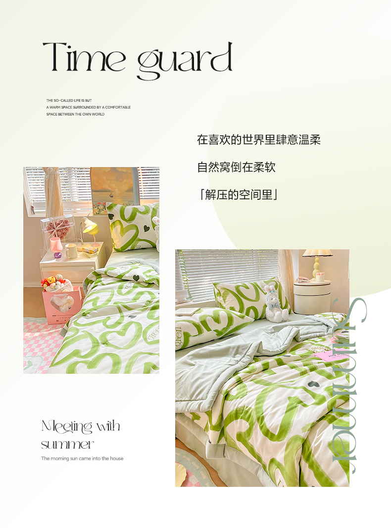 当前位置: 91家纺网 > 商品网购 > 床品套件 > 四件套 > 夏被四件套 > 一加一 2025新款A棉B水洗棉大豆夏被四件套 绿色爱心