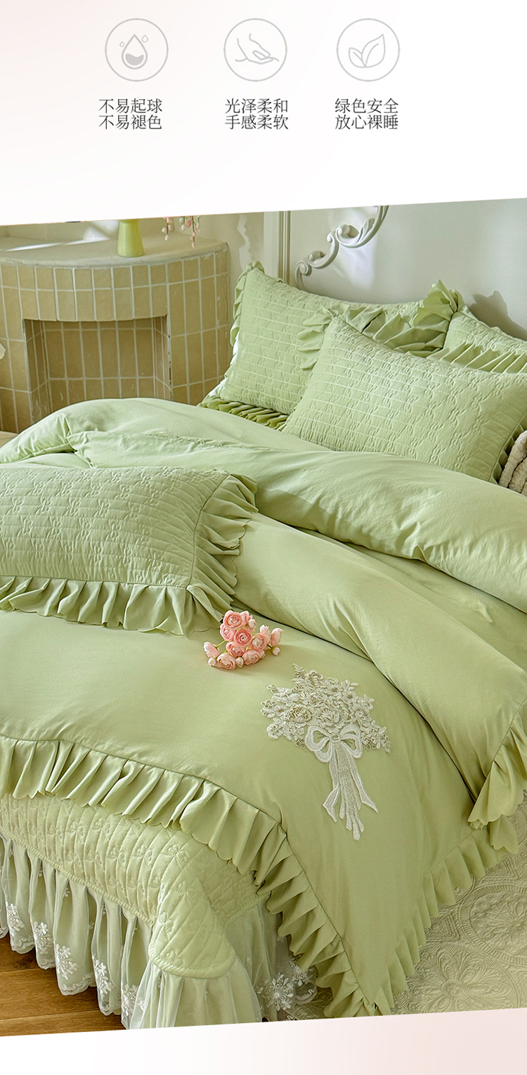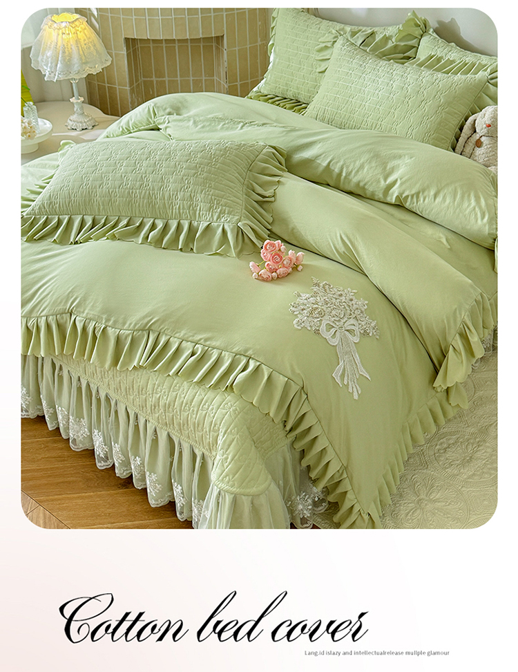 商品名称:苏米娜家纺2025春夏新品韩版甜美公主风超柔水洗棉床盖四件套刺绣针织棉双层纱纯棉棉麻全棉少女心夹棉床裙款夏被款床盖 花夕-嫩芽绿