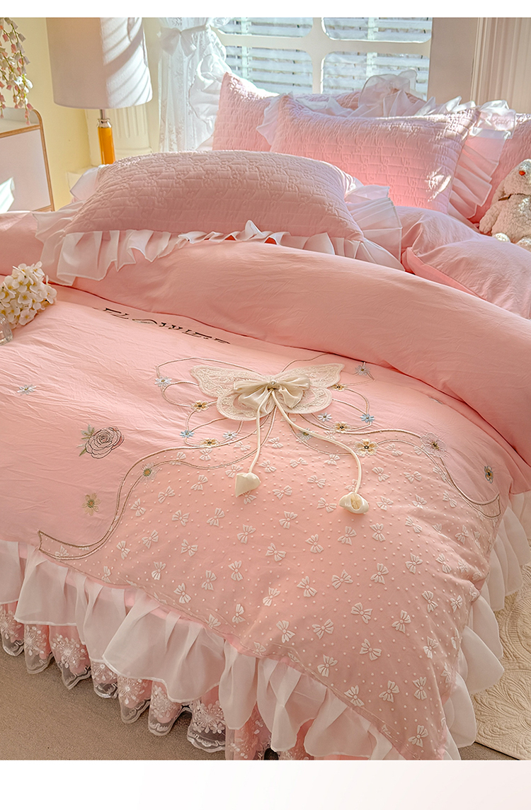 苏米娜家纺2025春夏新品韩版甜美公主风超柔水洗棉床盖四件套刺绣针织棉双层纱纯棉棉麻全棉少女心夹棉床裙款夏被款床盖四件套 幻蝶-梦幻紫