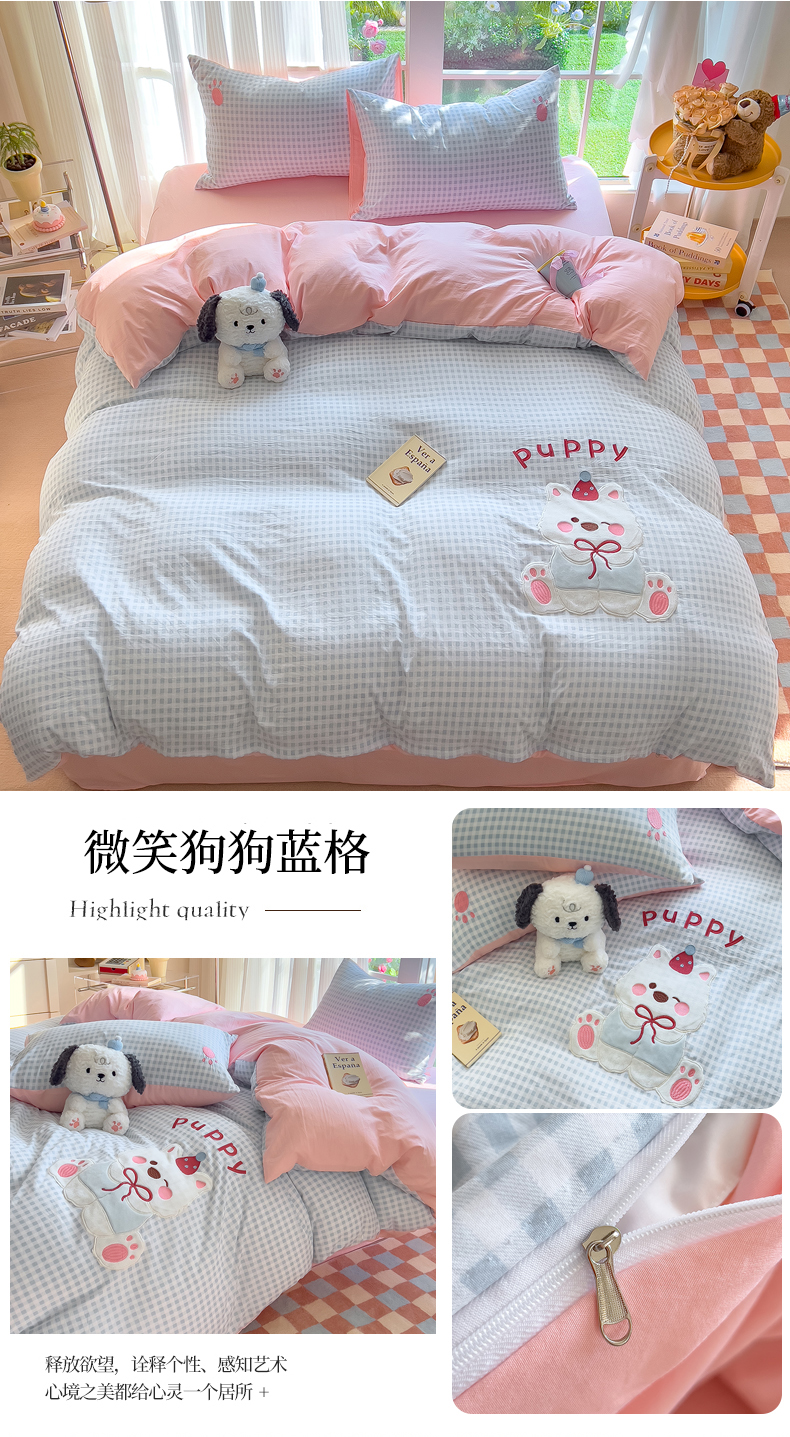 当前位置: 91家纺网 > 商品网购 > 床品套件 > 四件套 > 水洗棉四件套 > N先生+V 13814689556 发大图/买家秀 2025新款超柔水洗棉贴布绣四件套-微笑狗狗系列 微笑狗狗-蓝格