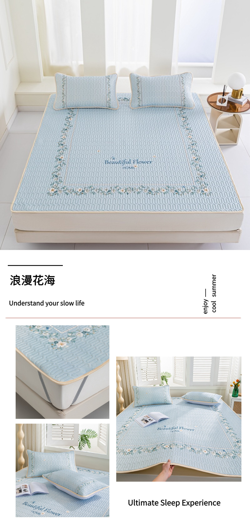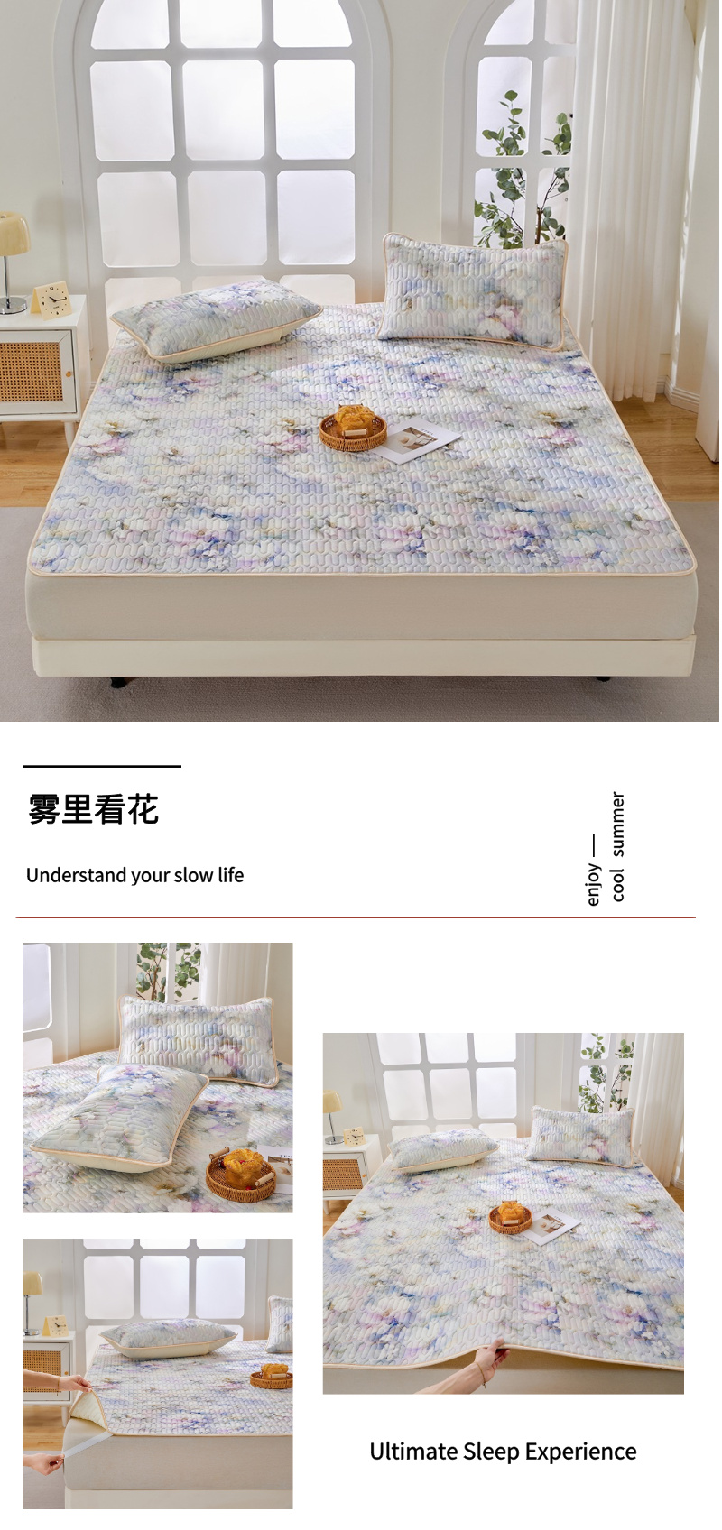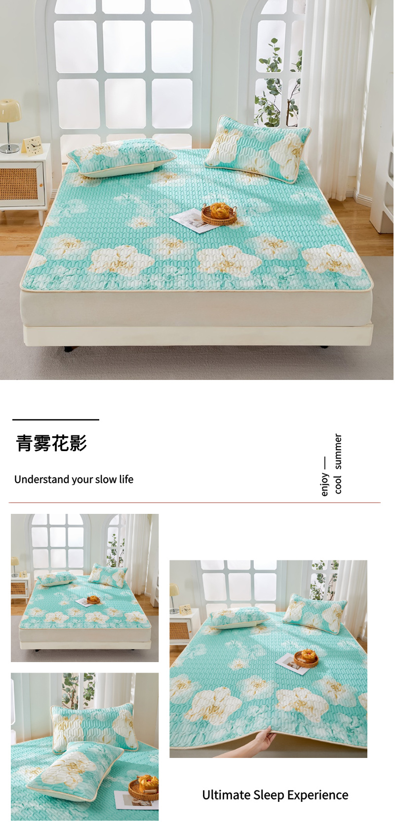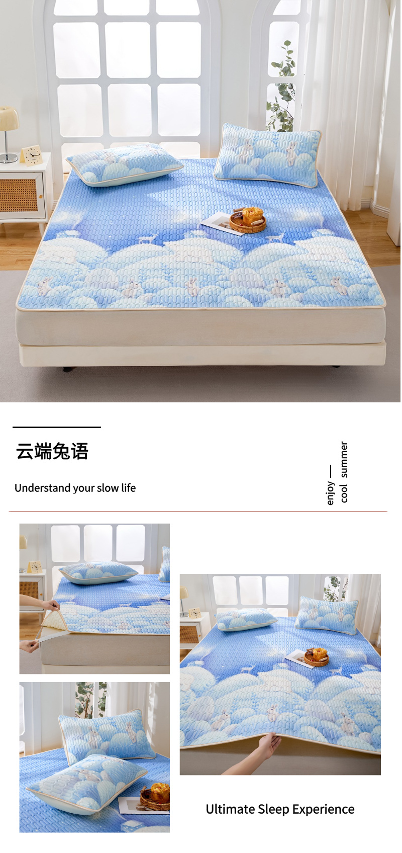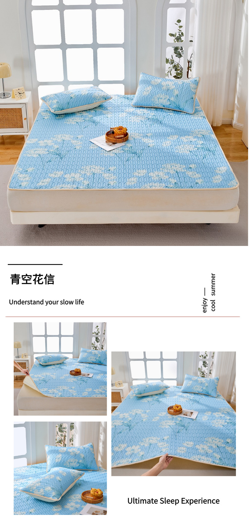 (总)羽梦家纺 2026新款冰柔丝乳胶床裙款凉席,青雾花影,云间花境,云端兔语,青空花信,柔云粉,淡蓝色,深睡蓝,青空灰