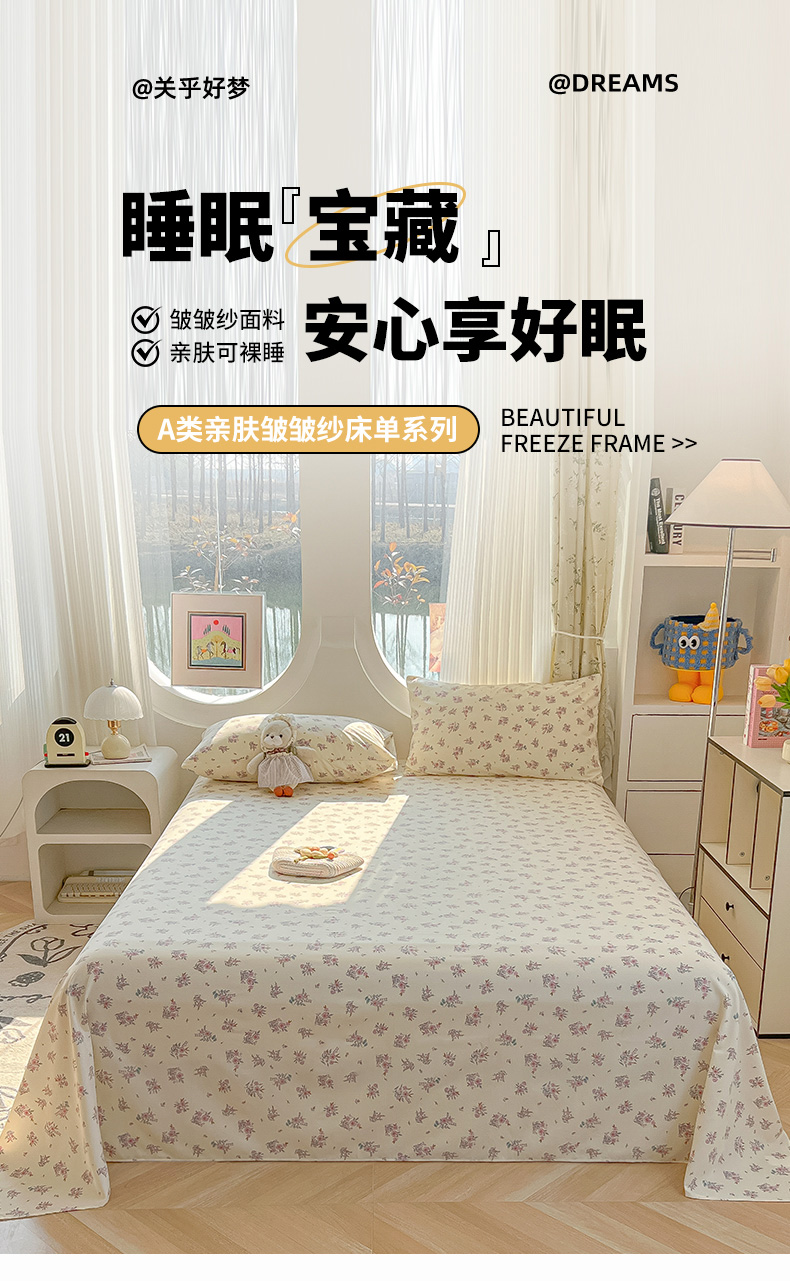 (总)眠帛家居 2025新款A类水洗皱皱纱印花床单,乖巧猫咪,蝴蝶偏偏,花蔓,可爱小狸,浪漫,蔓蔓