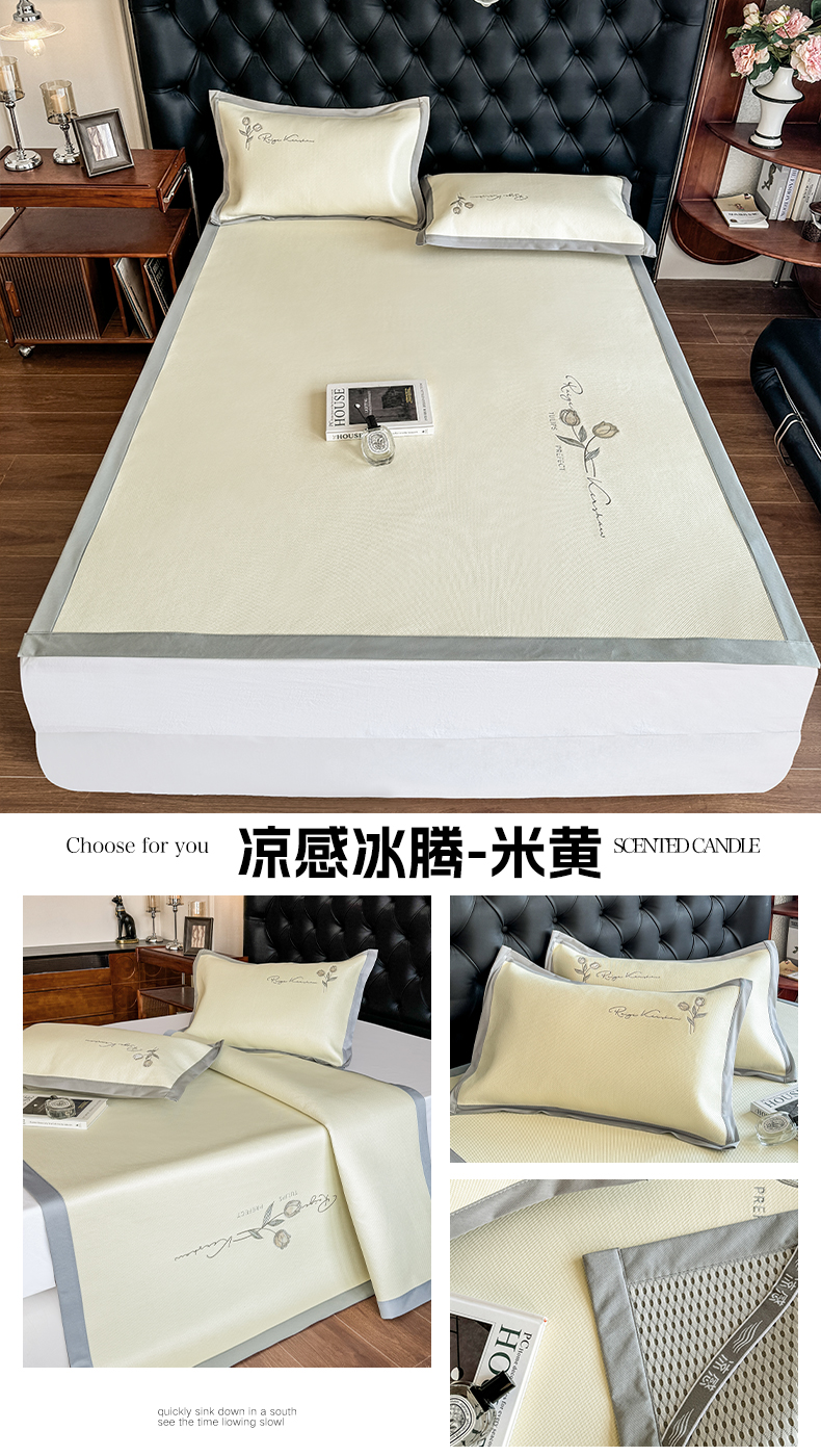 商品名称:格真 2025新款A类中分子PE瞬间凉感刺绣冰藤席高端复合三明治加密软凉席可折叠空调席藤席 凉感冰腾-米黄