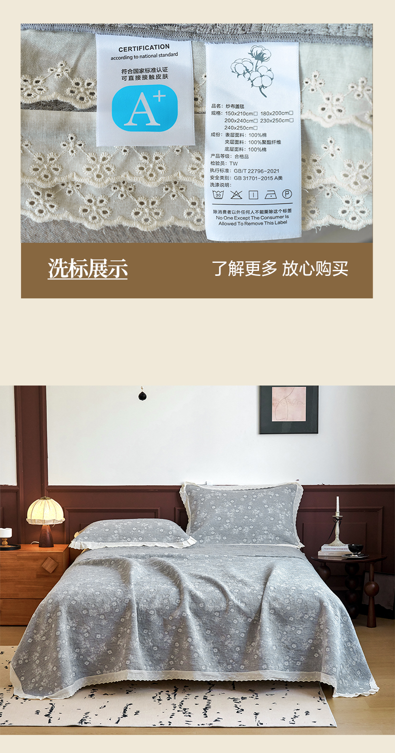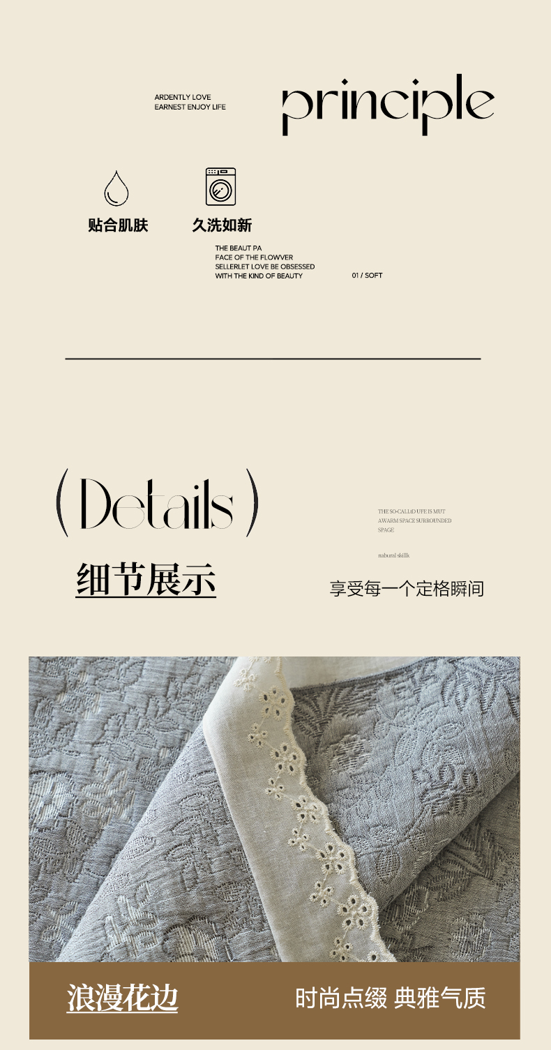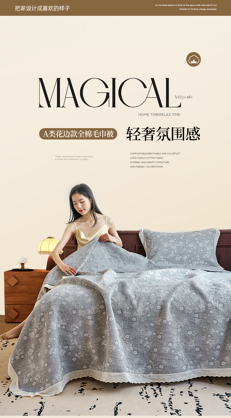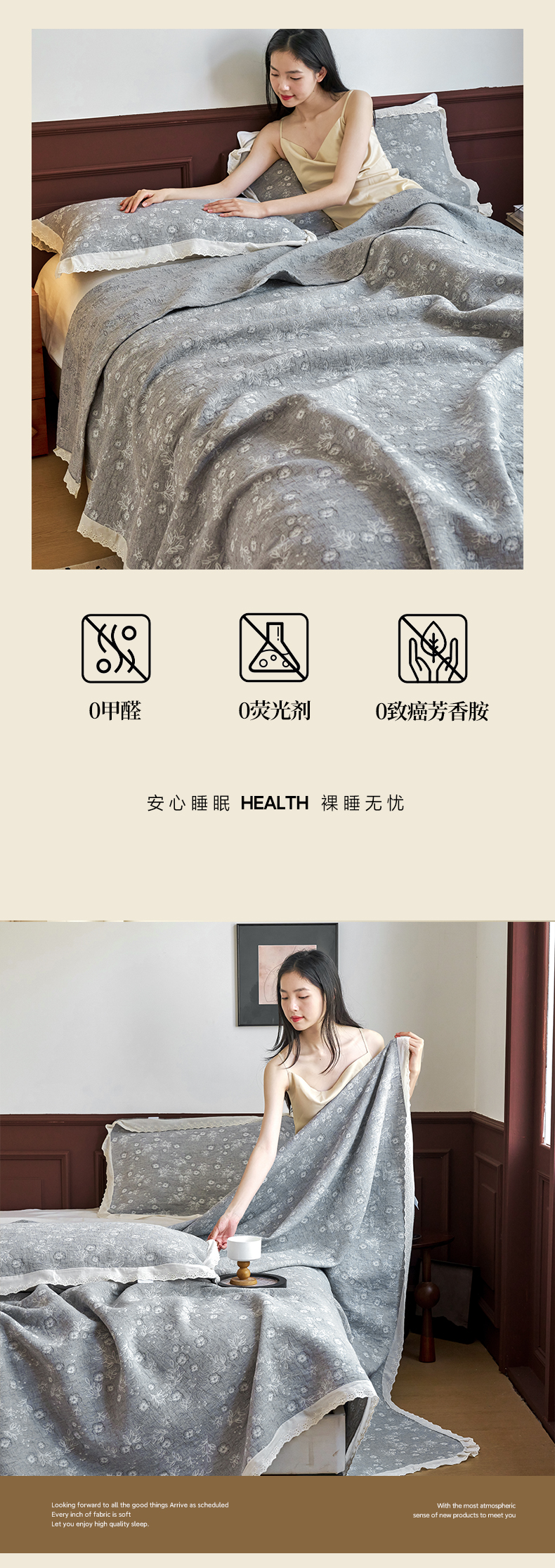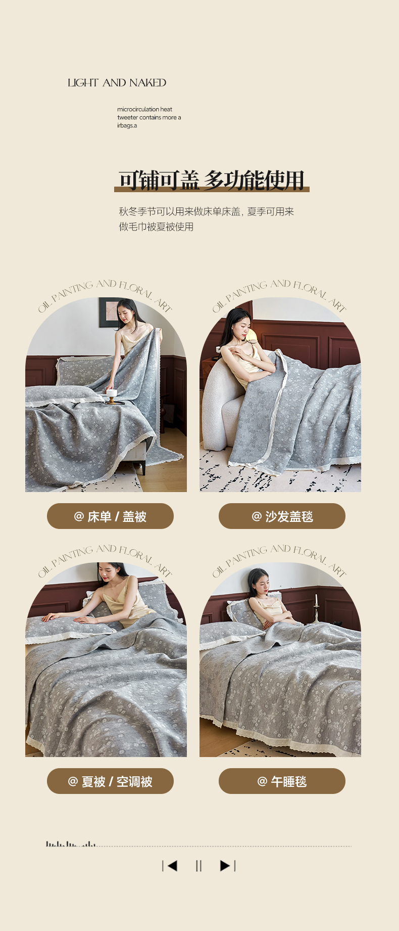 • 91家纺网 家纺一手货源 找家纺 棠薇家纺2025新款花边款全棉三层细纱色织提花毛巾被夏被空调被毛巾毯 花边春意灰