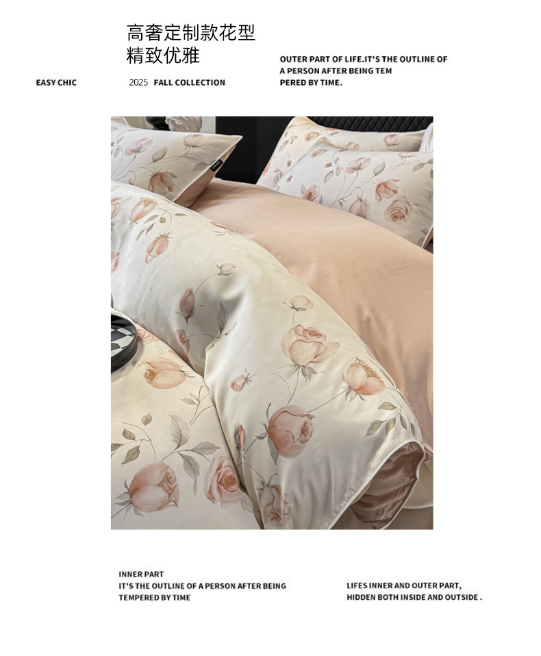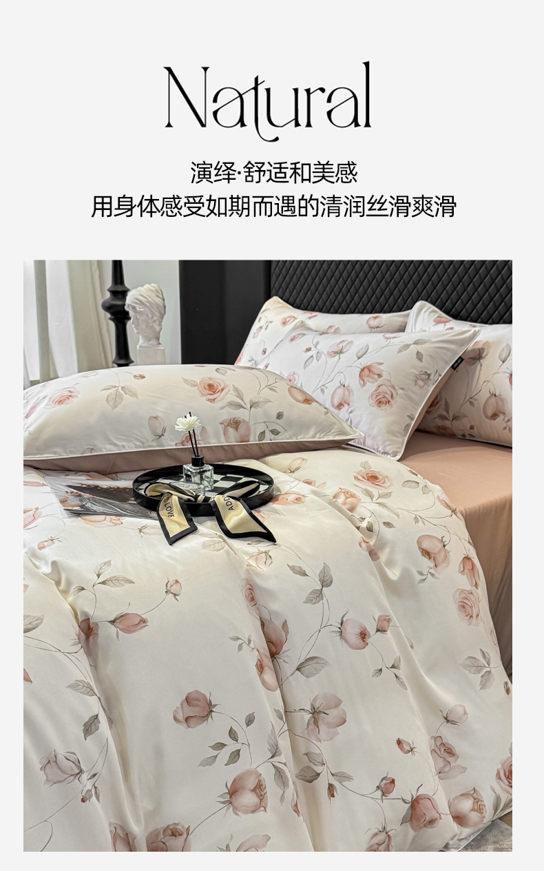商品名称:芊寻家居 2025春夏新款50支莱赛尔天丝贡缎数码印花麻绳款四件套高端礼盒 花意盈香粉