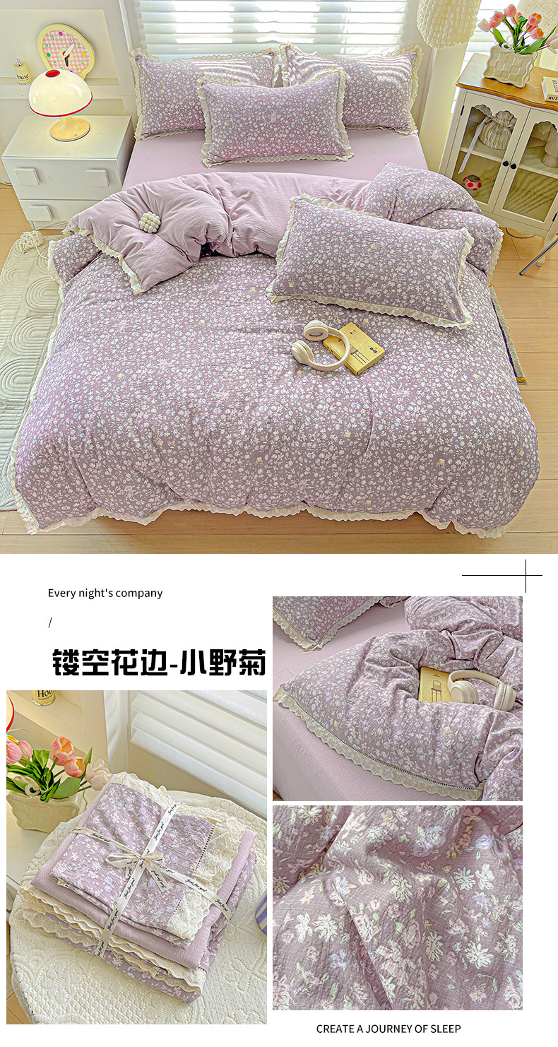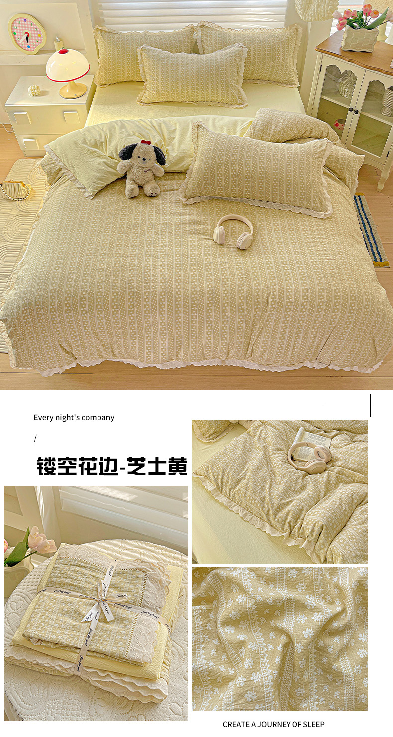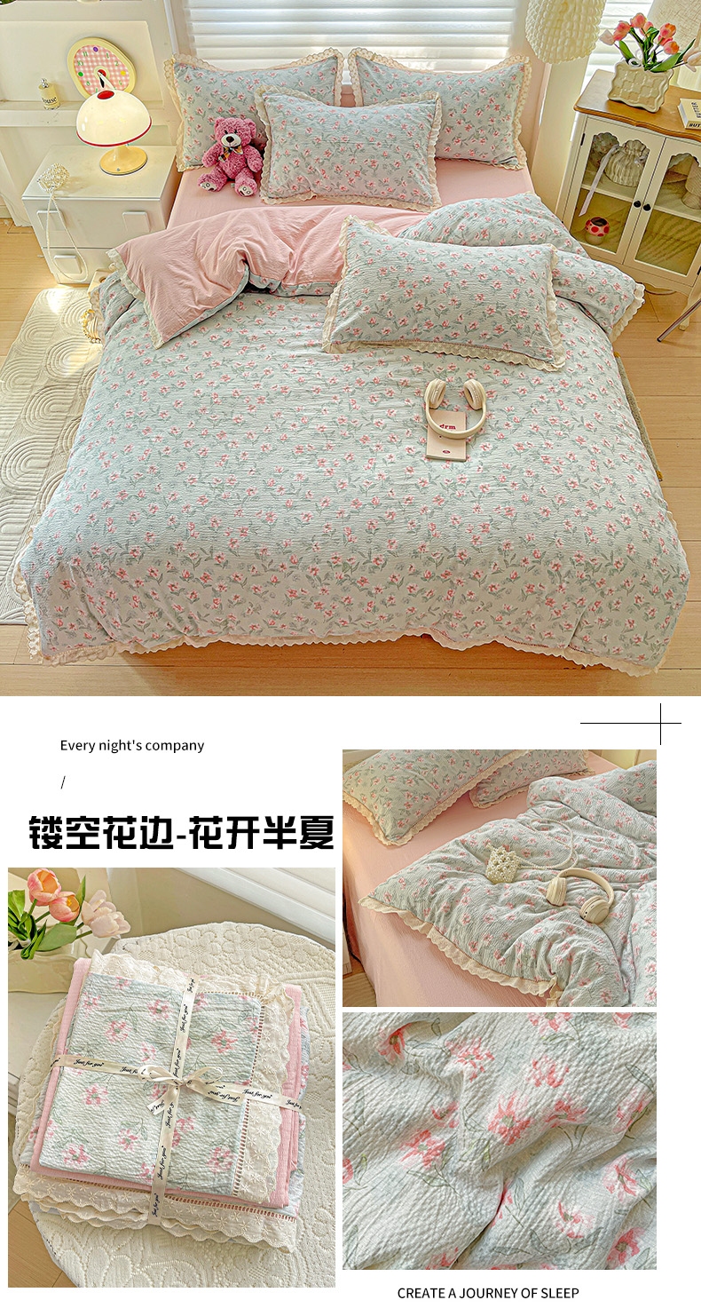 当前位置: 91家纺网 > 商品网购 > 床品套件 > 四件套 > 其它四件套 > 金梦拉家纺 2025新款提花纱布皱皱纱四件套(全棉镂空花边款) 镂空花边-花开半夏