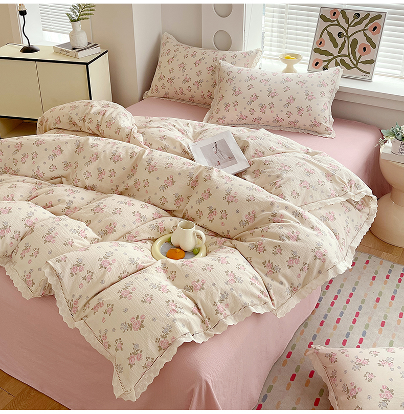 雨彤家纺 2025新款A类高克重云感皱皱双层纱全棉镂空花边款法式四件套-床拍图 望夏花艺