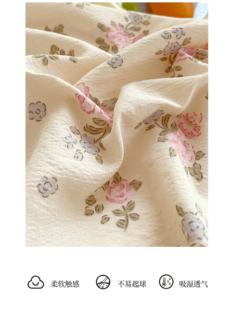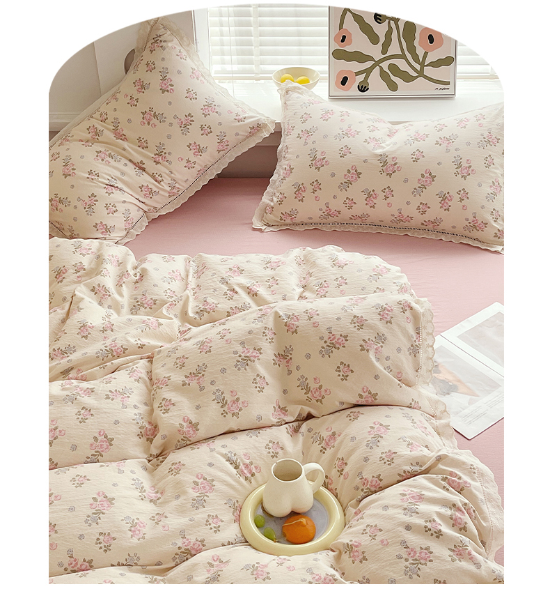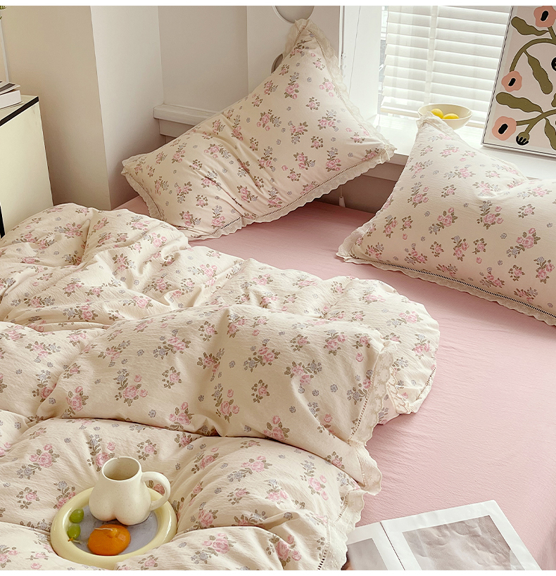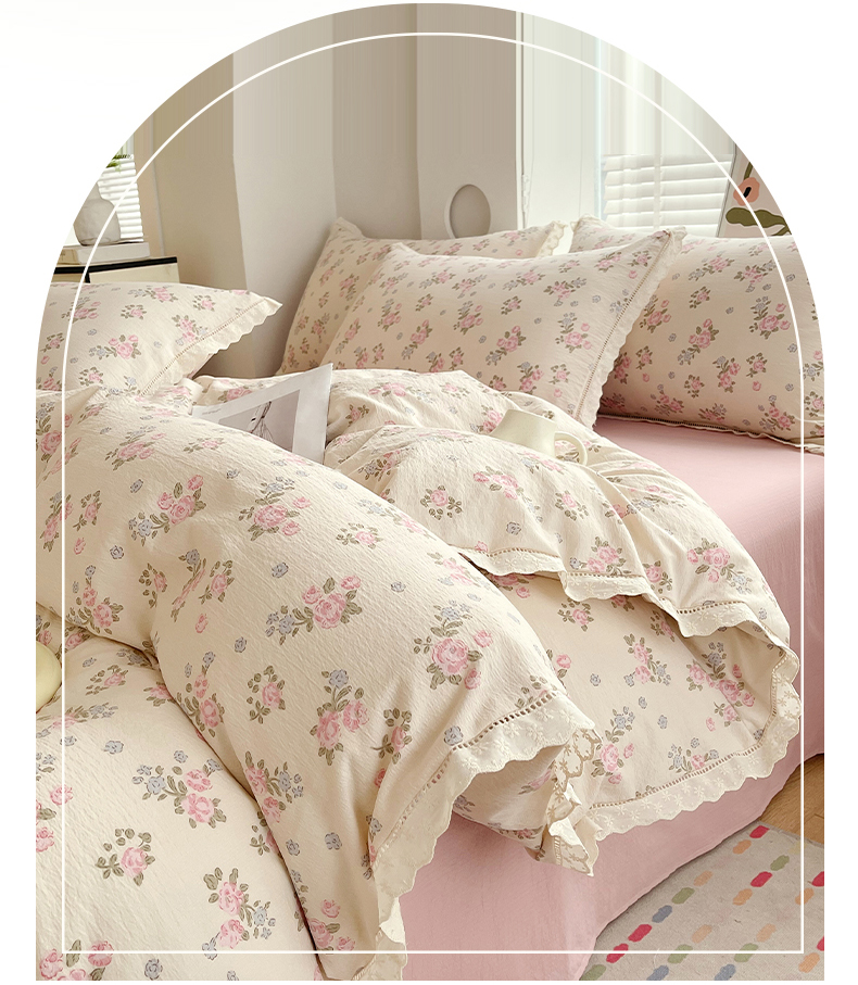 商品名称:雨彤家纺 2025新款A类高克重云感皱皱双层纱全棉镂空花边款法式四件套-床拍图 望夏花艺