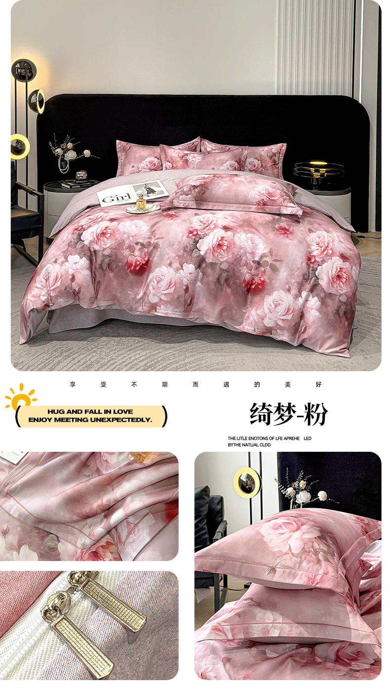 商品名称:喜四方 2025新款加厚天丝棉磨毛数码印花四件套 密林-粉