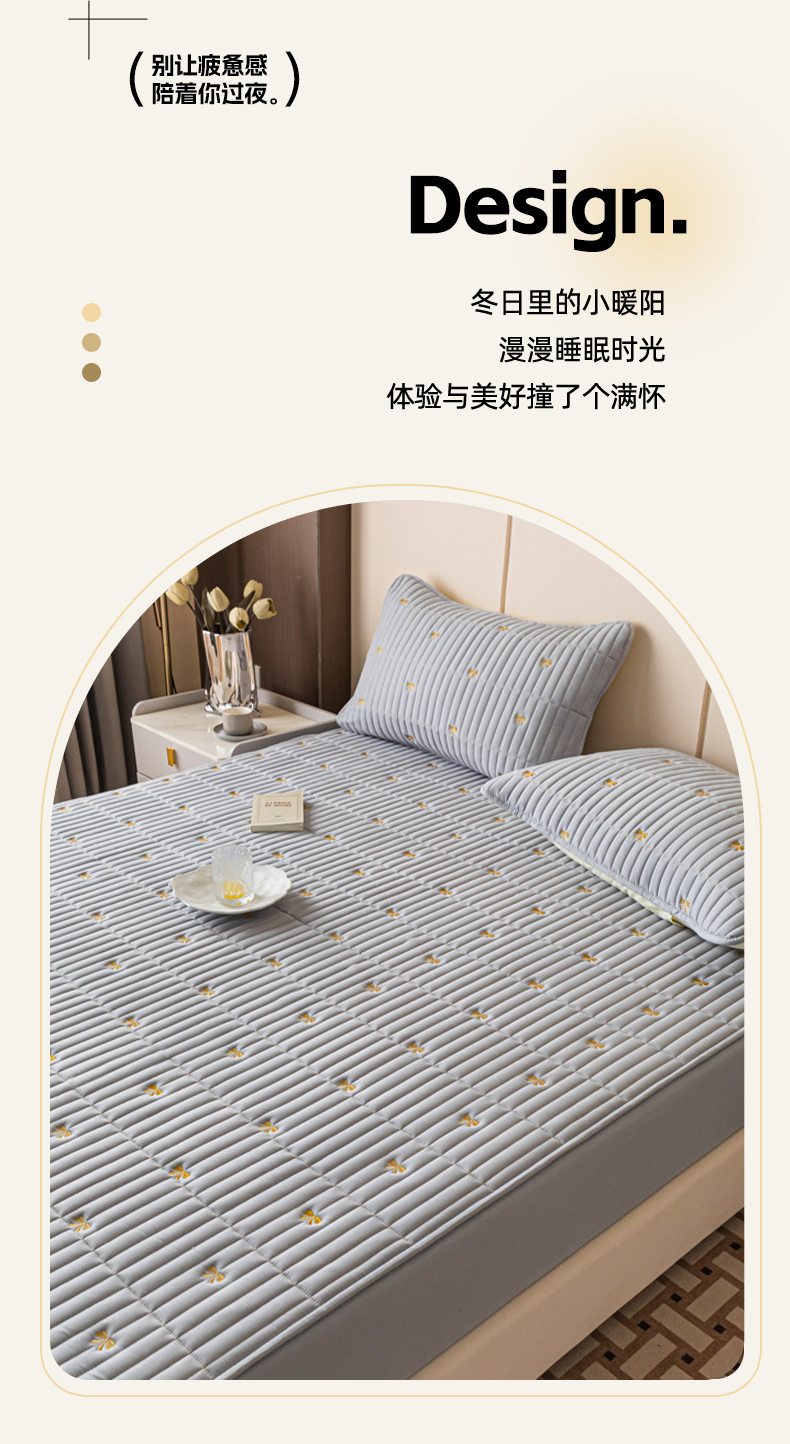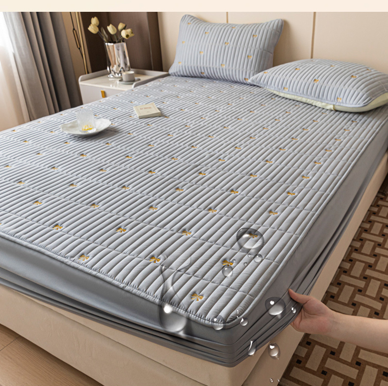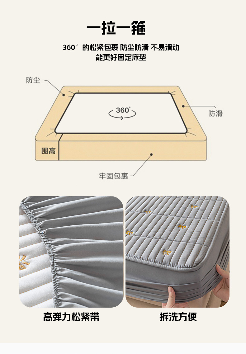 暖季家纺 2025新款A类亲肤面料夹棉绣花床笠-防水款 小蝴蝶结-灰-防水款