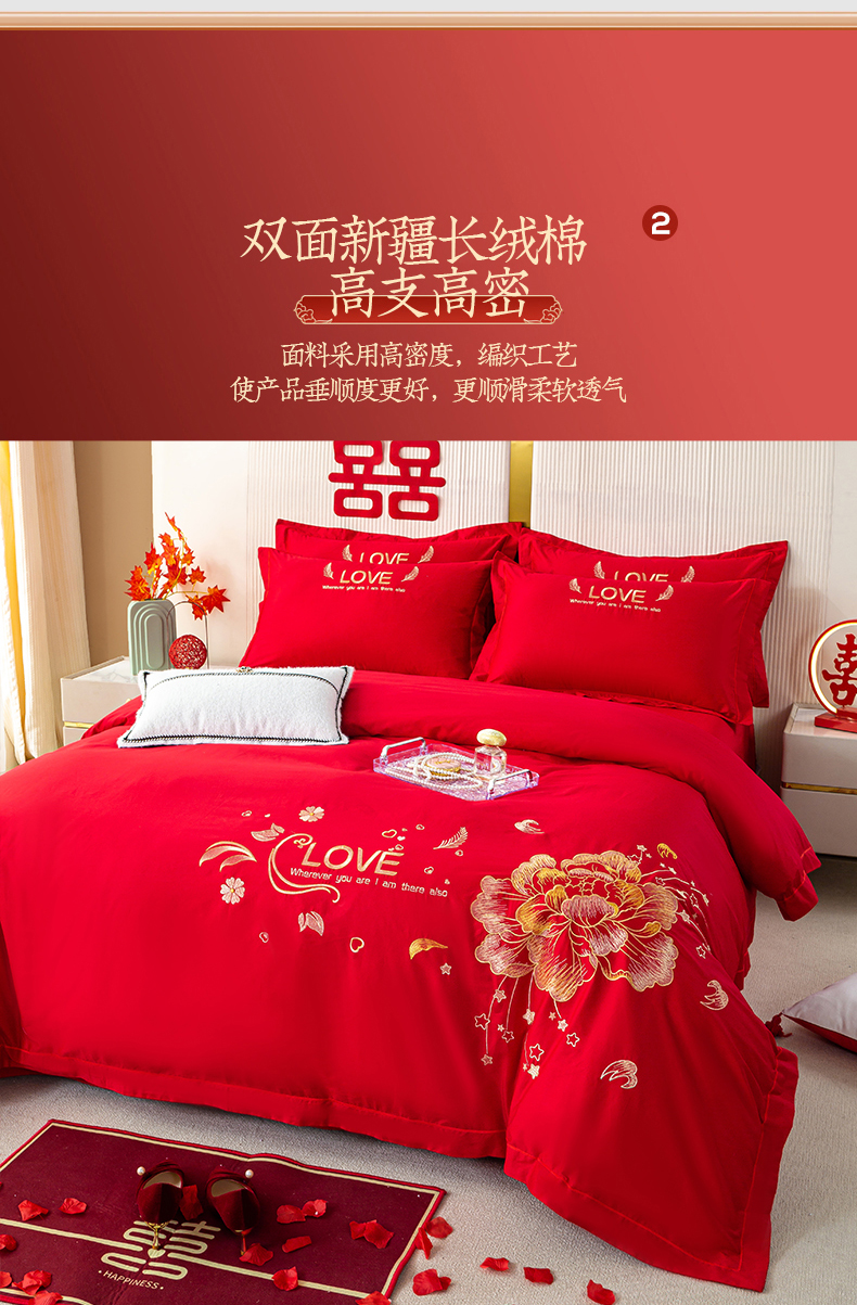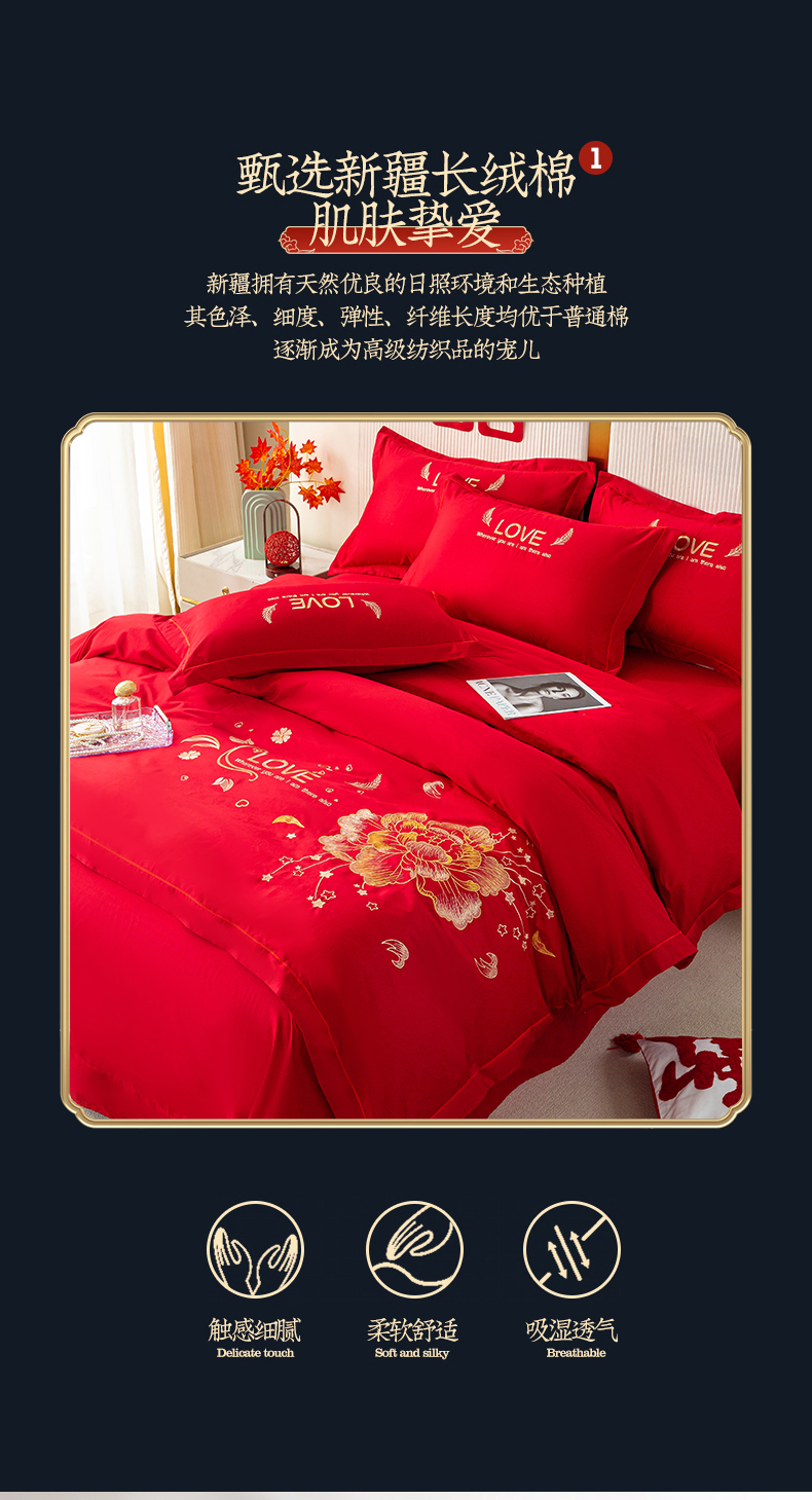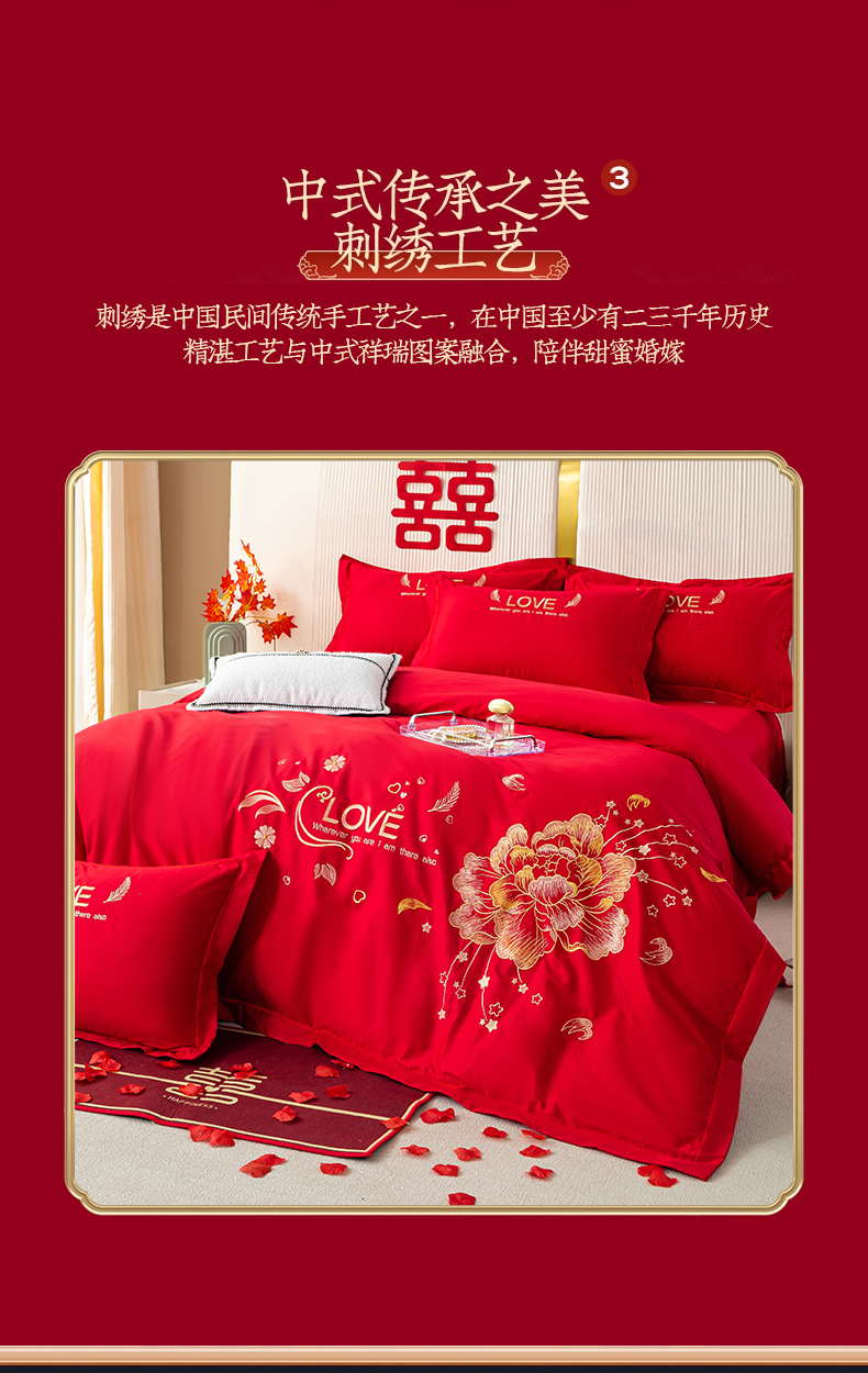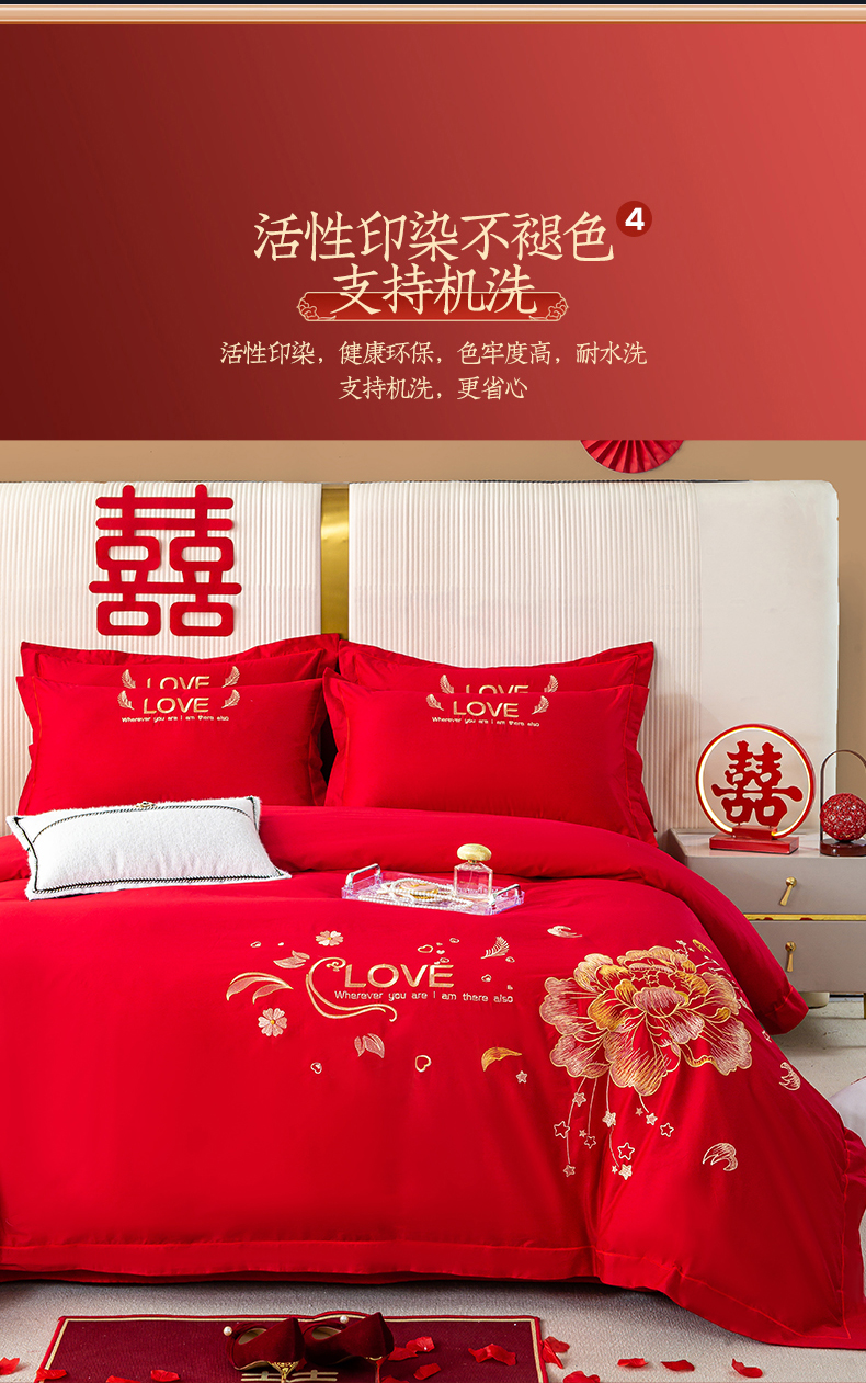 (总)银石 2024新款60新疆长绒棉大红婚庆绣花四件套,倾心一片,山河见证,心心相印,永结同心,浪漫时刻,吉祥如意,龙凤报喜