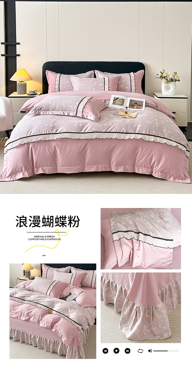 商品名称:梓之赫 2025新款斜纹棉AB床裙雪纺花边四件套 樱桃粉