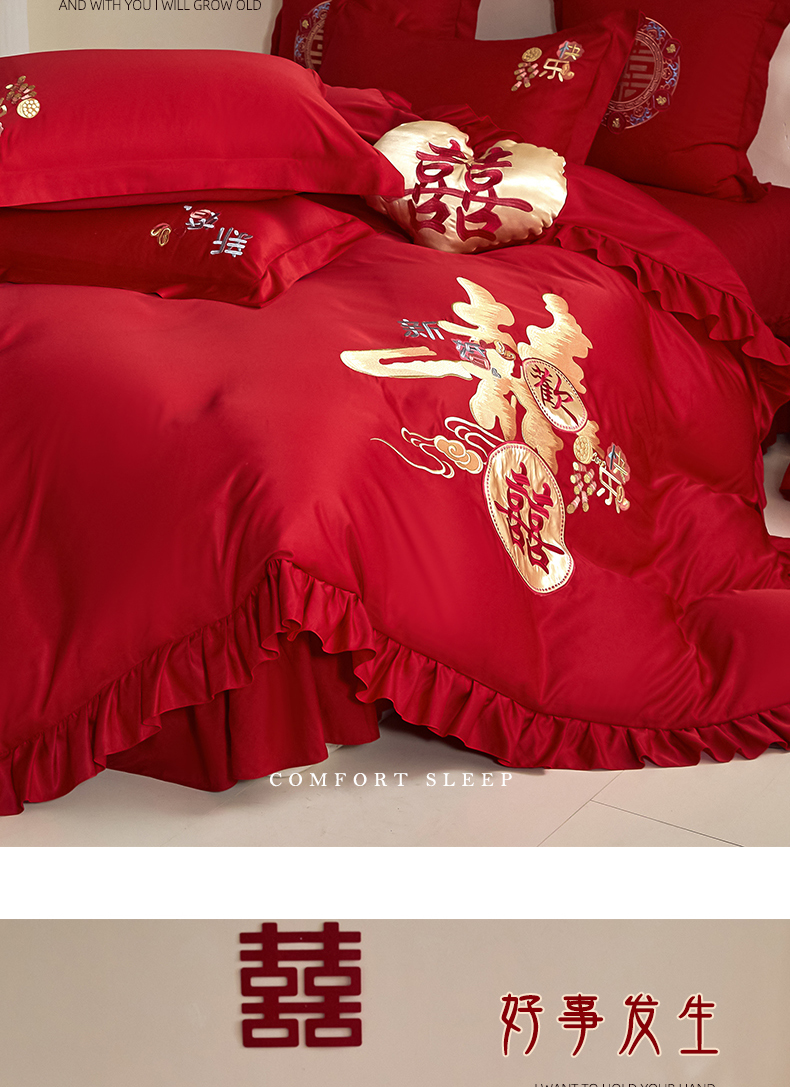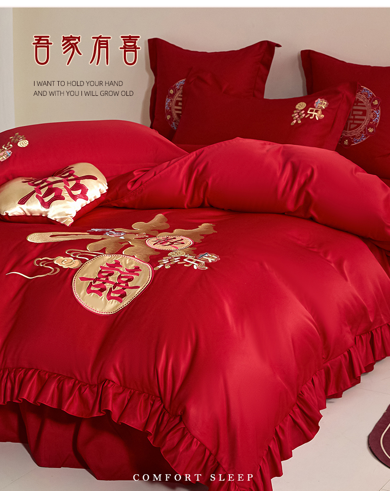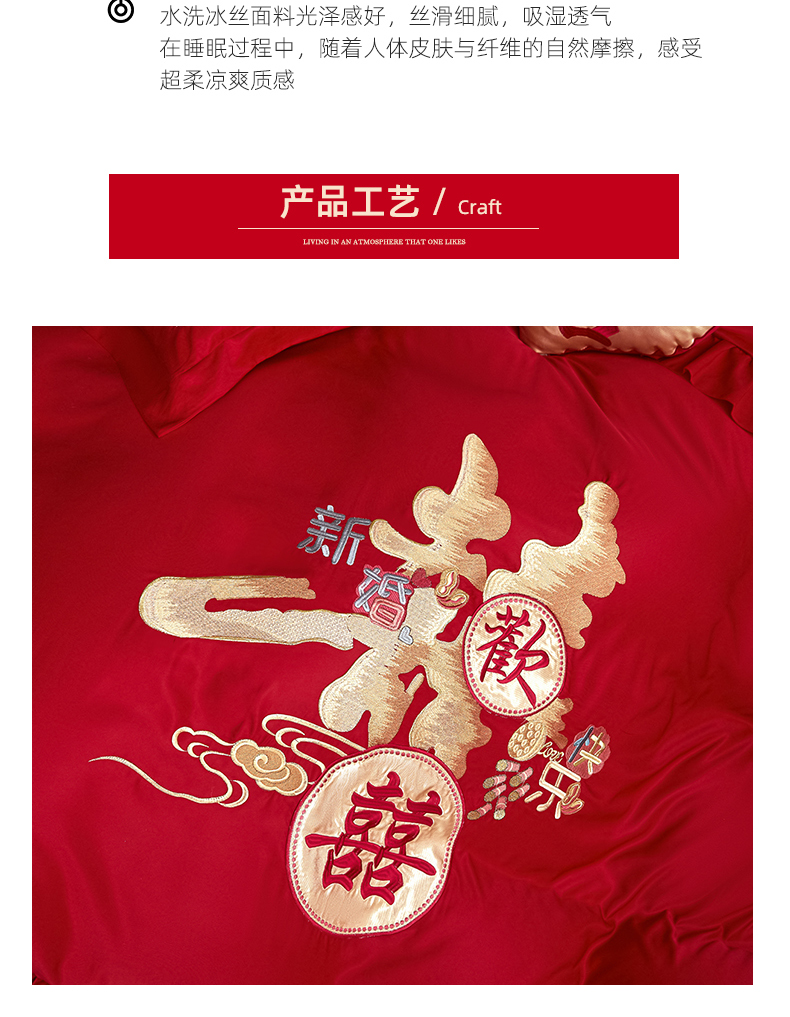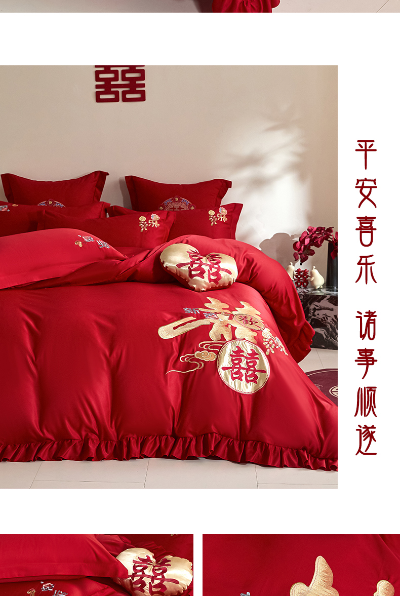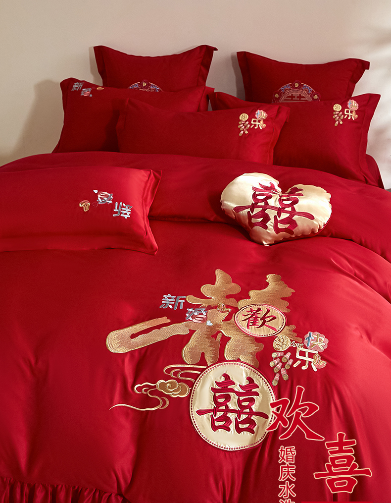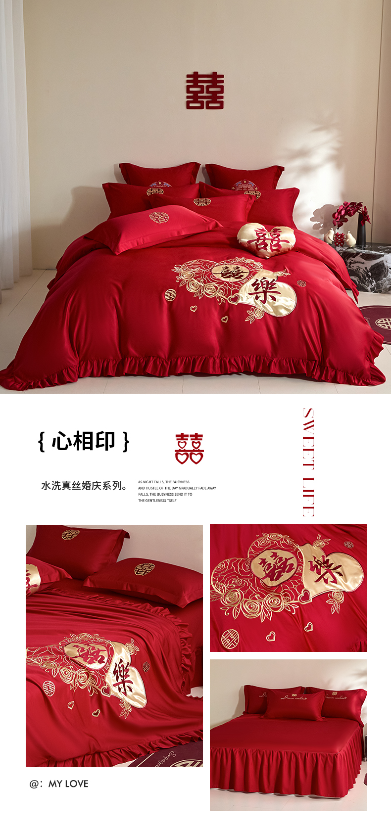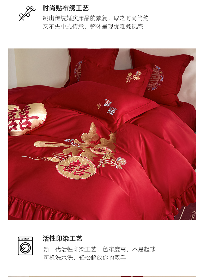 当前位置: 91家纺网 > 商品网购 > 床品套件 > 四件套 > 婚庆四件套 > 玉雅家纺 2025新款水洗冰丝刺绣床裙款婚庆四件套 床裙款-新婚快乐