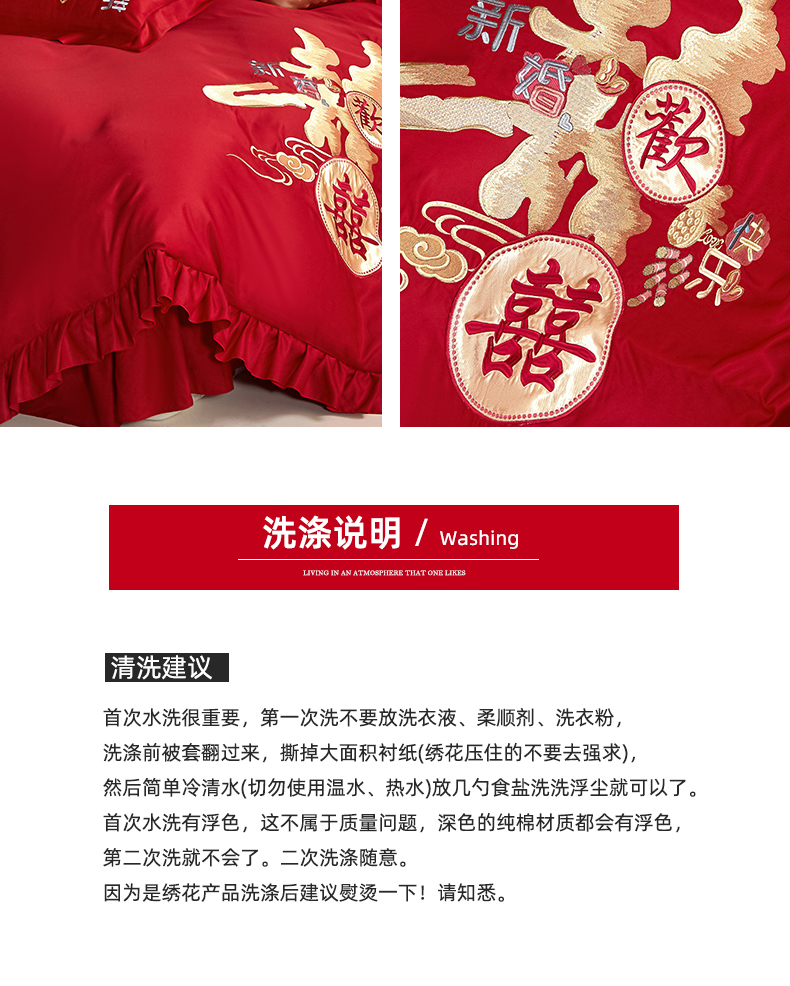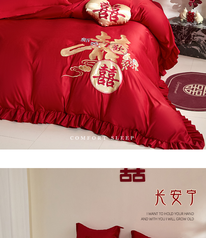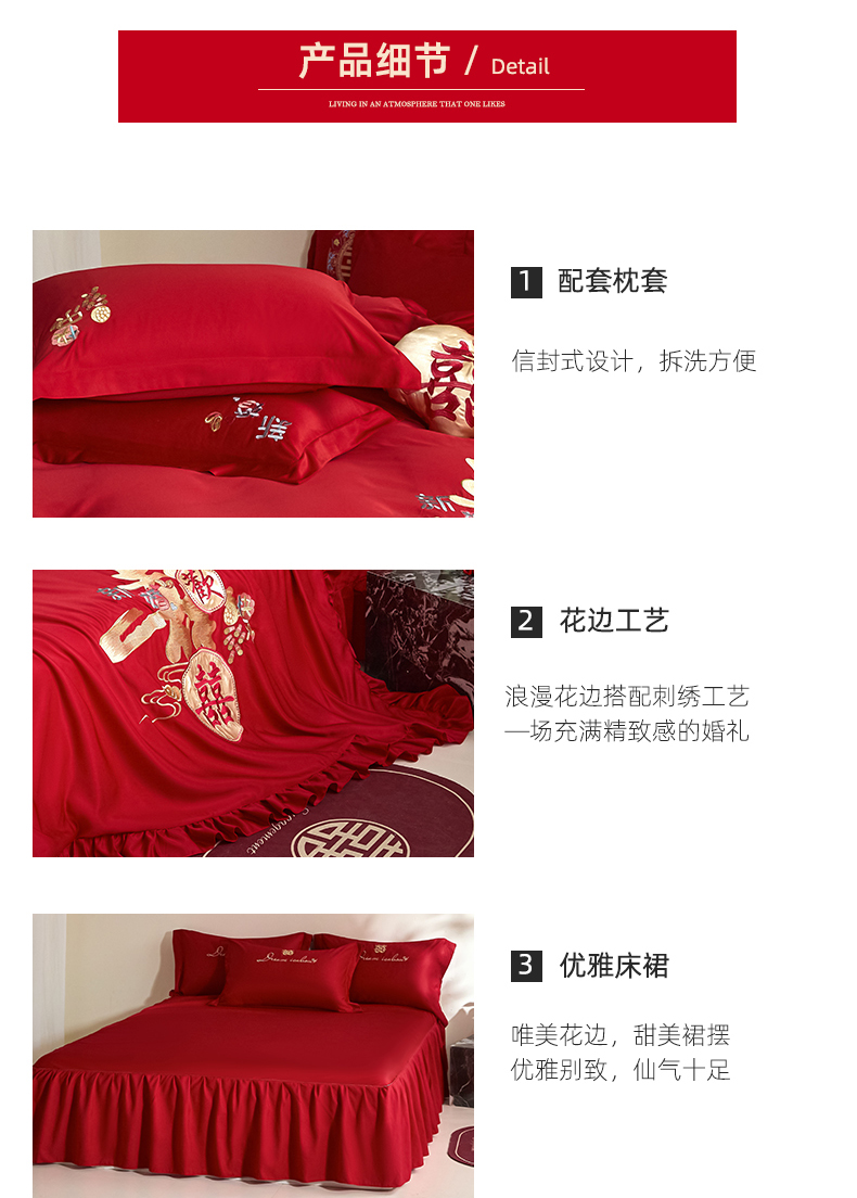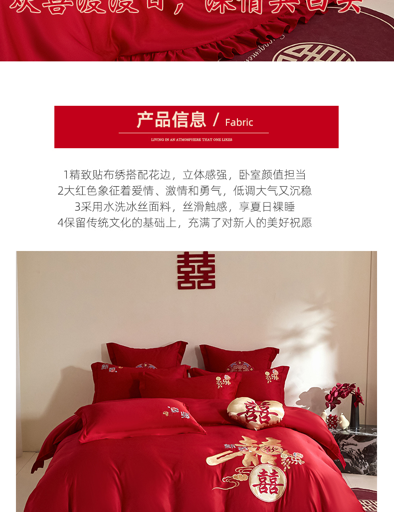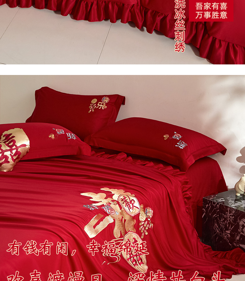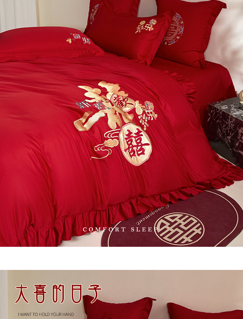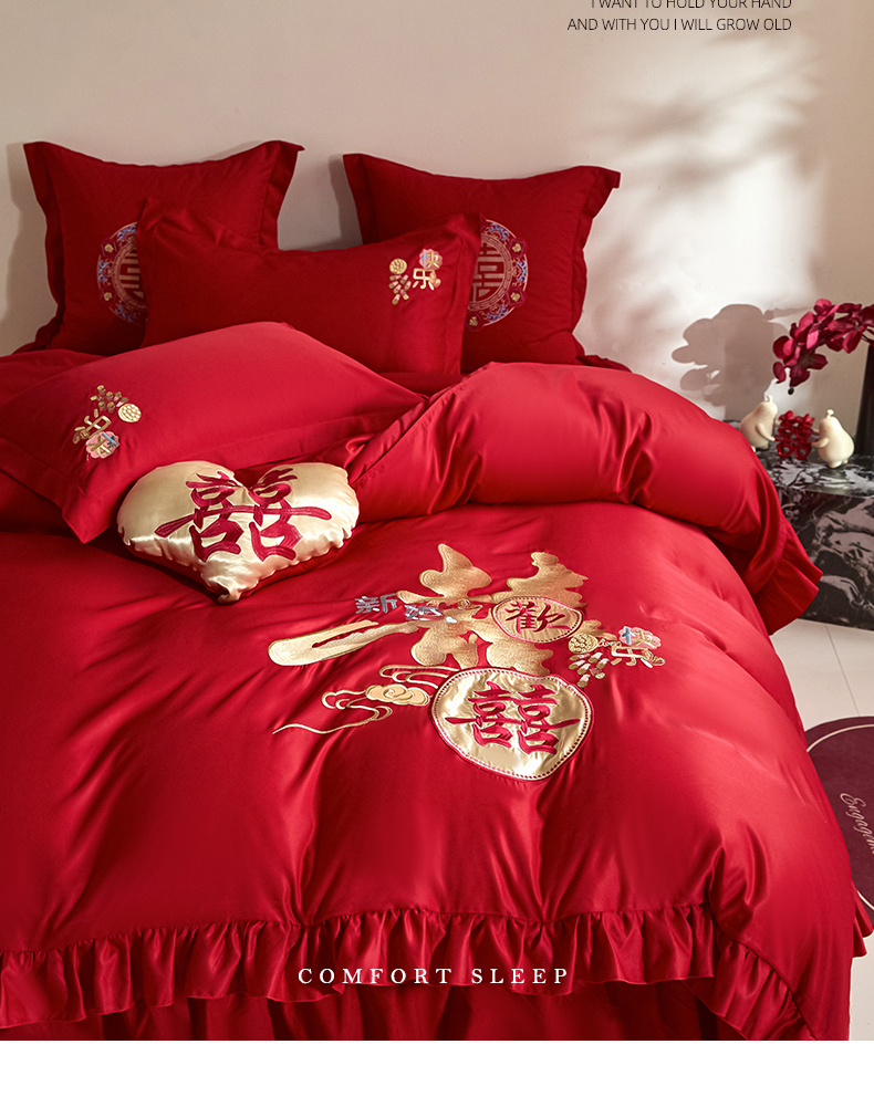 当前位置: 91家纺网 > 商品网购 > 床品套件 > 四件套 > 婚庆四件套 > 玉雅家纺 2025新款水洗冰丝刺绣床裙款婚庆四件套 床裙款-新婚快乐