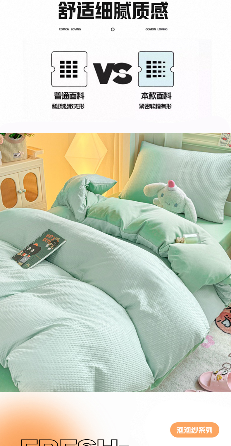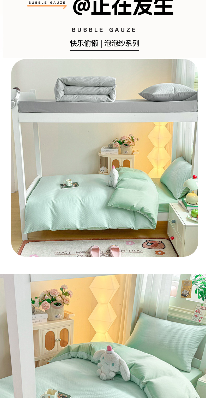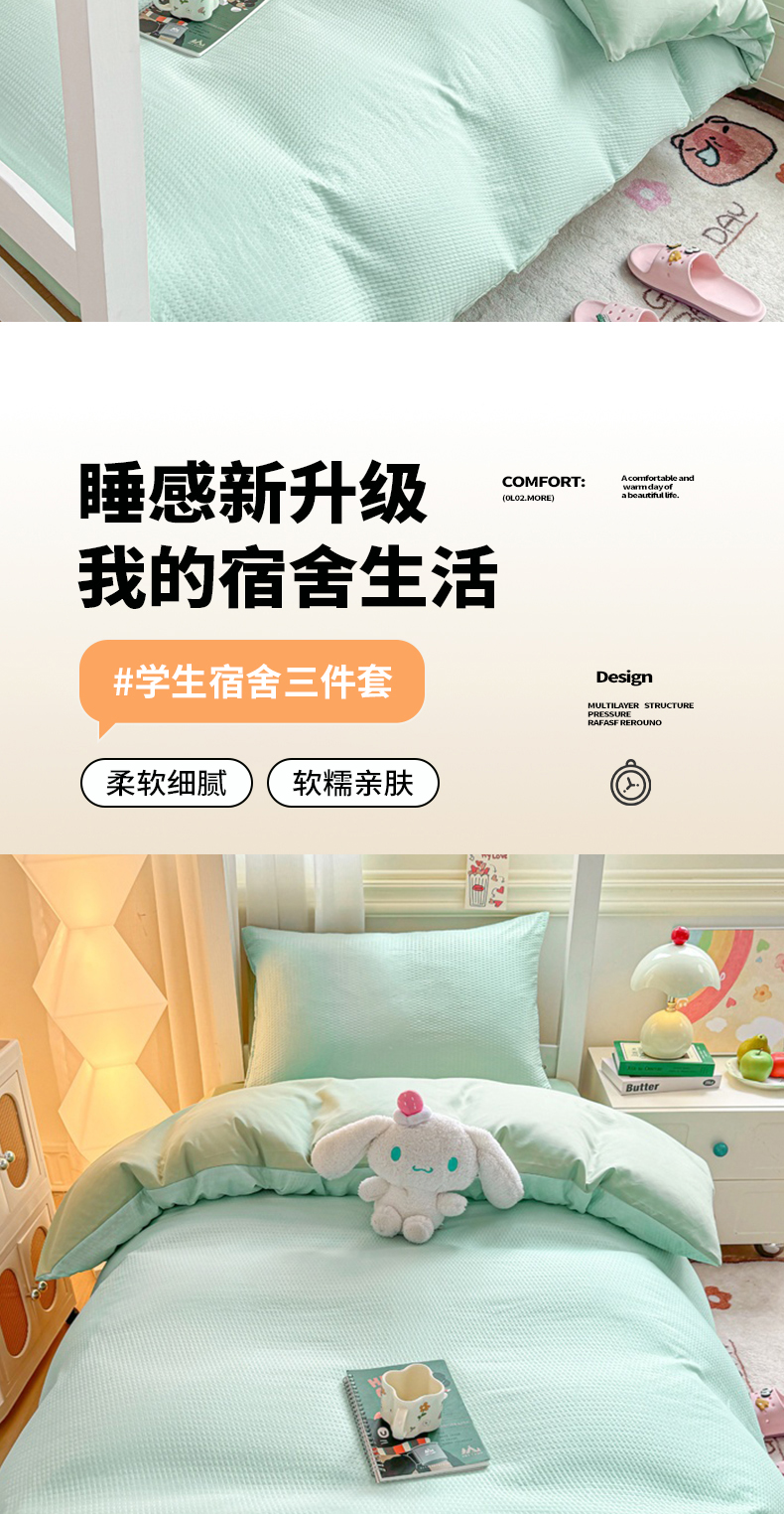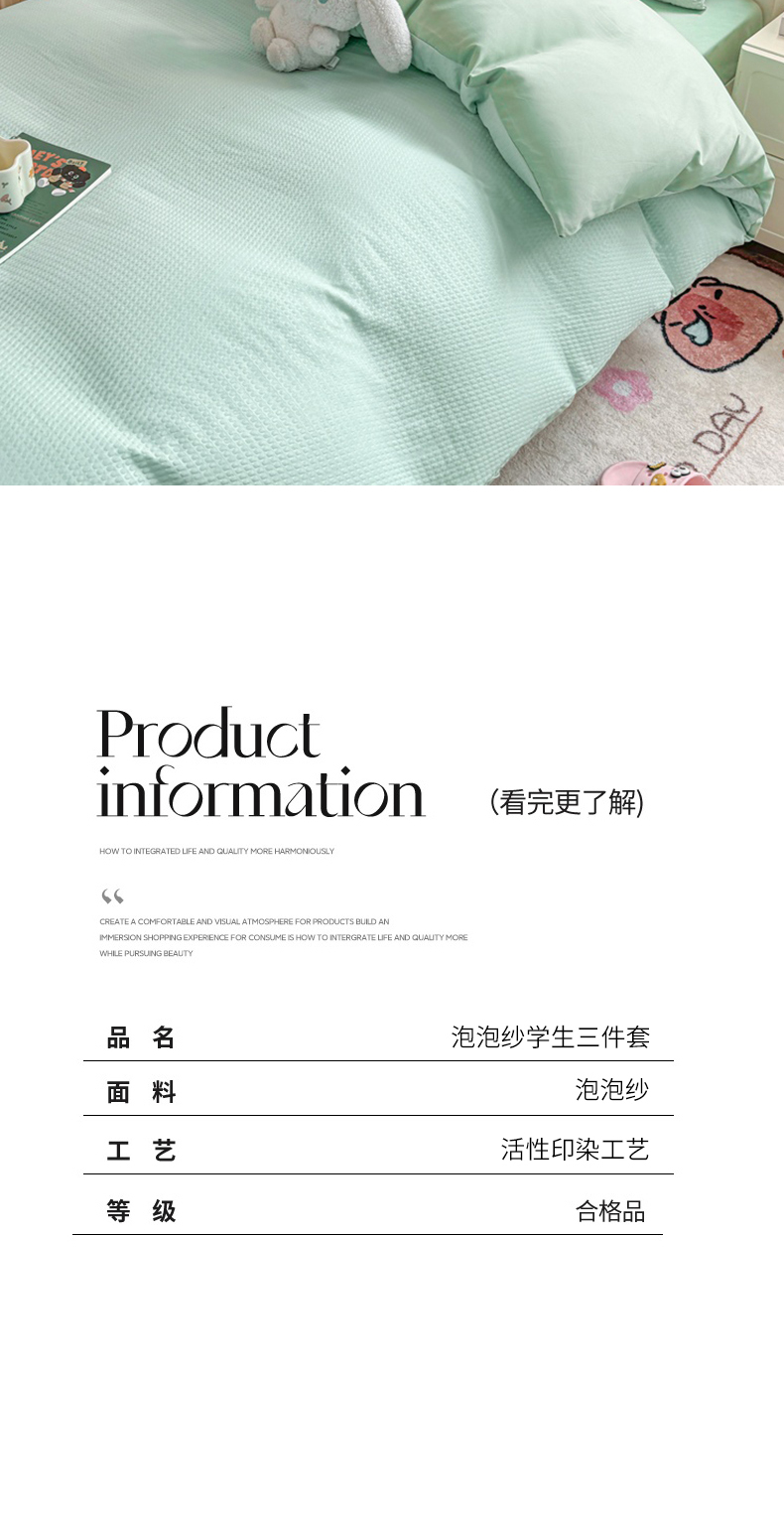 商品名称:麒东家纺 2025新款圆豆纱华夫格学生三件套 绿色
