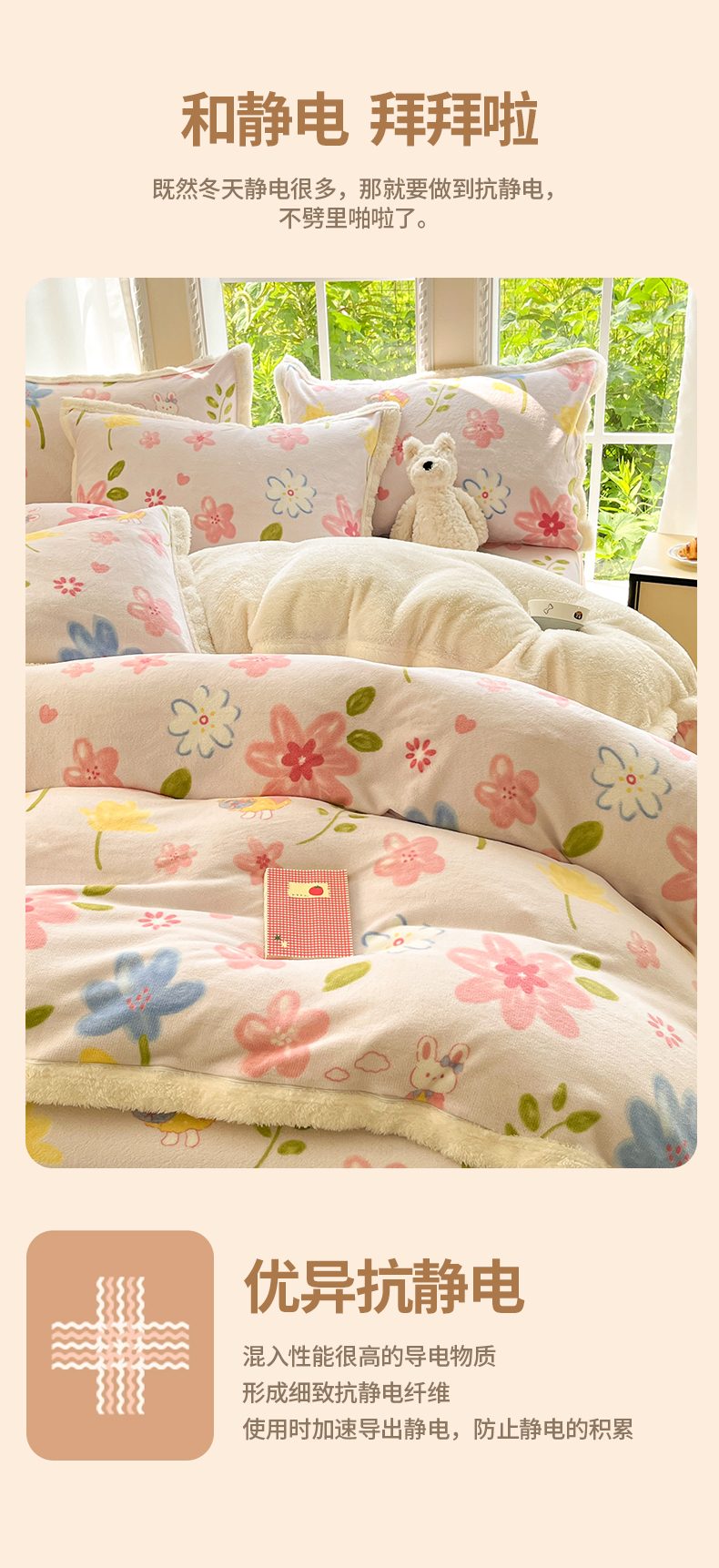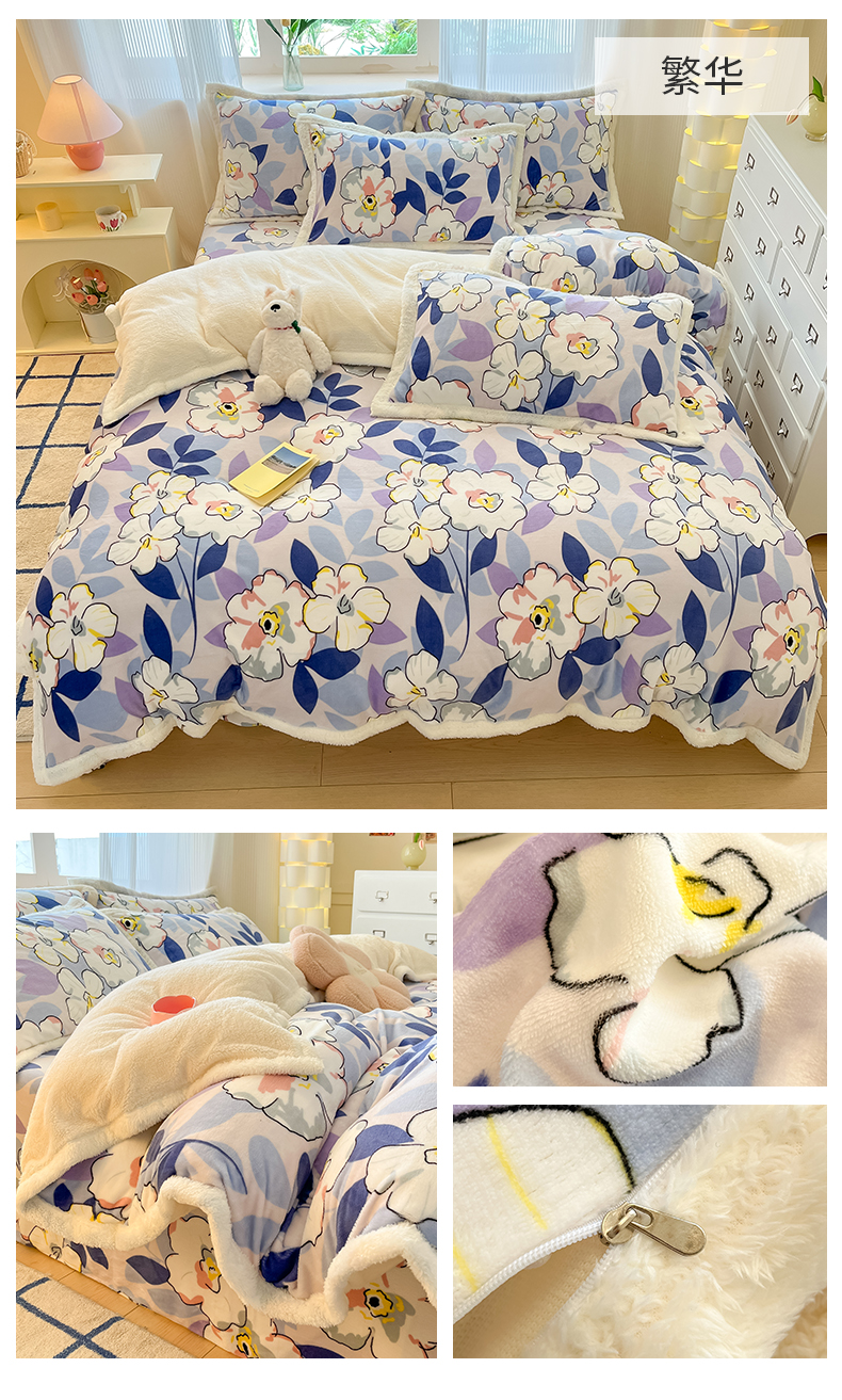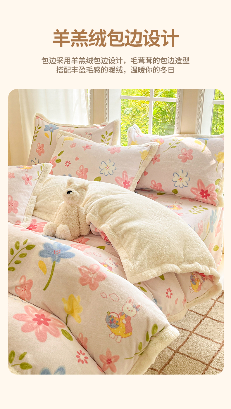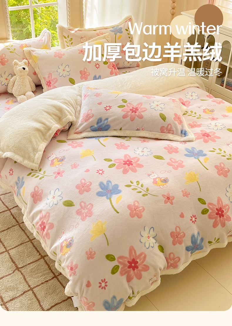 当前位置: 91家纺网 > 商品网购 > 床品套件 > 四件套 > 羊羔绒四件套 > 娜朵家纺 2025新款加厚包边羊羔绒印花四件套 花花世界
