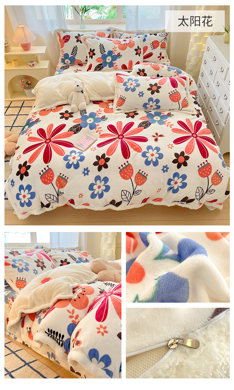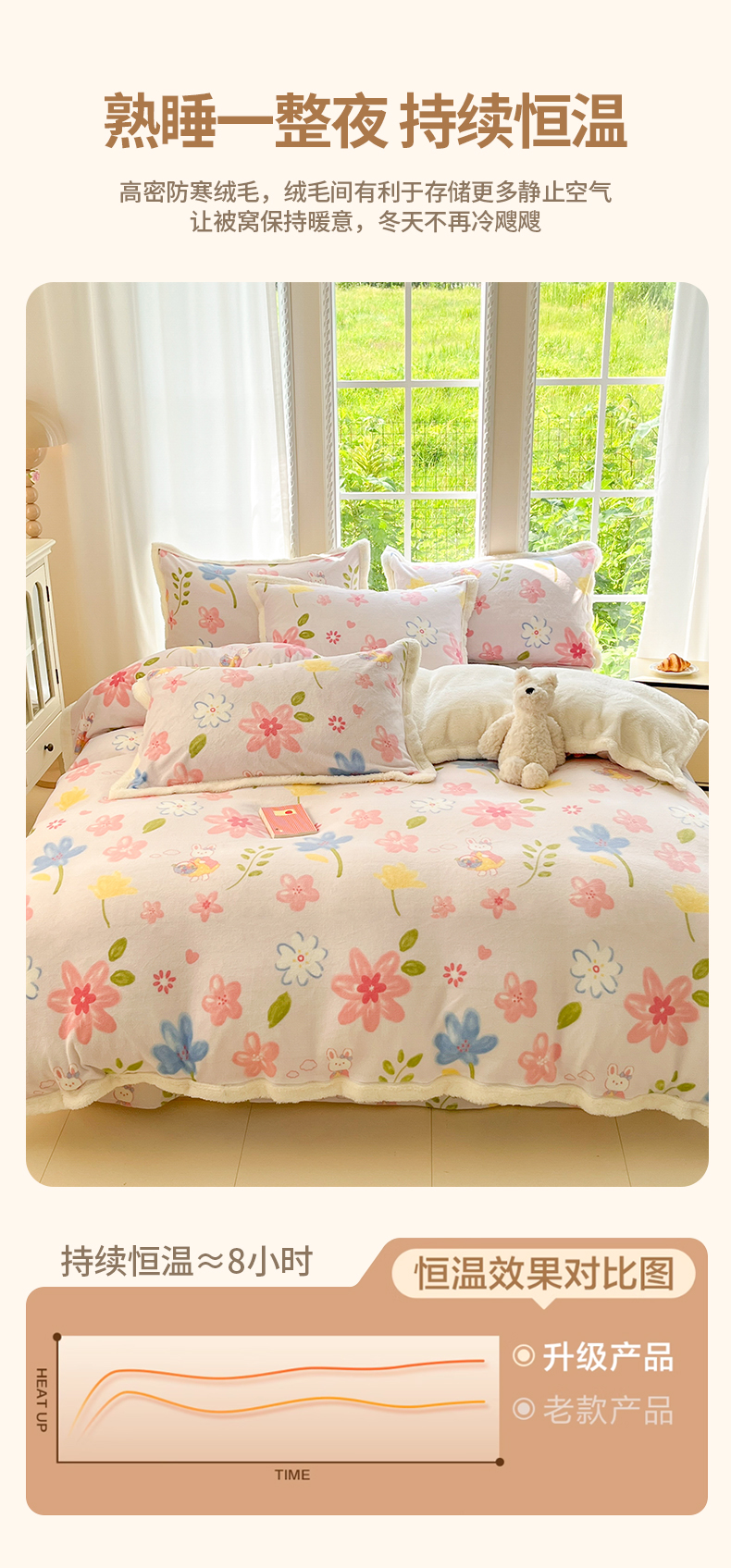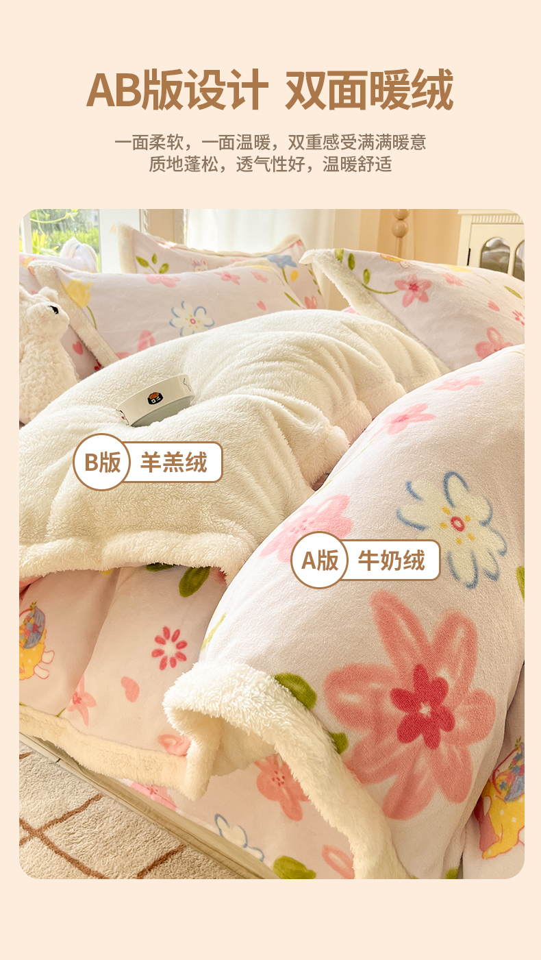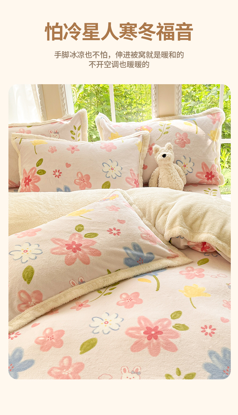 当前位置: 91家纺网 > 商品网购 > 床品套件 > 四件套 > 羊羔绒四件套 > 娜朵家纺 2025新款加厚包边羊羔绒印花四件套 花花世界