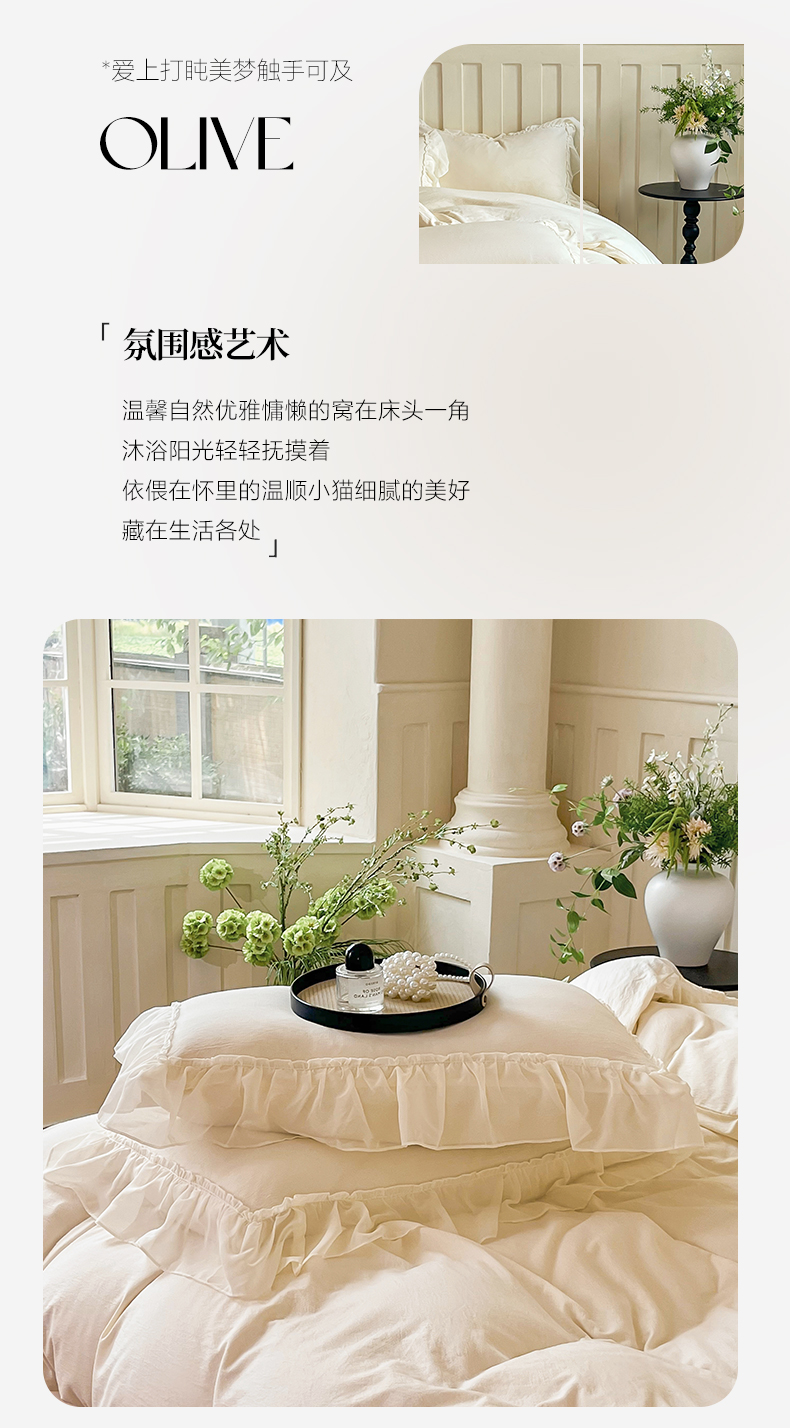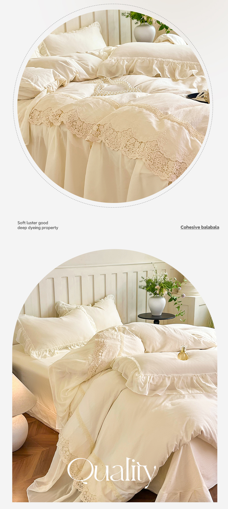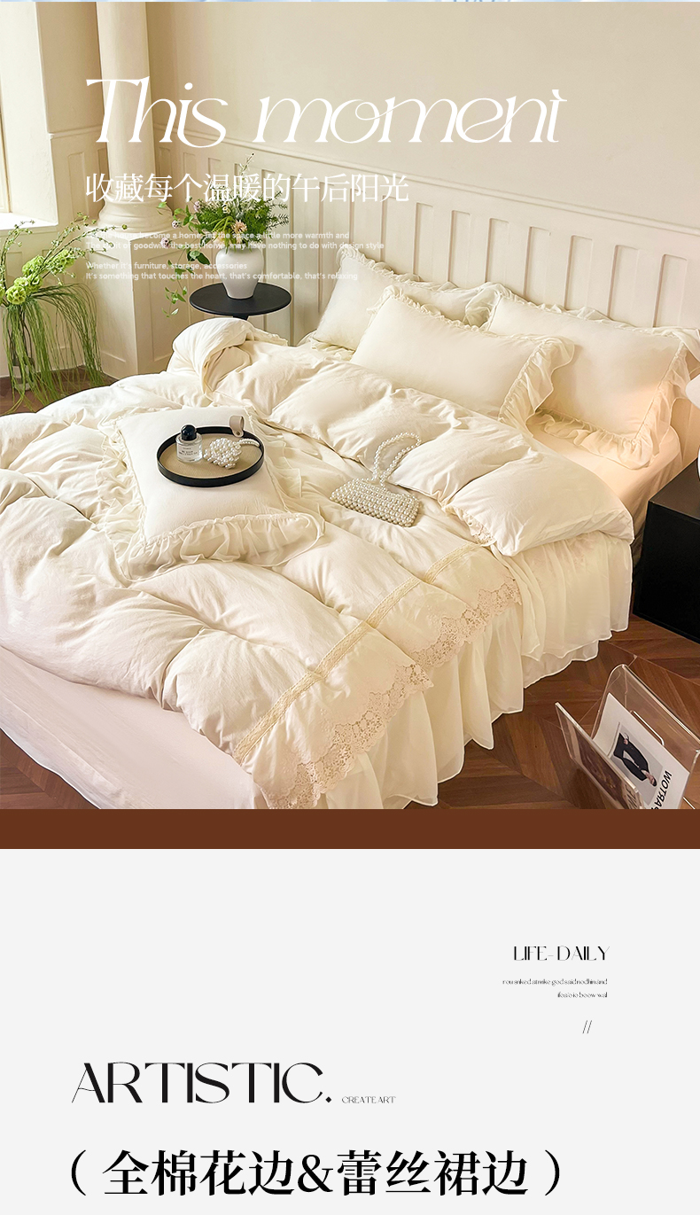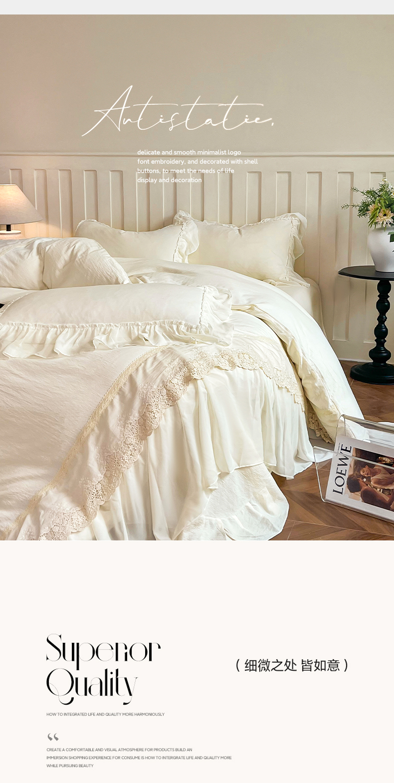 庭笙 2025新款法式刺绣花边双层蕾丝裙边梦幻纱四件套-漫调小城 米白