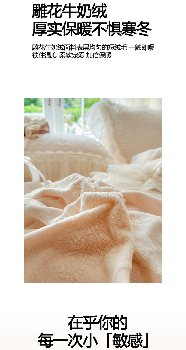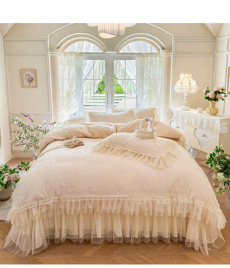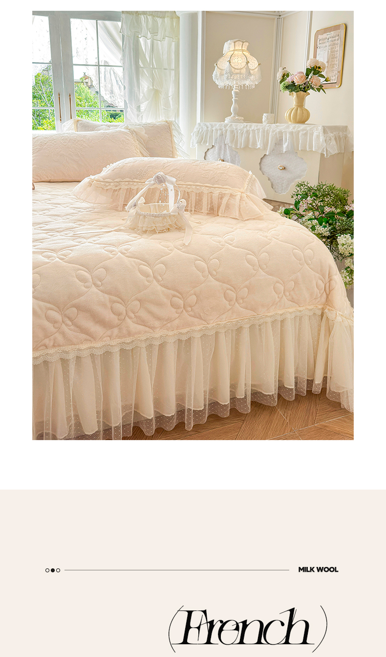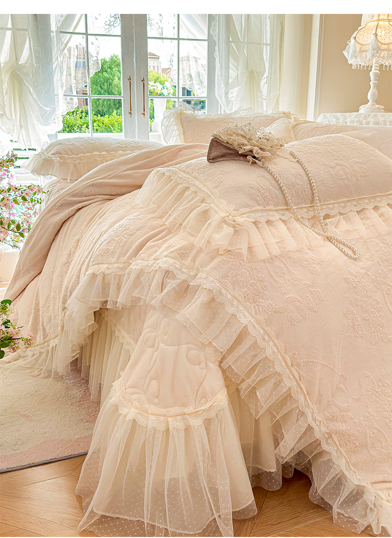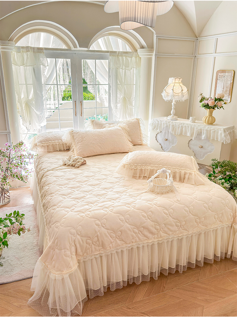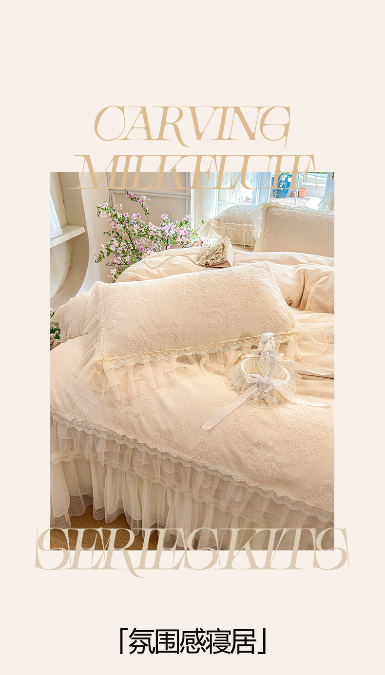 商品名称:虹星家纺 2025新款法式雕花牛奶绒花边床盖四件套-星光碟影 星光蝶影-浅米白
