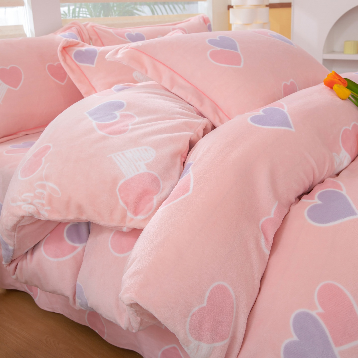 优姿家纺 2025新款加厚全消光牛奶绒印花四件套 心心相恋