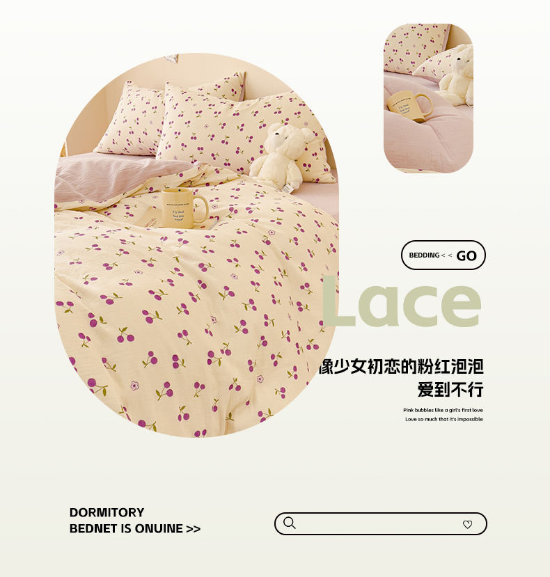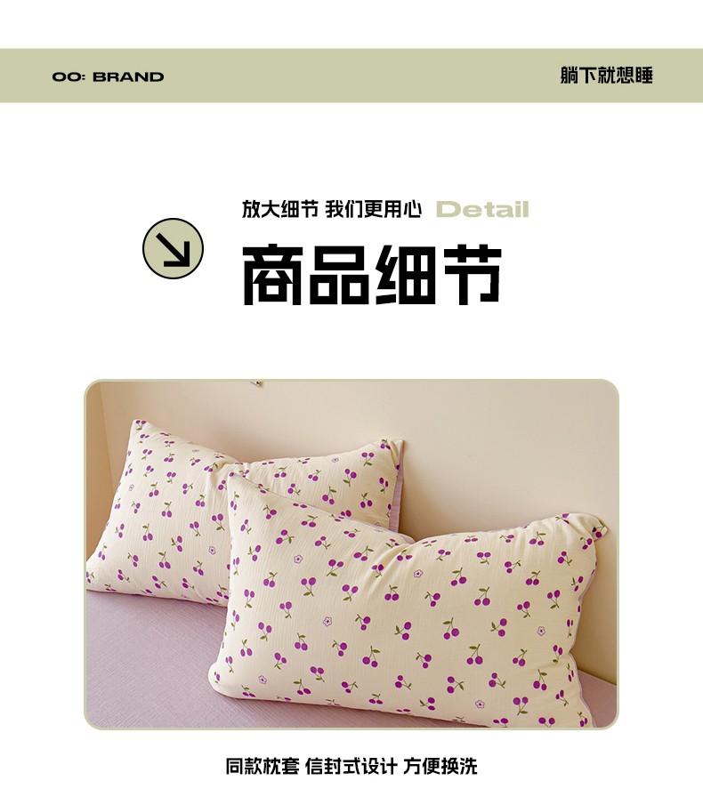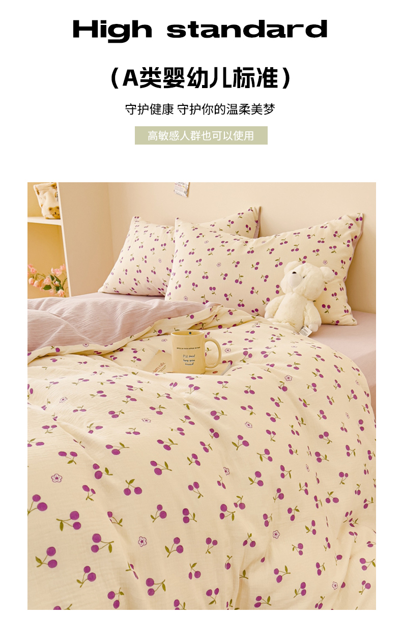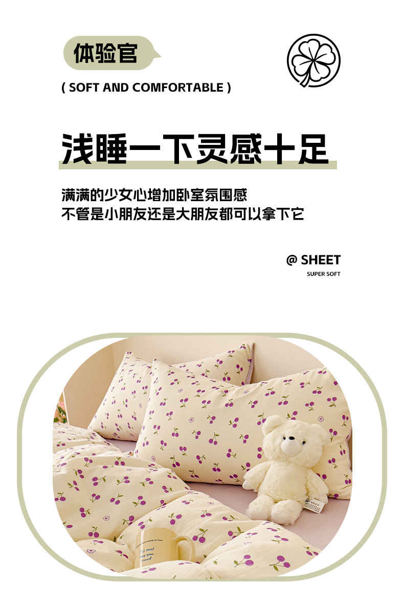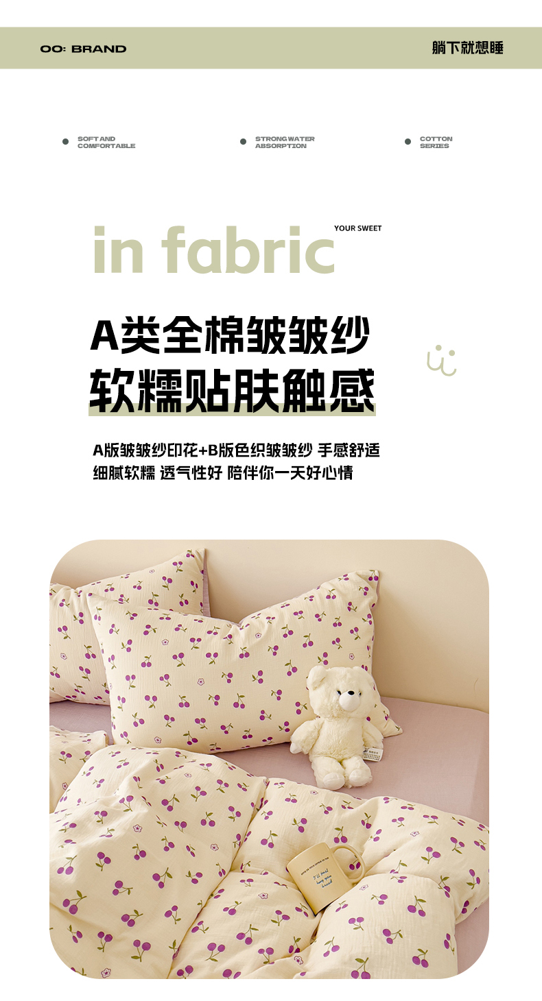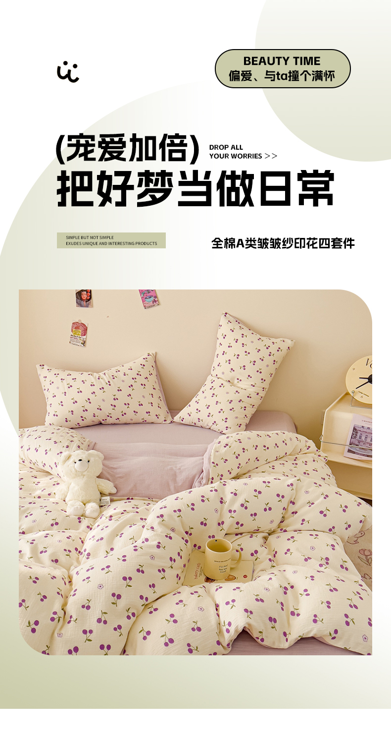 商品名称:木楌家居 2025春夏新品全棉A类皱皱纱印花四件套 樱桃