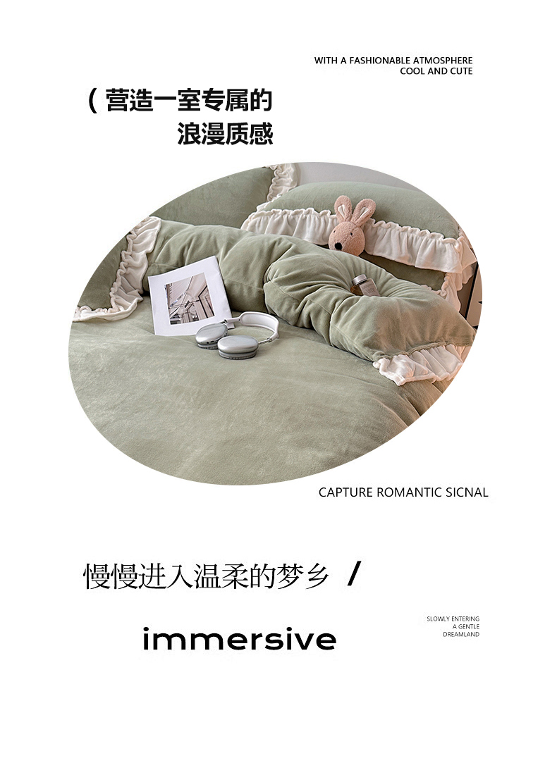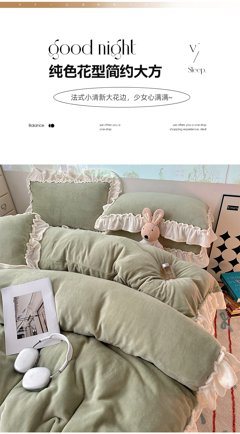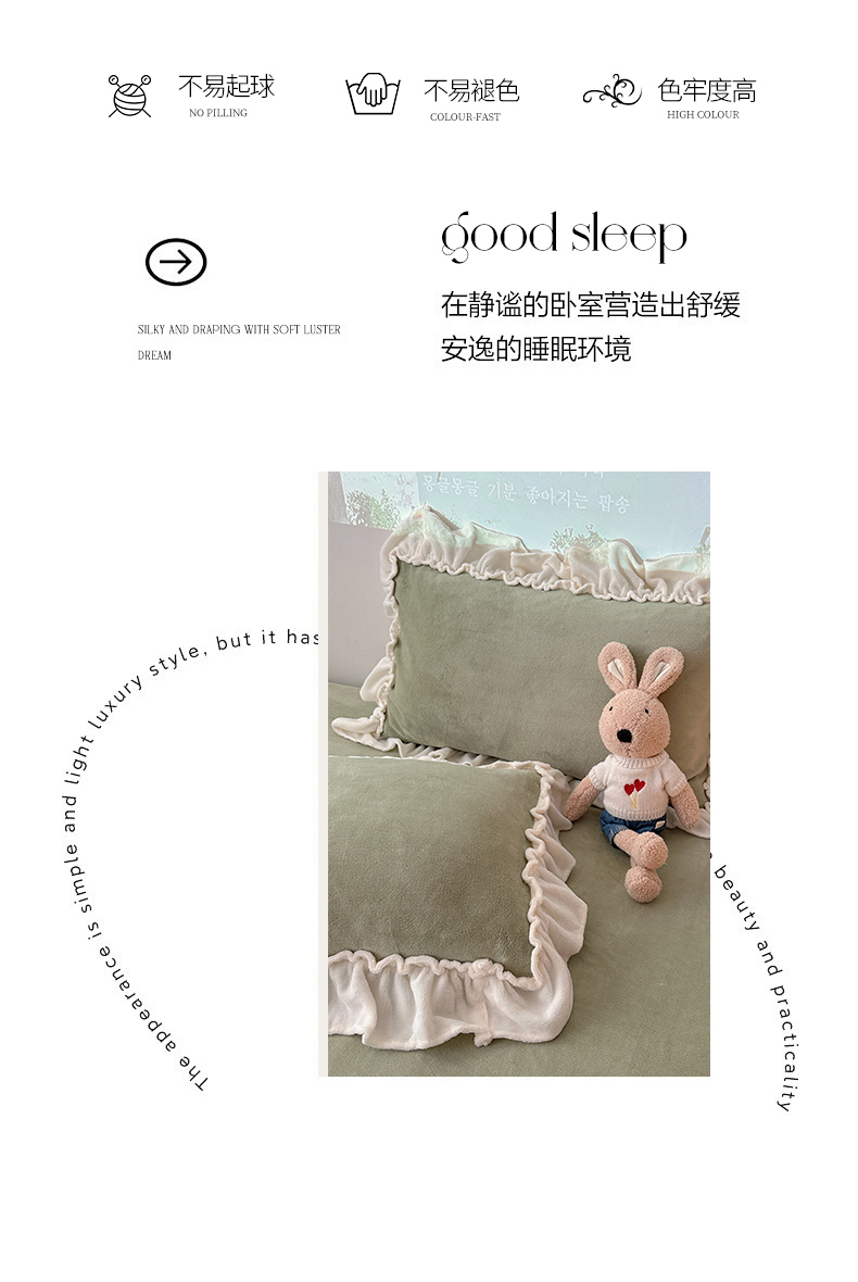 当前位置: 91家纺网 > 商品网购 > 床品套件 > 四件套 > 牛奶绒四件套 > 六巷胡同 2025新款A类法式小清新纯色牛奶绒花边款四件套 花边款-浅灰绿