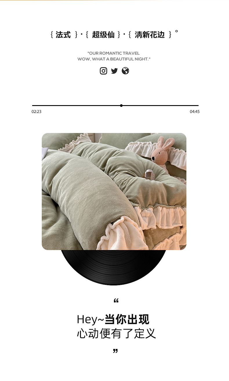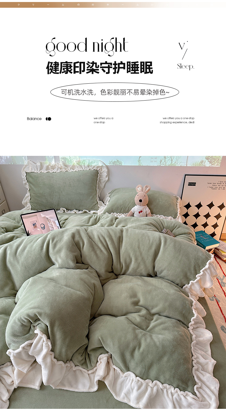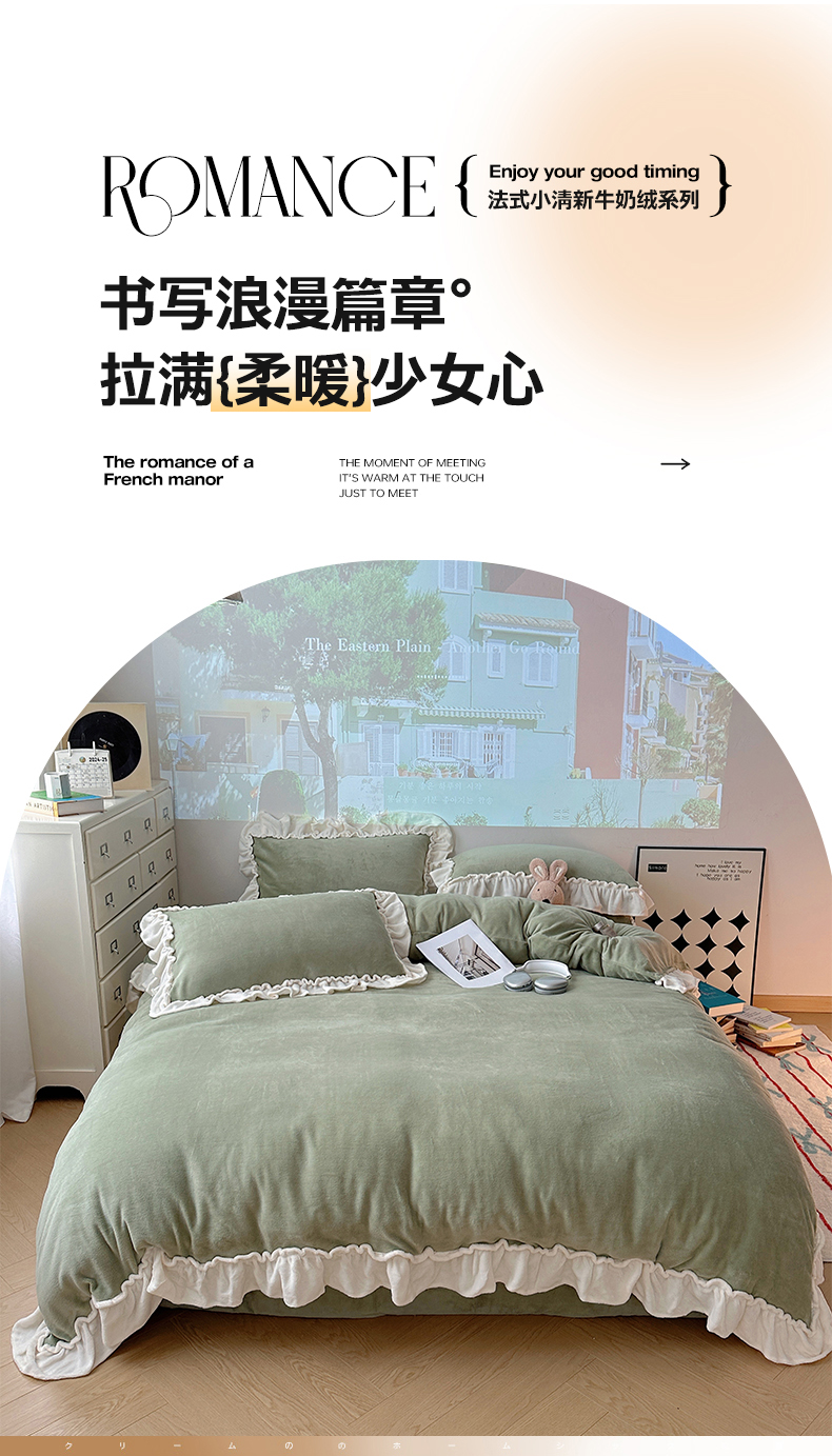 当前位置: 91家纺网 > 商品网购 > 床品套件 > 四件套 > 牛奶绒四件套 > 六巷胡同 2025新款A类法式小清新纯色牛奶绒花边款四件套 花边款-浅灰绿