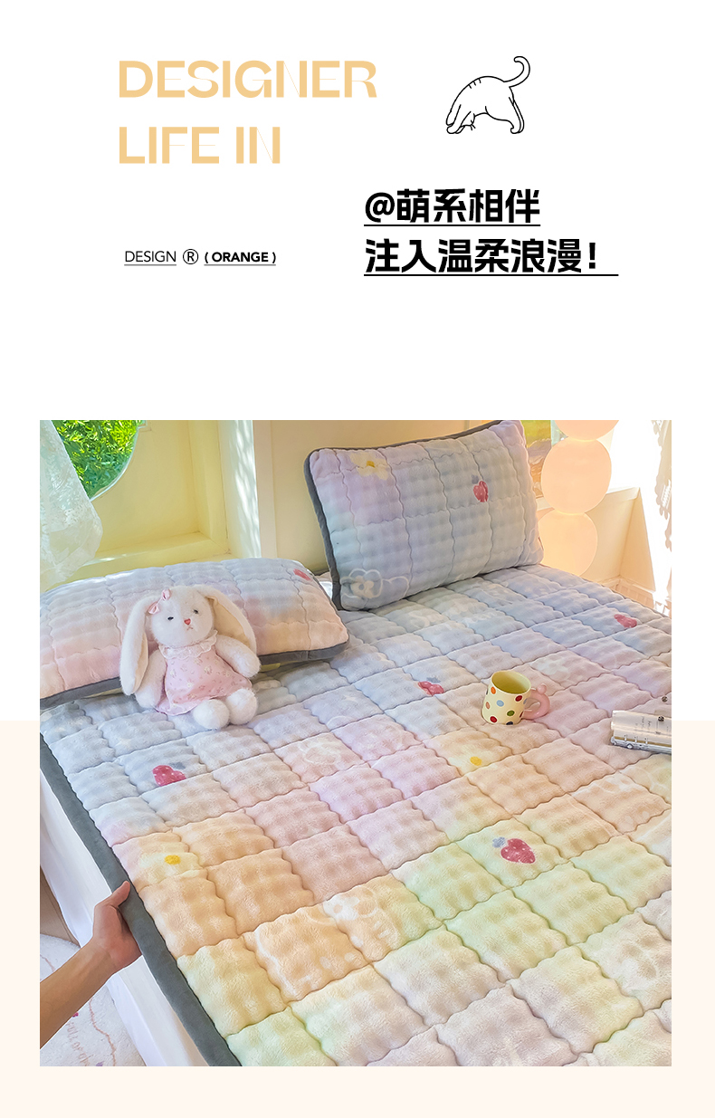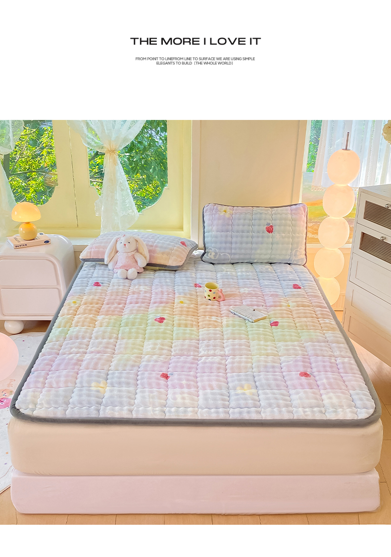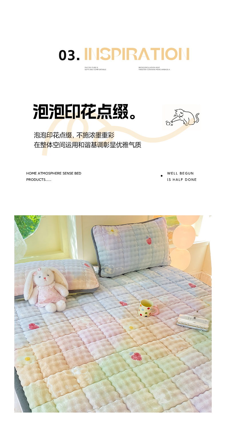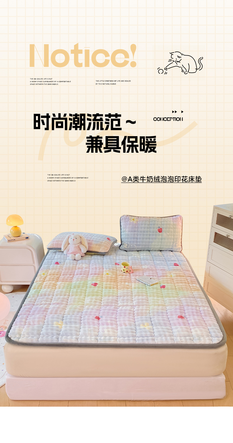 • 91家纺网 家纺一手货源 找家纺 眠势力 2025新款牛奶绒泡泡床垫加绒仿兔毛绒床褥子秋冬保暖珊瑚绒夹棉床护垫 草莓KT