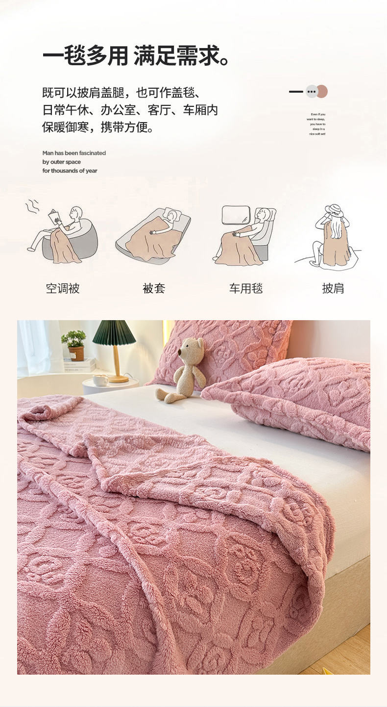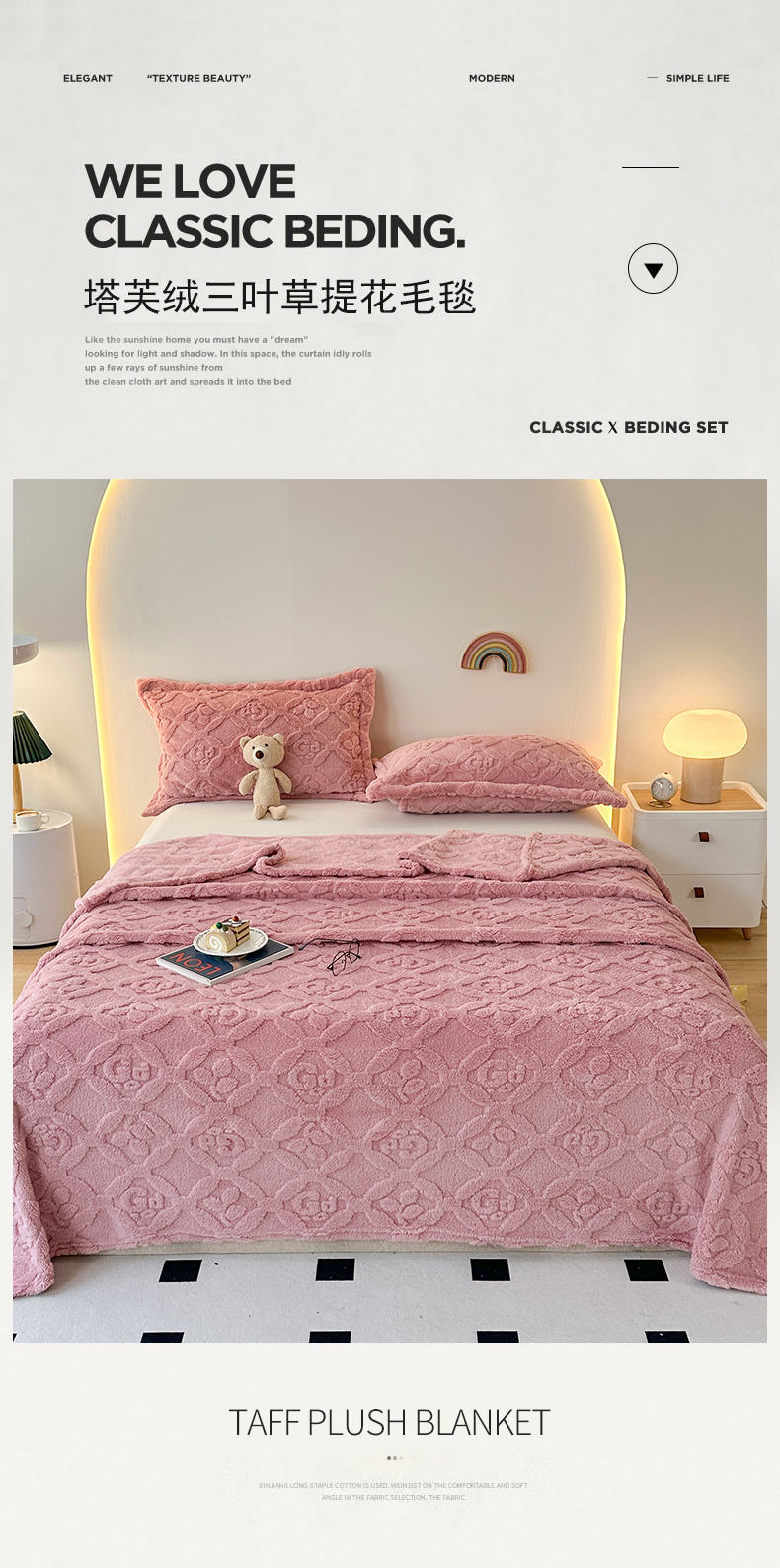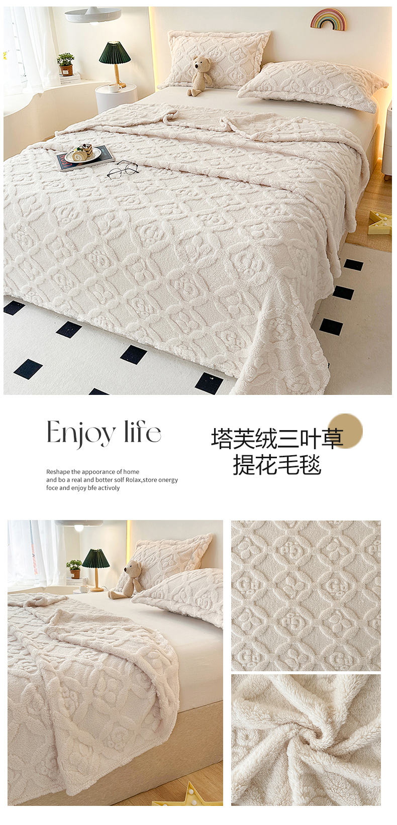 商品名称:栩裕纺织 2025新款塔芙绒三叶草提花毛毯-卷边款 咖色