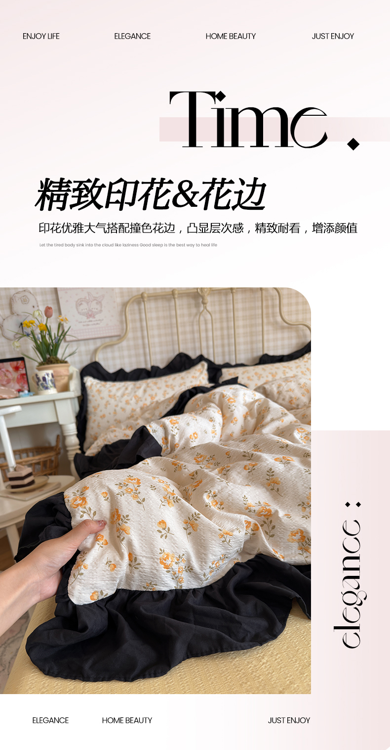 当前位置: 91家纺网 > 商品网购 > 床品套件 > 四件套 > 双层纱四件套 > 优卡迪家纺馆 2025新款皱皱棉双层纱黑花边四件套 拂晓