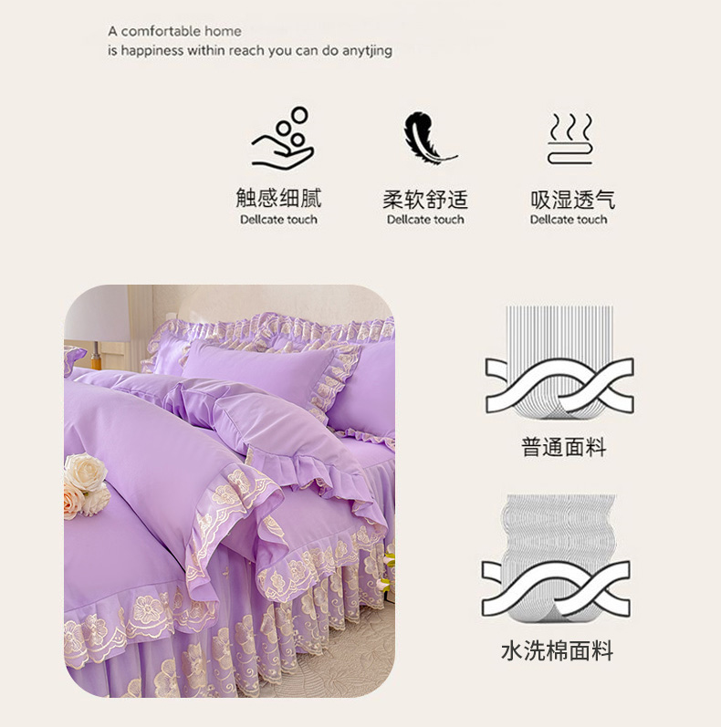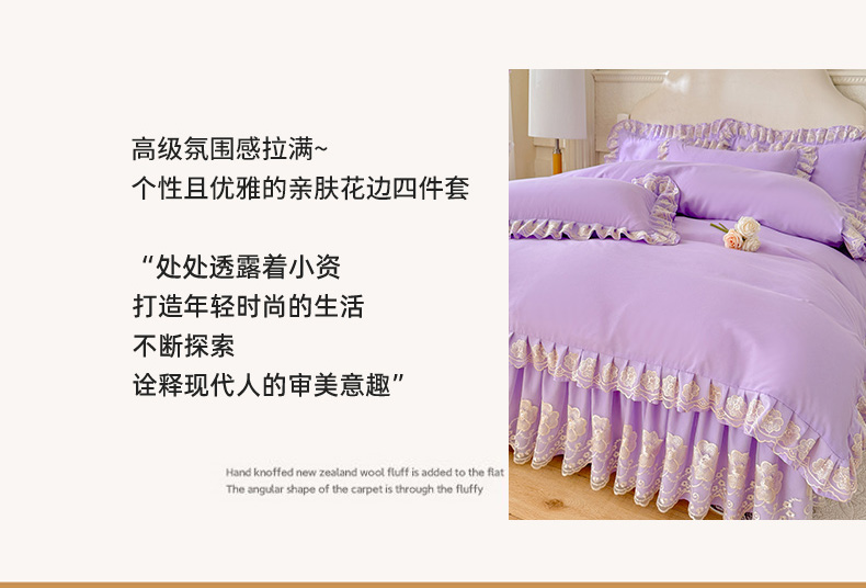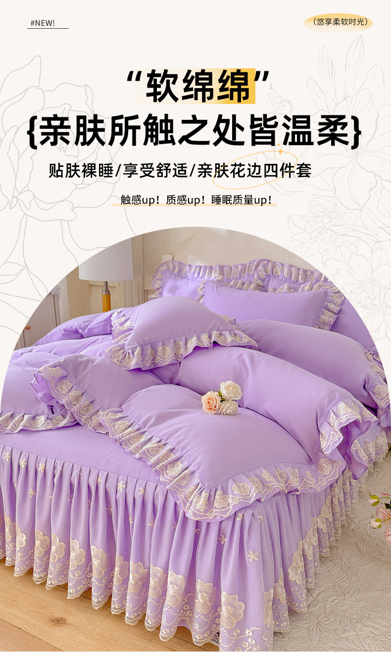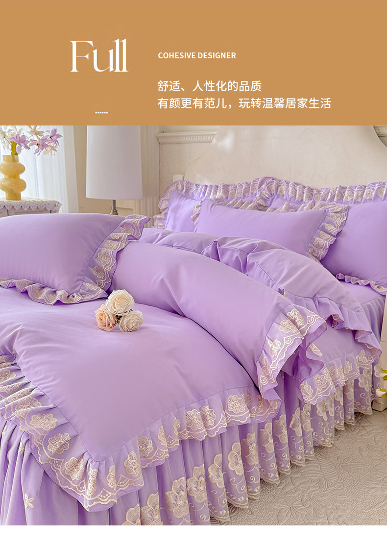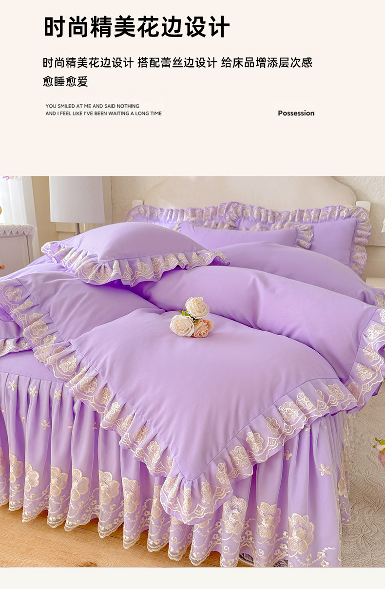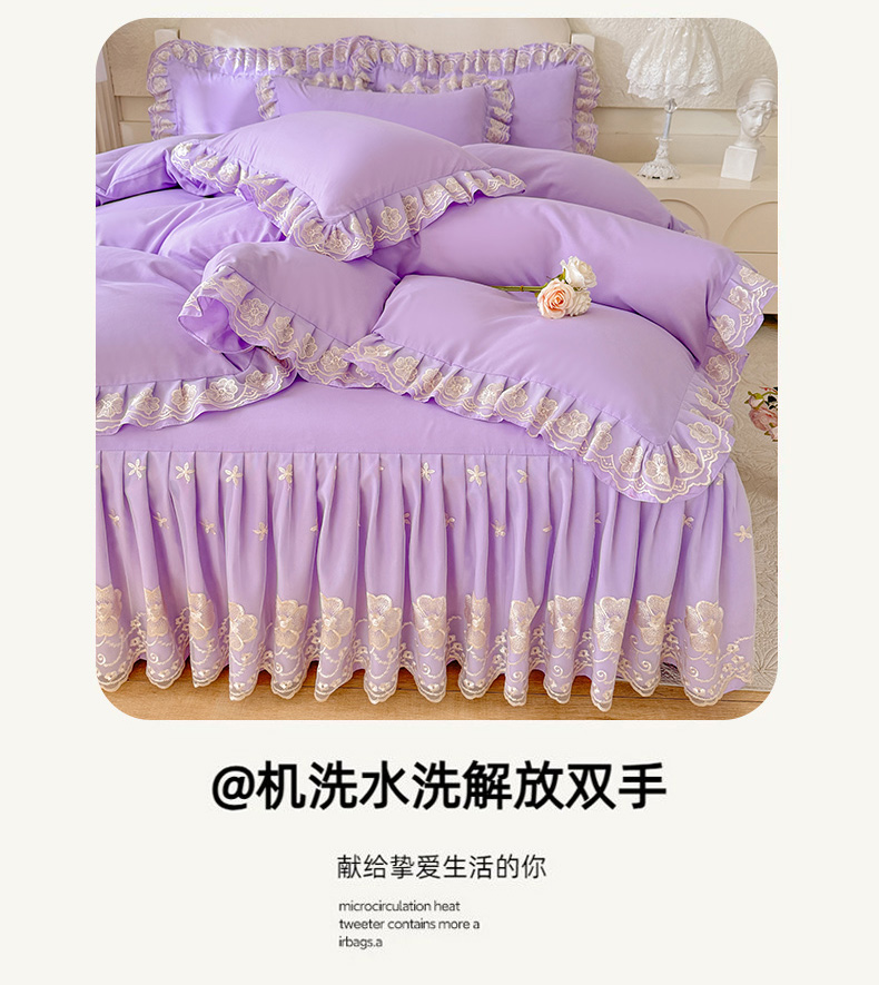 商品名称:后庭寝室 2025新款亲肤花边蕾丝床裙四件套-繁花似锦系列 繁花似锦-浅紫