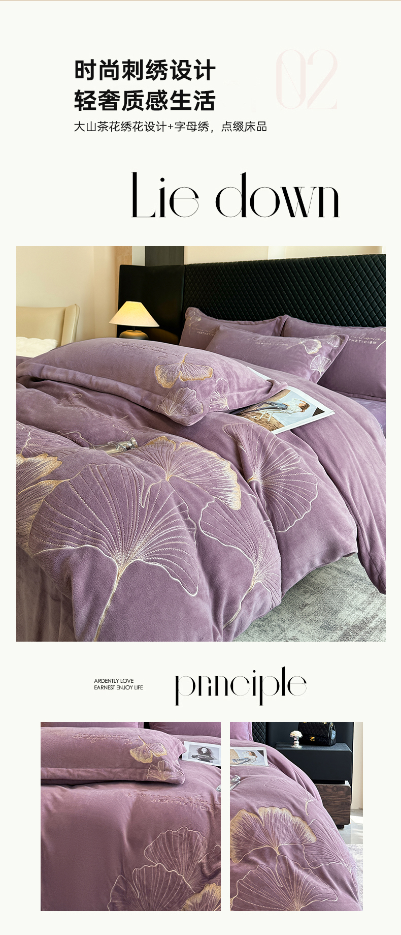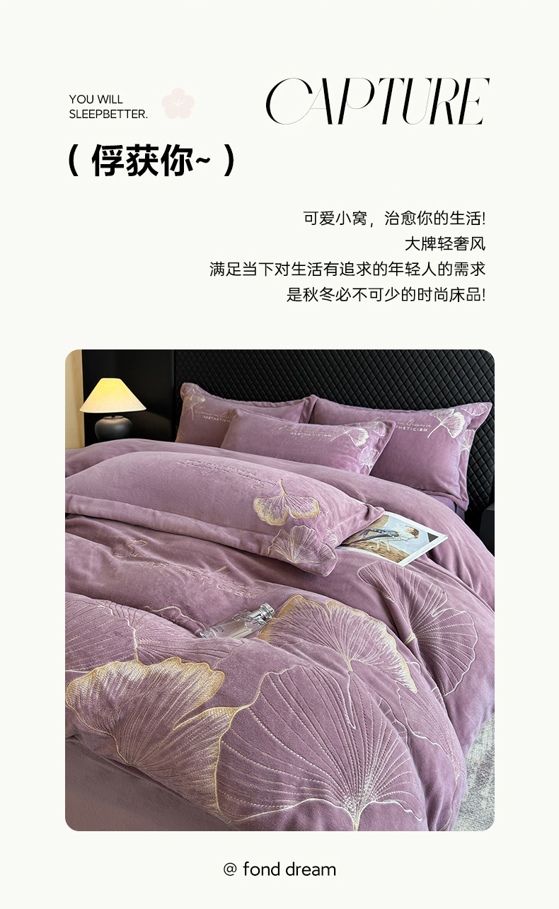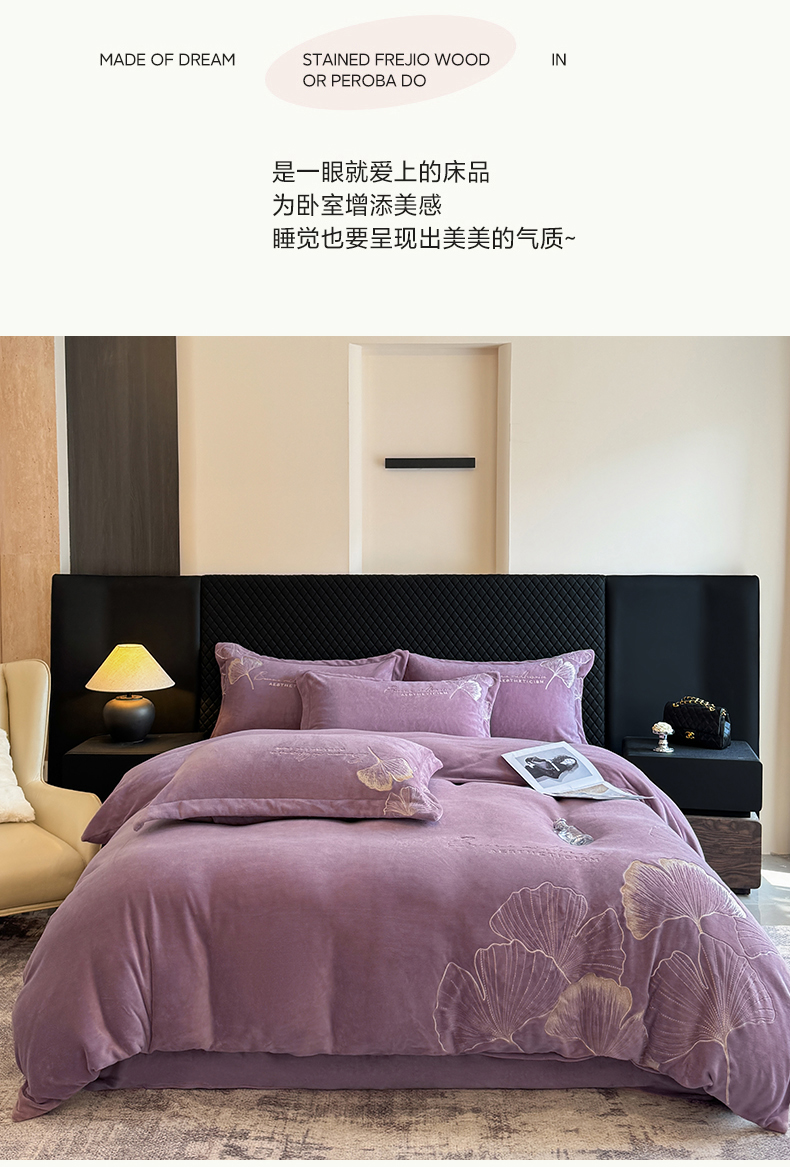 当前位置: 91家纺网 > 商品网购 > 床品套件 > 四件套 > 牛奶绒四件套 > 金牛座家纺 2025新款金牛座加厚轻奢牛奶绒刺绣四件套 杏福美满-暗紫