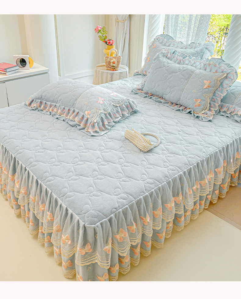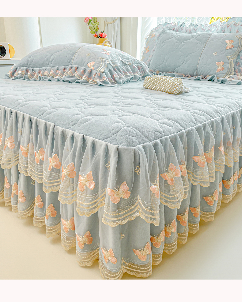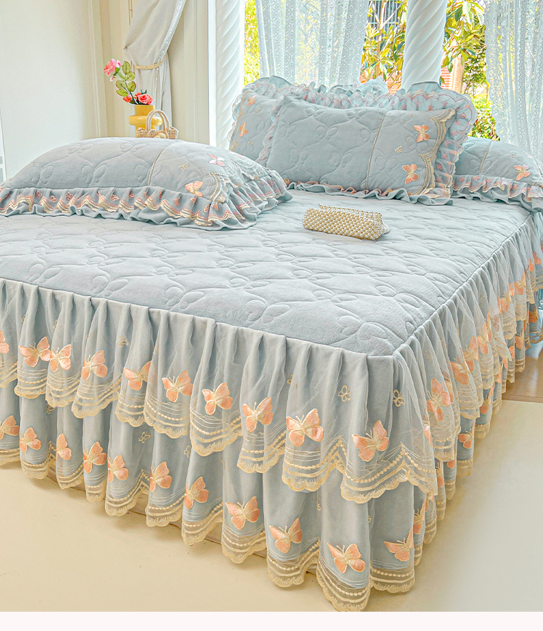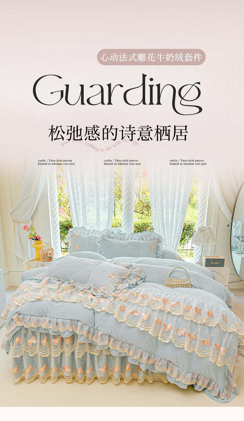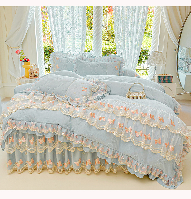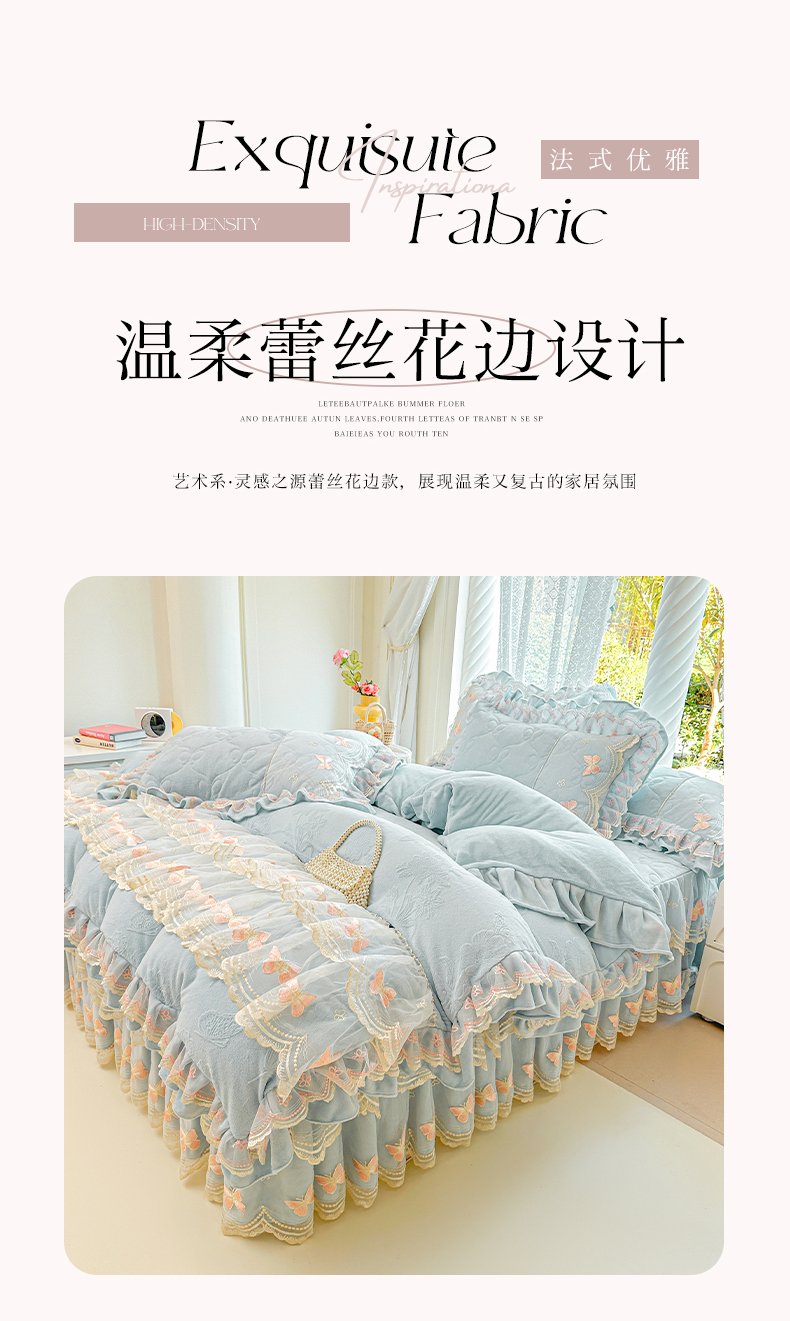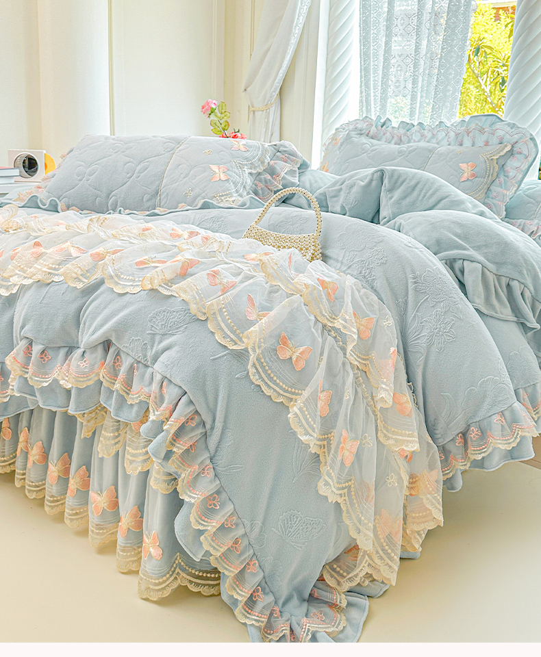 当前位置: 91家纺网 > 商品网购 > 床品套件 > 四件套 > 牛奶绒四件套 > 虹星家纺 2025新款花边牛奶绒床裙四件套系列 蝶恋-天空蓝