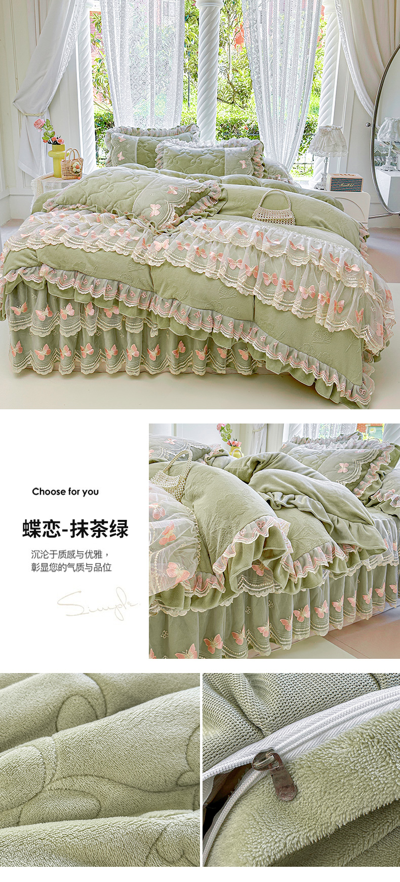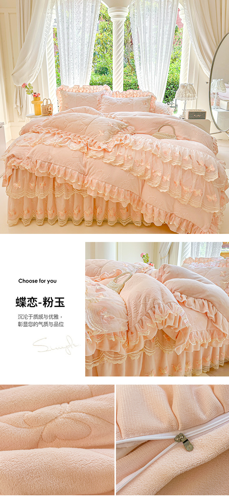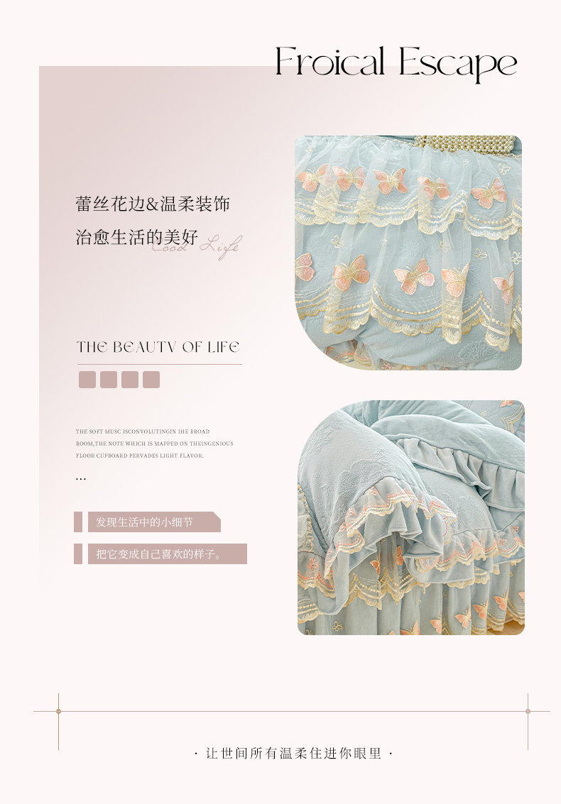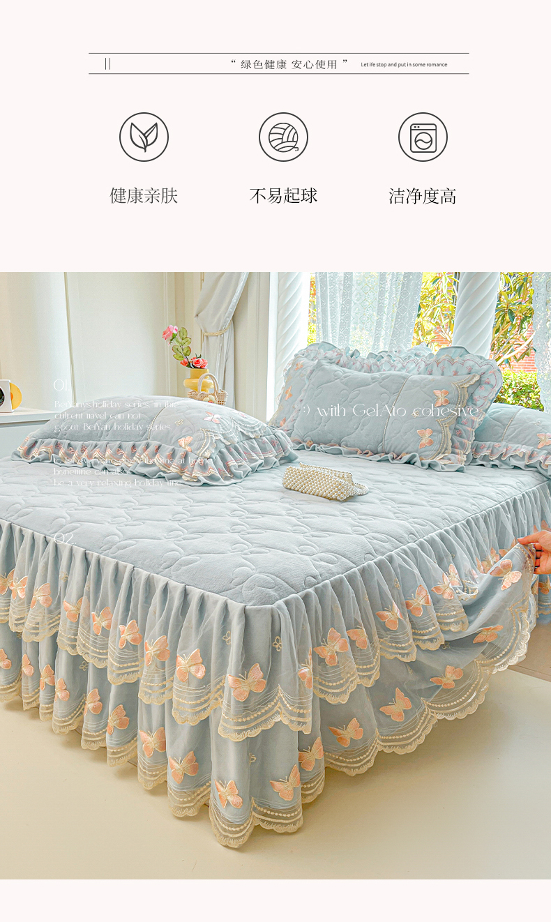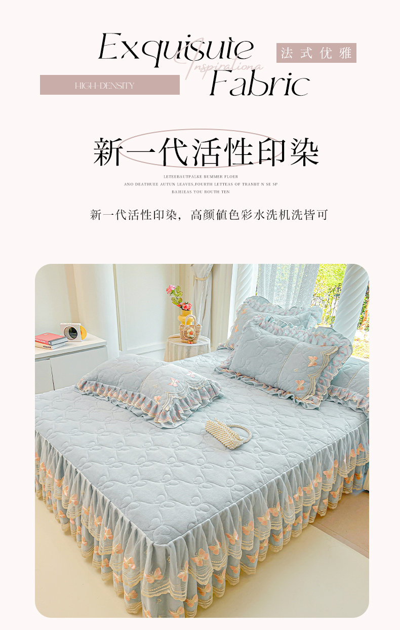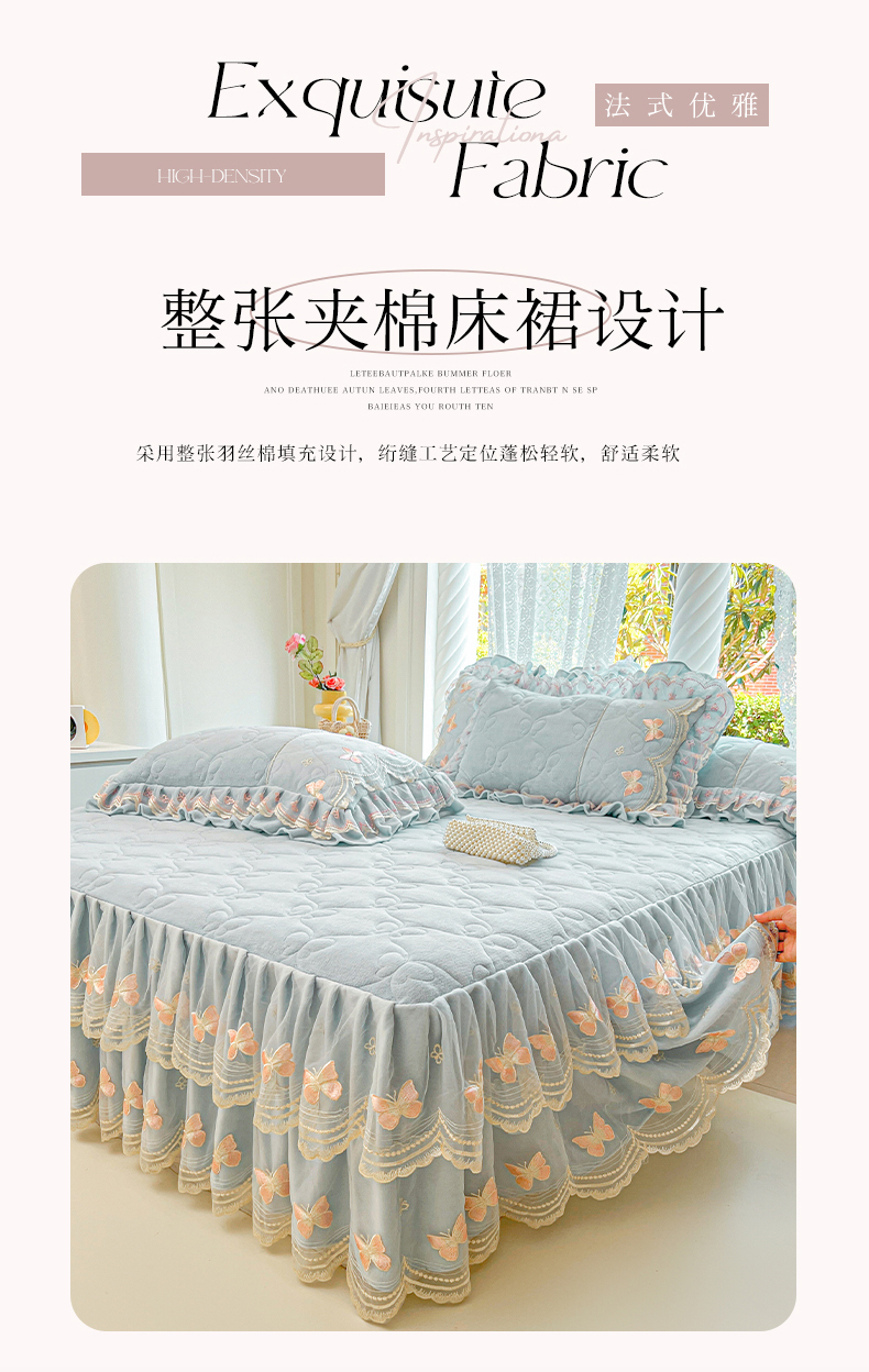 当前位置: 91家纺网 > 商品网购 > 床品套件 > 四件套 > 牛奶绒四件套 > 虹星家纺 2025新款花边牛奶绒床裙四件套系列 蝶恋-天空蓝